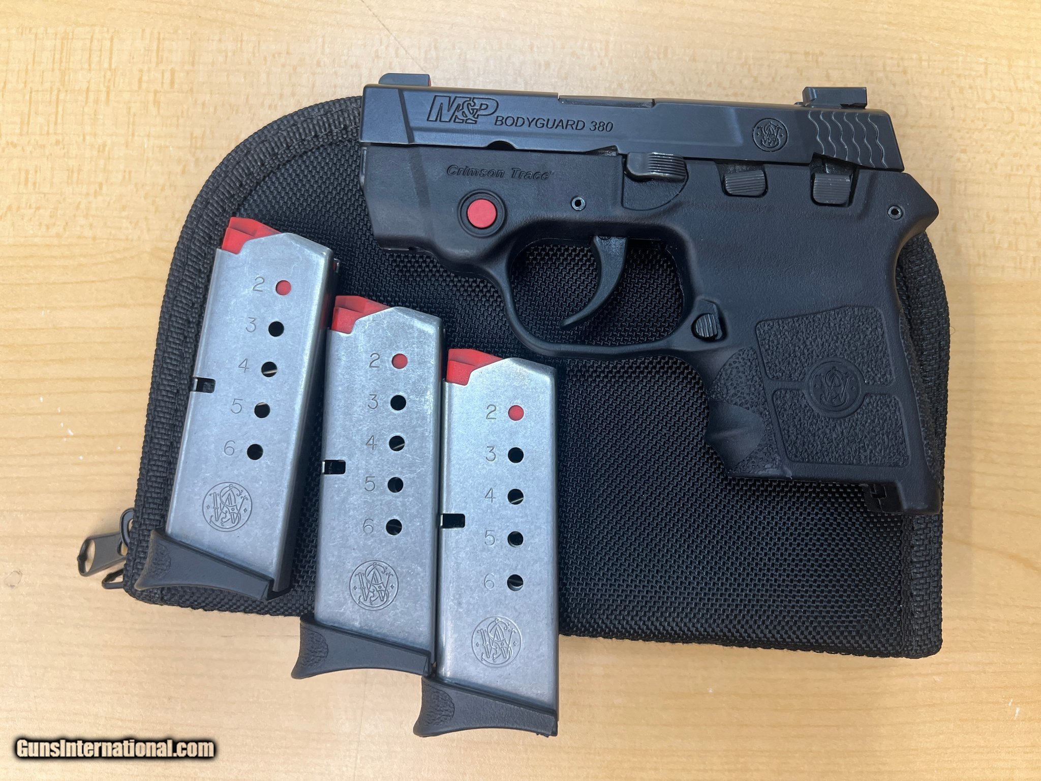 Description: Guns Listing ID: 490982 This double action carry pistol comes with three 6rd magazines, a thumb safety and a 2.75in barrel. The laser on this gun has an \"on\" setting and a \"strobe\" setting. Perfect back up gun. Original soft case and night sights included. SOLD Manufacturer: SMITH & WESSON Model: M&P BODYGUARD 380 CT Caliber Info: .380 ACP Condition: Used - Non-Certified Barrels: 2.75 BARREL Action: DOUBLE ACTION |