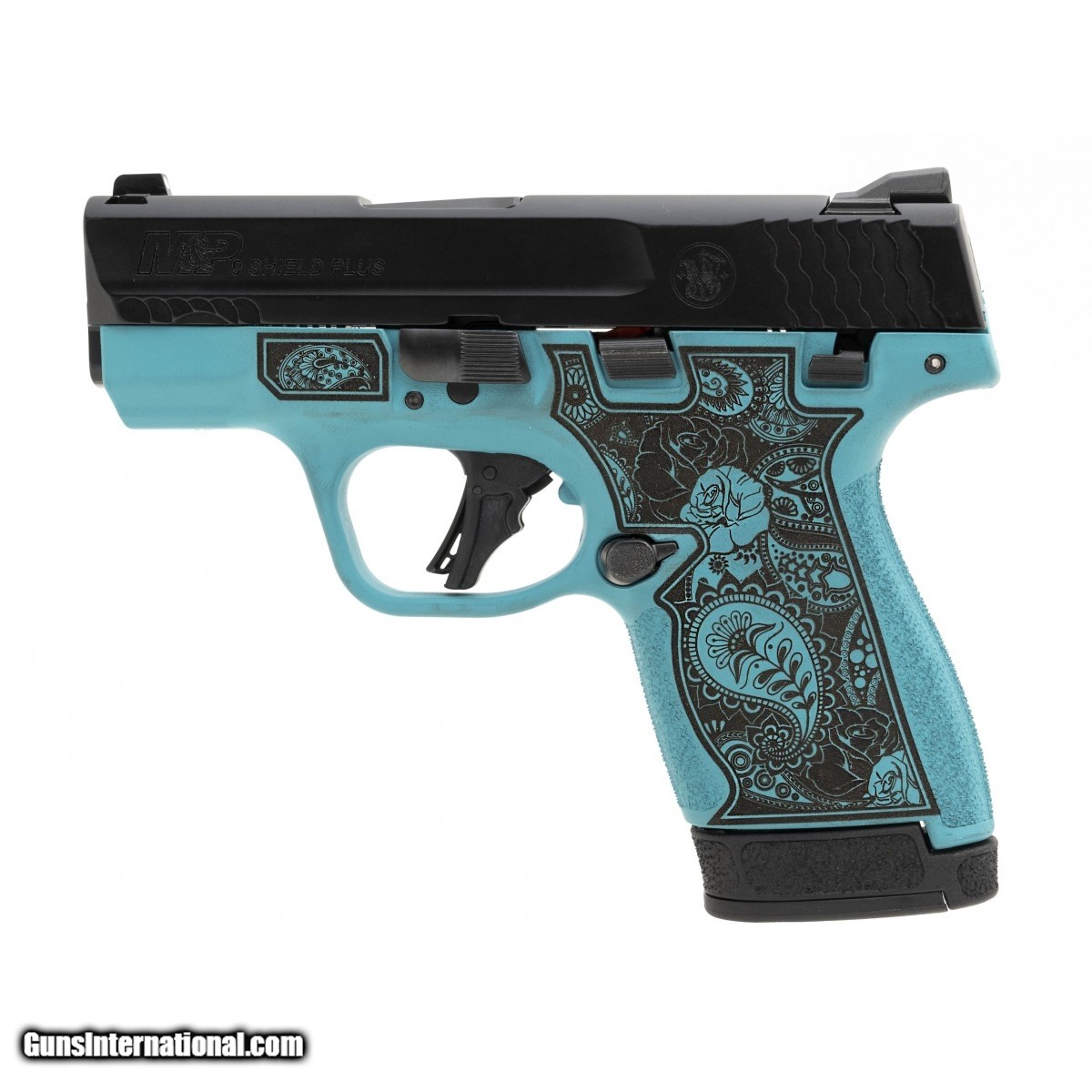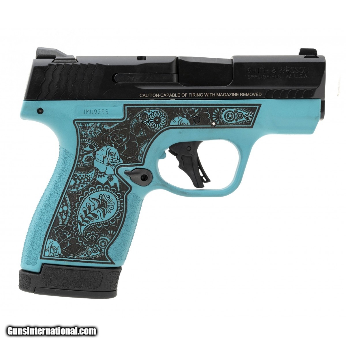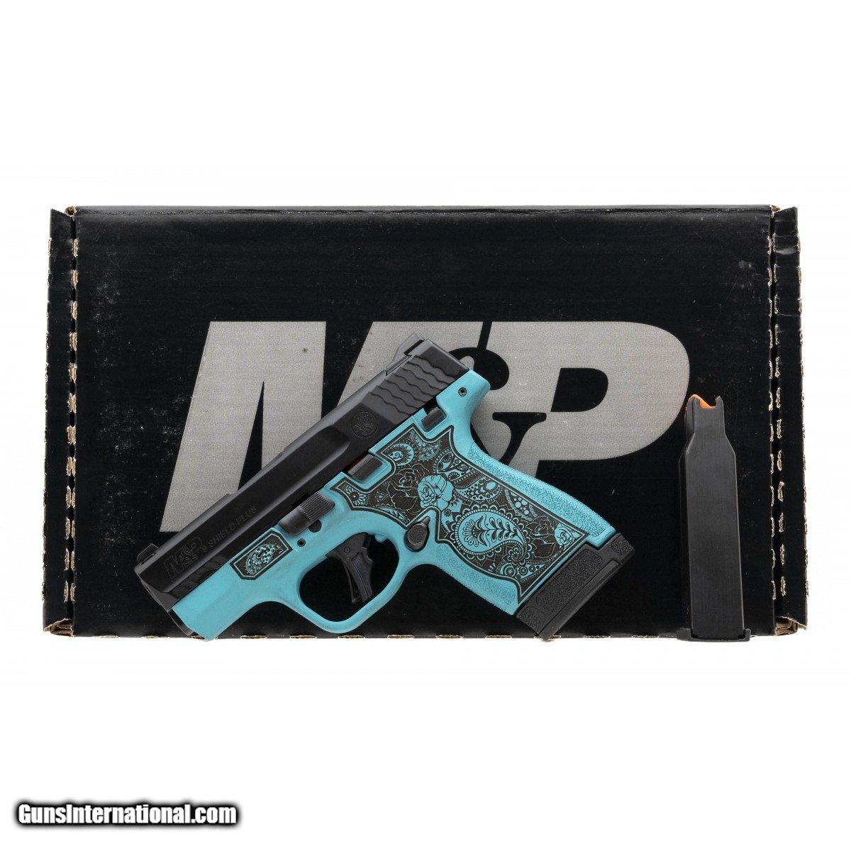 Smith & Wesson compact polymer frame carry pistol with a custom teal frame with ornate laser engravings. New. UPC:688099401641