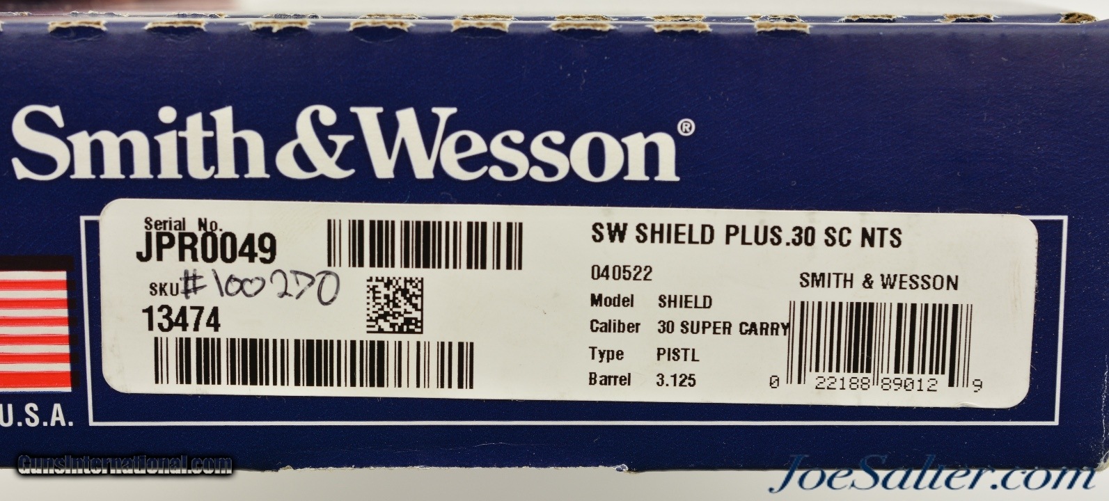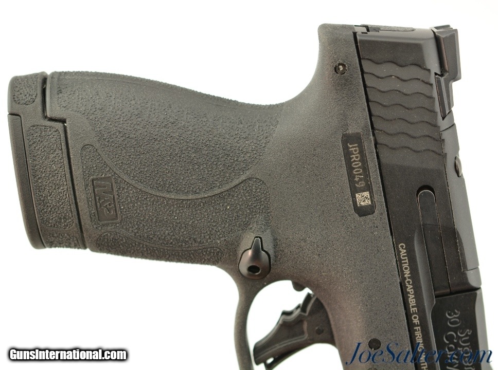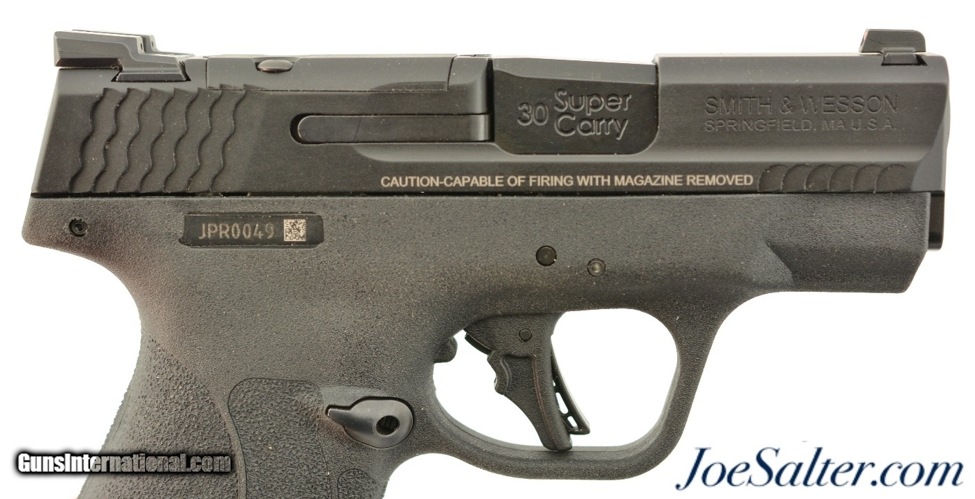 Description: Serial #JPR0049, .30 Super Carry, 3 inch barrel with a bright, excellent bore. This is the Smith & Wesson Shield Plus pistol in the highly compact .30 Super Carry cartridge allowing for small size and maximum round capacity. The pistol is in excellent plus condition retaining virtually all, 99% plus original finish on the slide and frame. Sighted with Tritium night rear sights it also comes with one 16 extended and one 13 round flush fit magazine in the original box that is numbered to the gun with lock and manual. FFL; SOLD |