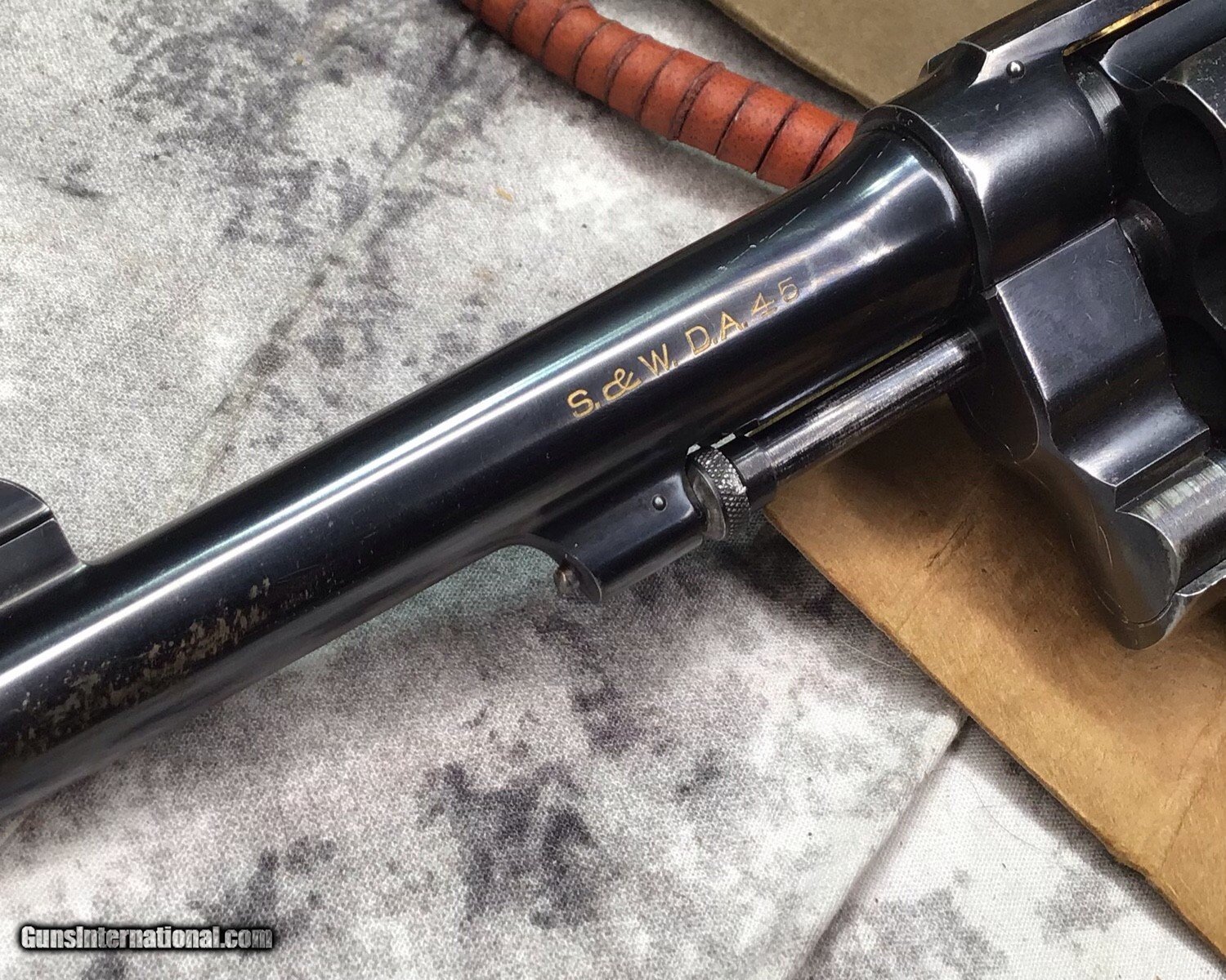 Description: The M1917 Revolvers were six-shot, .45 ACP, large frame revolvers adopted by the United States Military in 1917, to supplement the standard M1911 pistol during World War I.[1] There were two variations of the M1917, one made by Colt and the other by Smith & Wesson. They used moon-clips to hold the cartridges in position, facilitate reloading, and to aid in extraction since revolvers had been designed to eject rimmed cartridges and .45 ACP rounds were rimless for use with the magazine-fed M1911.[2] After World War I, they gained a strong following among civilian shooters.[3] A commercial rimmed cartridge, the .45 Auto Rim, was also developed, so M1917 revolvers could eject cartridge cases without using moon-clips.The Smith & Wesson Model 1917 is essentially an adaptation of the company's .44 Hand Ejector 2nd Model chambered instead in .45 ACP and employing a shortened cylinder and a lanyard ring on the butt of its frame. The S&W M1917 is distinguishable from the Colt M1917 in that the S&W cylinder has a shoulder machined into it to permit rimless .45 ACP cartridges to headspace on the case mouth (as they do in pistols). The S&W M1917 can thus be used without half-moon clips, though empty .45 ACP cases, being rimless, must be poked out manually through the cylinder face as the extractor star cannot engage them. Half moon clips provided with purchase. Holster shown is a reproduction and goes with revolver. Add 3% if paying with credit card. God Bless America from a proud American, and a Viet Nam Vet , thankful for our freedoms.. paid for by the Blood ,Sweat and Tears of our brave men and women in uniform. Ten Below Firearms is a Veteran owned and operated business. We specialize in out of production models of high quality firearms. We love to ship! If you are out of state or can't make it to our store, just give us a call! Handguns normally ship for $30 and Long guns for $40 to $55 for extra length long guns. That's 2-3 day USPS Priority shipping, Delivery conformation and with tracking number. Optional Postal insurance is additional $1.50 per $100 and highly recommended. SOLD Curio/Relic: Yes Handgun Caliber: .45 ACP (.45 Auto) Manufacturer: Smith and Wesson Model: 1917 Serial Number: S 2879 Condition: Very good Metal Condition: Very good Wood Condition: Very good Bore Condition: Very good |