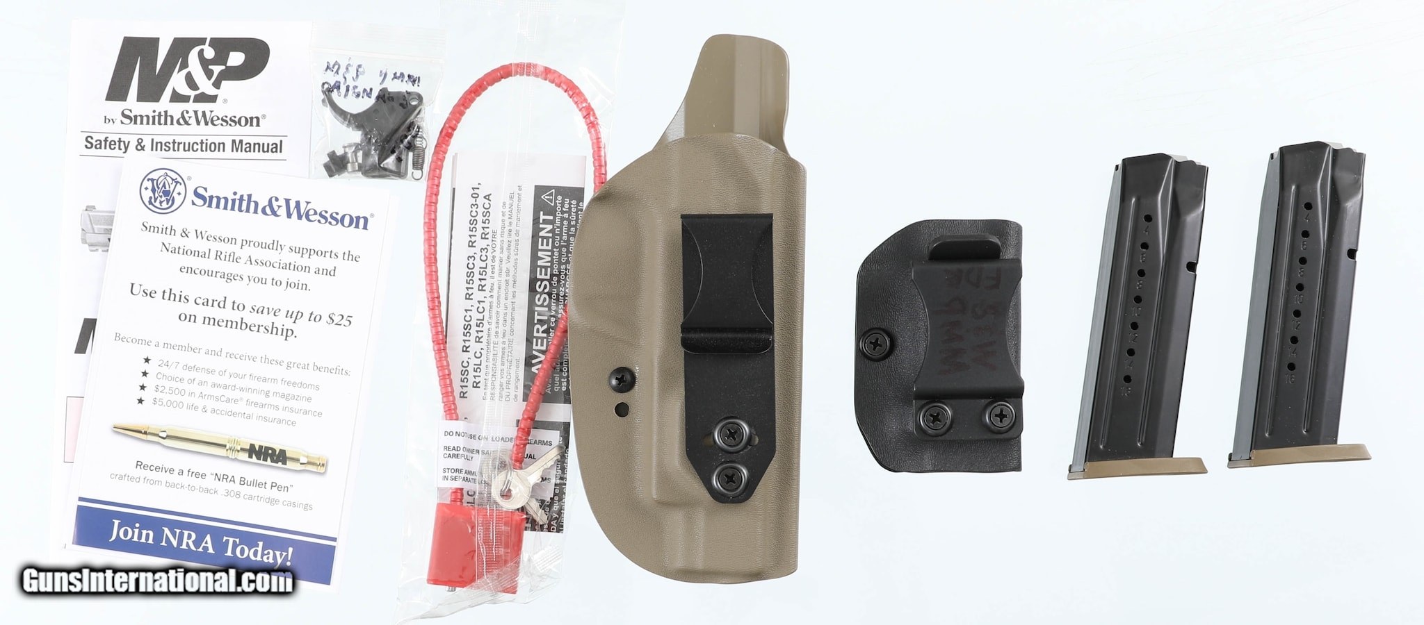 Description: Guns Listing ID: 854035 MAKE - SMITH & WESSON MODEL - M&P 2.0 FINISH - FDE BARREL - 5\" CALIBER - 9 MM CAPACITY - 17 GRIPS - POLYMER CONDITION - EXCELLENT FEATURES - COMES WITH ORIGINAL BOX, PAPERS, (3) EXTRA MAGS, BACKSTRAPS, IWB/RH HOLSTER, MAG HOLSTER, CABLE LOCK, & ORIGINAL PARTS SOLD Manufacturer: SMITH & WESSON Model: M&P 2.0 FDE FULL SIZE W/ APEX TRIGGER, NIGHT SIGHTS, HOLSTER, & EXTRA MAGS Caliber Info: 9 MM (9X19 PARA) Condition: Used - Non-Certified Barrels: 5 BARREL Finish: FDE |
