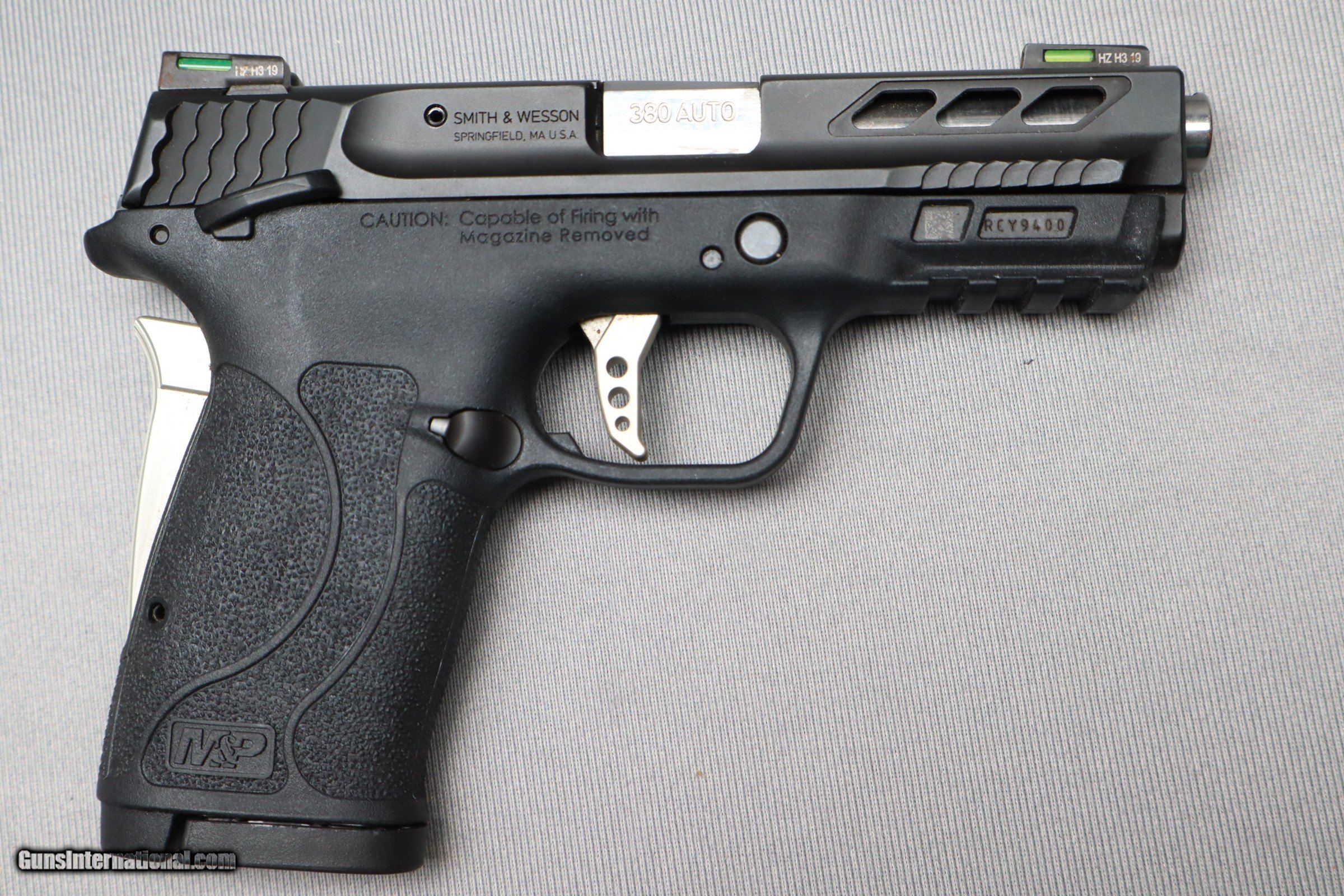 Description: This Smith & Wesson M&P 380 Shield EZ Performance Center is a right handed, striker fired, polymer framed, semiautomatic pistol chambered in .380 Auto. This pistol is equipped with a manual thumb safety, a grip safety, and a compensated barrel. .380 ACP SOLD Chambers: .380 Auto Metal Condition: Good Bore Condition: Good Barrels: 3 3/4" W/ Compensator Weight: 1.15 lbs Sights: Fiber Optic Iron Sights Item Location: Missoula, MT |
