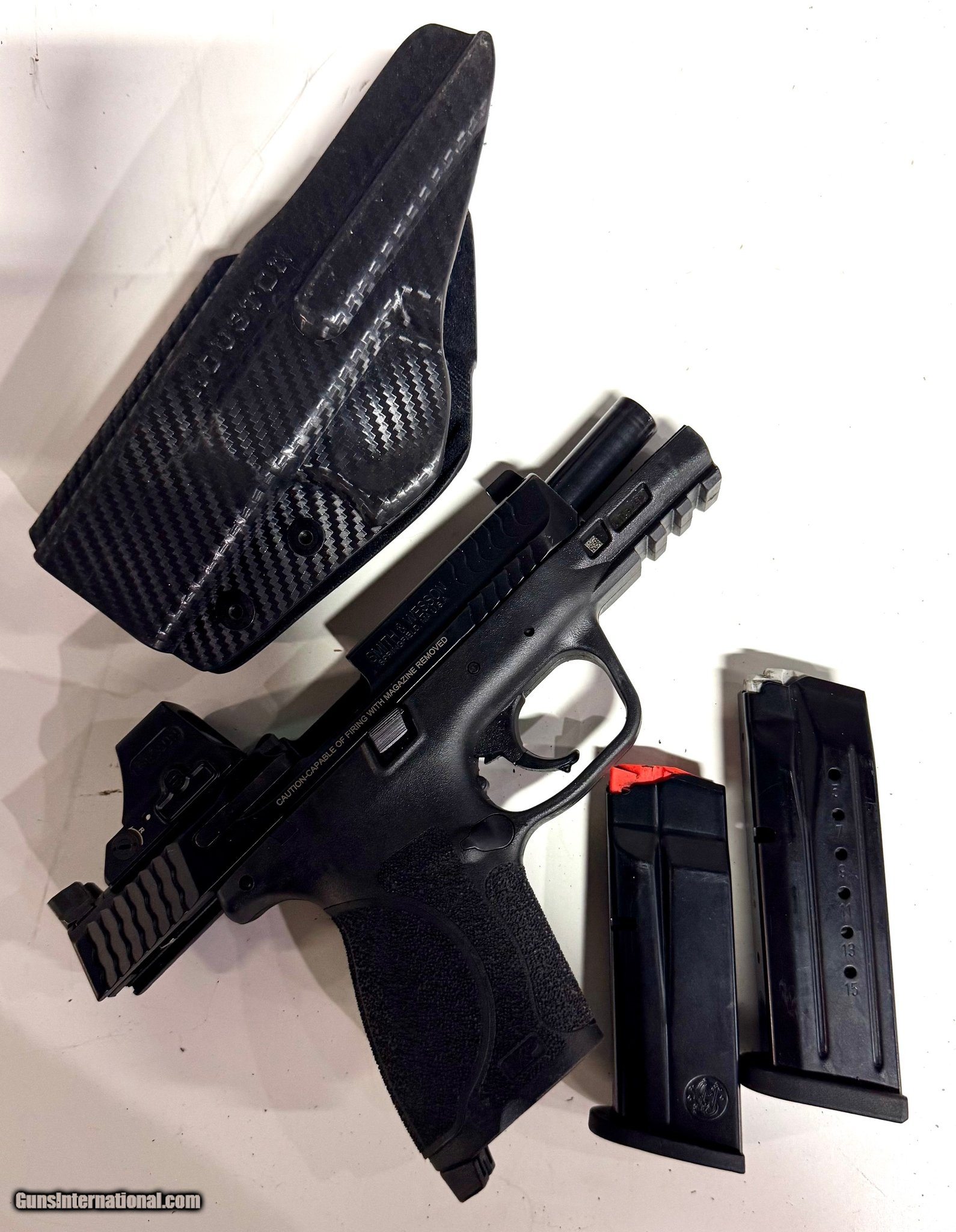 Description: Guns Listing ID: 527695 Smith and Wesson M&P 9 2.0 with Holosun and 2 mags, Carbon fiber Holster and box. Excellent condition The Smith & Wesson® M&P® M2.0™ Semi-Auto Pistol is the successor to the M&P striker-fired, polymer pistol platform used by countless law enforcement agencies and civilians alike for personal defense sidearms. The polymer frame of the M&P M2.0 utilizes a rigid, extended stainless steel chassis embedded to frame reduce flex and torque when firing. A new aggressive texture keeps hand in place, and the original M&P 18-degree grip angle points instinctively on target. The M2.0 trigger has a light crisp pull and a tactile and audible reset; and a sear deactivation lever allows the weapon to be disassembled without pulling the trigger first. A high grip-to-barrel bore axis reduces muzzle flip to sustain accurate shot placement during rapid fire. The Smith & Wesson M&P M2.0 Semi-Auto Pistol has a stainless steel slide and barrel, finished with non-reflective, corrosion-resistant Armornite®. An integral Picatinny rail provides for the attachment of aftermarket tactical accessories. The M&P M2.0 comes with 2 magazines. Striker-fired, modular polymer platform Extended stainless steel chassis Optimal 18-degree grip angle M2.0 trigger Integral Picatinny rail Stainless steel slide and barrel Armornite corrosion-resistant finish Comes with 2 magazines NO CALIFORNIA SALES SOLD Manufacturer: SMITH & WESSON Model: M & P 9 M2.0 Caliber Info: 9MM LUGER (9x19 PARA) Condition: Used - Non-Certified Barrels: 4.25 Action: SEMI AUTOMATIC Finish: black blued |