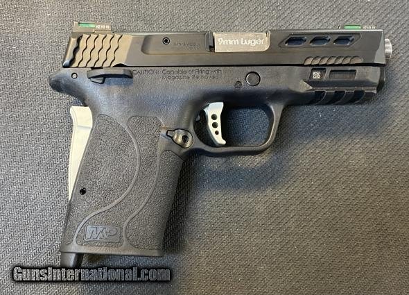 Description: Guns Listing ID: 697126 UPC 022188884029 ID 4503737 :: Category Handguns > Semi-Automatic Manufacturer Smith & Wesson Model 13225 Caliber 9MM The S&W Performance Center M&P 9 Sheild EZ pistol features a ported, high-bright finished barrel to reduce muzzle flip. Its easy to rack slide utilizes lightening cuts in the slide for reduced weight, while the Tactile loaded chamber indicator (TLCI) lets you see and feel if there is a round in the chamber. The PC flat face, silver anodized aluminum trigger is crisp, lightweight and comes with tactile and audible trigger reset. The Performance Center M&P 9 Shield EZ pistol also features a PC enhanced silver anodized aluminum grip safety, HI-VIZ Litewave H3 Tritium/Litepipe sights, and picatinny-style rail. It comes with two easy-to-load, 8-round magazines. Included with the 9mm M&P Shield is a Performance Center cleaning kit which features a collapsible cleaning rod with rotating t-handle, 10 cotton cleaning patches, nylon cleaning brush, bronze bore brushes, and nylon jags. Brand: Smith & Wesson Model: M&P Shield EZ M2.0 Performance Center Caliber: 9mm Luger Capacity: 8+1 Action: Internal Hammer Fired Frame Finish: Matte Black OAL: 7\" Frame Material: Polymer Sight Style: Adjustable Slide Finish: Black Armornite Slide Material: Stainless Steel Slide Description: Serrated Black Armornite Stainless Steel with Ports Grips: Black Polymer Sight Configuration: HiViz Litewave H3 Fiber Optic Includes: 2 Magazines, Cleaning Kit Safety: Manual Thumb, Grip Barrel Description: Silver Accent, Ported, Stainless Steel Barrel Length: 3.83\ SOLD Manufacturer: SMITH & WESSON Model: M&P 9 SHIELD EZ MTS Caliber Info: 9MM LUGER (9X19 PARA) Condition: Used - Non-Certified Barrels: 3.83 BARREL Finish: BLACK |