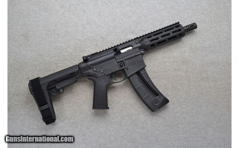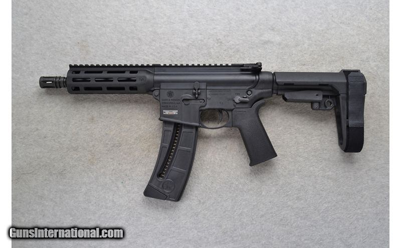 Description: This Smith & Wesson Model M&P15-22P is a right hand semi-auto pistol in .22 Long Rifle Cal. It has an 8 inch barrel plus a muzzle device. No sights are present but it has a top Picatinny rail. It has an adjustable/telescoping butt stock with a wrist strap. A textured black polymer full pistol grip. The forearm is a vented black polymer tube. .22 Long Rifle SOLD Chambers: 25 round detachable magazine. Metal Condition: Excellent. Bore Condition: Excellent. Barrels: 8 inch barrel plus a muzzle device. Stock Dimensions: LOP 12 1/2 inches full open. Fore End: Vented black polymer tube. Butt Pad: Black rubber with a wrist strap. Weight: 3 lb. 10 oz. Sights: No sights present. Top Picatinny rail. Item Location: Richfield, WI |