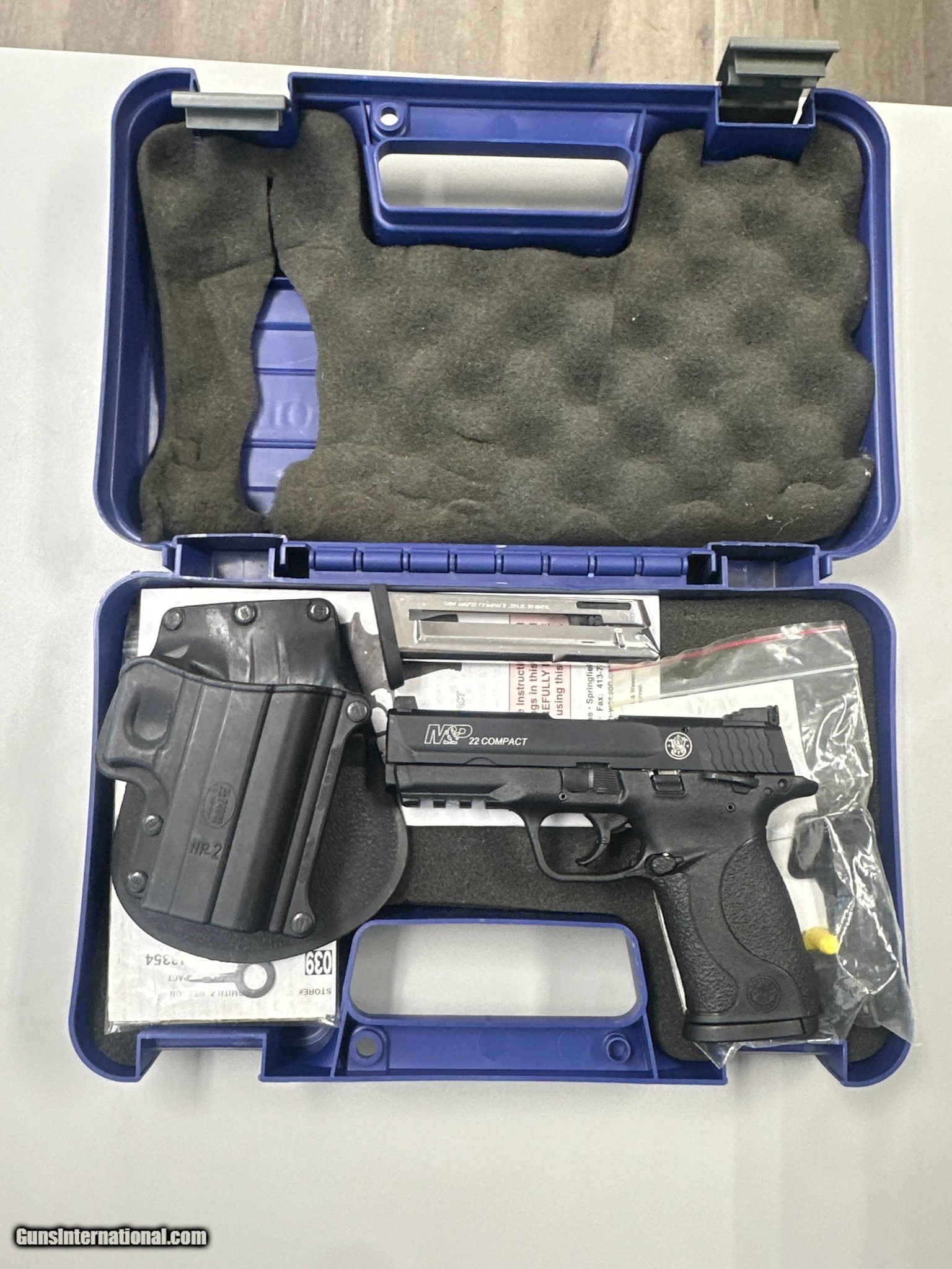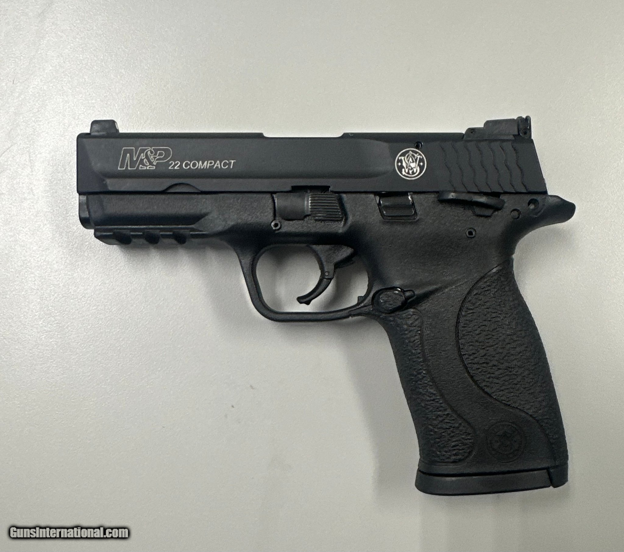 Description: Guns Listing ID: 1268342 MANUFACTURER: Smith and Wesson FAMILY: M&P Series MODEL: M&P22 Compact TYPE: Semi-Auto Pistol ACTION: Single Action CALIBER/GAUGE: 22 LR FINISH: Black FRAME: Polymer Frame STOCK/GRIPS: Black Polymer BARREL: 3.56\" OVERALL LENGTH: 6.65\" CAPACITY: 10+1 # OF MAGAZINES: 2 MAG DESCRIPTION: 10+1 SIGHTS: Adjustable SAFETY FEATURES: Ambidextrous Manual Safety ADDL INFO: Picatinny-Style Accessory Rail UPC: 022188083903 SOLD Manufacturer: SMITH & WESSON Model: M&P22 COMPACT Caliber Info: .22 LR Condition: Used - Non-Certified Barrels: 3.5 BARREL |