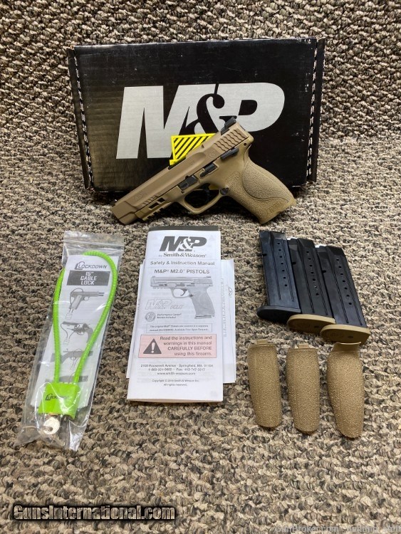 Description: Guns Listing ID: 1196493 This listing is for a USED Smith & Wesson M&P 9 M2.0 9mm FDE Finish 4 Grips 3 Magazines 5\" BBL 17+1. This is a used gun, it has been fired and will have residue present. This Smith & Wesson M&P 9 M2.0 is chambered in 9mm, and it will hold 17 rounds in the magazine. This pistol comes with a 5 inch barrel. It comes equipped with a fixed front sight, and a fixed rear sight. This pistol comes installed with a ML size grip. It also comes with an extra L, M, and S size grip. Other than some scratches on the extractor, this pistol appears to be in great condition. The action appears to be in good condition, the finish appears to be in good condition, and the bore appears to be in good condition. This pistol comes with two 17 round factory magazines, one 17 round ProMag magazine, extra grips, an owner’s manual, a cable lock, and the cardboard box. This would be a great duty pistol. ** DISCLAIMER** THIS FIREARM HAS NOT BEEN TEST FIRED*** SOLD Manufacturer: SMITH & WESSON Model: M&P9 2.0 FDE Caliber Info: 9MM LUGER (9X19 PARA) Condition: Used - Non-Certified Barrels: 5 BARREL Finish: TAN |