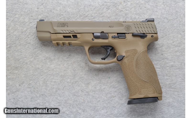 Description: This Smith & Wesson Model M&P9 M2.0 is a Flat Dark Earth color right hand semi-auto pistol in 9mm Cal. It has a 5 inch barrel with a front and rear serrated slide. A blade front and notch rear sight with 3 white dots. The grip is a textured polymer with interchangeable backstraps. It has a lower accessory rail. SOLD Caliber Info: 9mm Chambers: Semi-Auto 17 round magazine. Metal Condition: Excellent with a couple of very minor handling marks. Wood Condition: Grips are in excellent condition. Bore Condition: Excellent. Barrels: 5 inch barrel with a front and rear serrated Flat Dark Earth slide. Stock: Textured Flat Dark Earth polymer with interchangeable backstraps. Weight: 30 oz. Sights: Blade front. Notch rear. 3 white dots. Extras: Comes in a S&W box with three 17 round magazines and 3 extra interchangeable backstraps. Item Location: Richfield, WI |