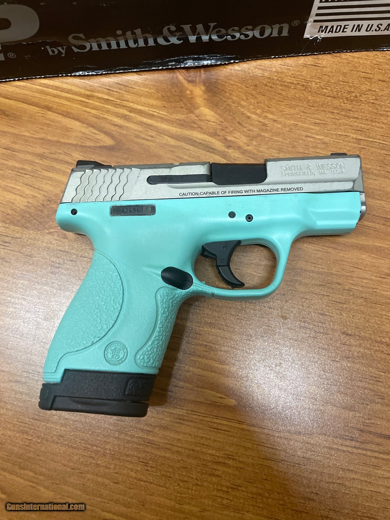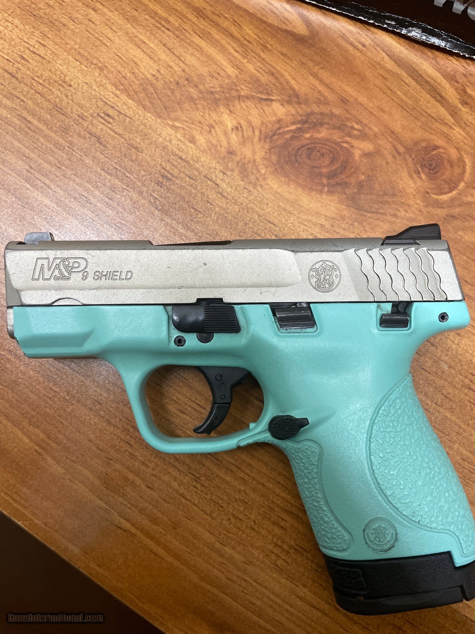 Description: Guns Listing ID: 477055 Good shape overall Has wear and tear marks on slide 1-8rnd mag Original box Thump flip up safety SOLD Manufacturer: SMITH & WESSON Model: M&P9 SHIELD Caliber Info: 9MM LUGER (9x19 PARA) Condition: Used - Non-Certified Barrels: 3 Finish: ROBIN‚‚S EGG BLU |
