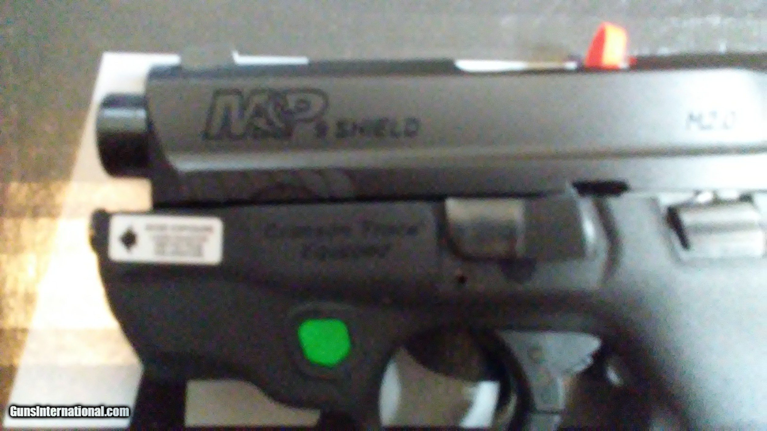 Description: Smith & Wesson S&W Shield M2.0 M&P9 9mm w/CTC Green Laser #11901 NEW Integrated Crimson Trace Green Laser This is a brand new in box Smith & Wesson Shield M2.0 M&P9, 9 mm semi-auto pistol, comes with 2 mags, Crimson Trace Integrated Green Laser (2 #357 Silver Oxide Batteries), Fixed 3-dot sights. NO sale to California.