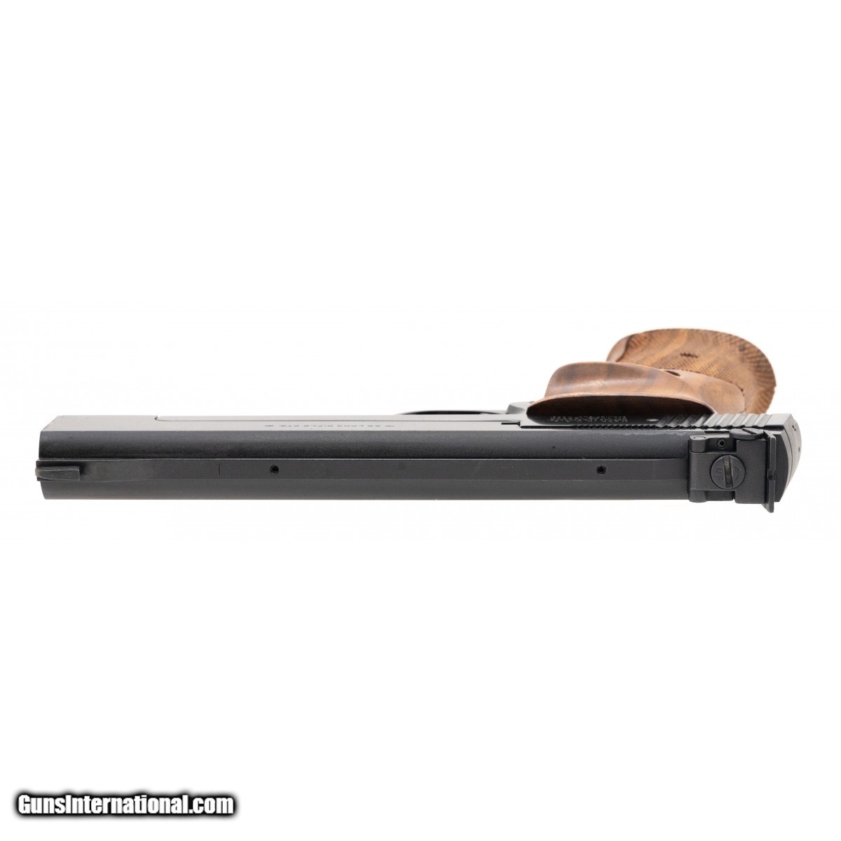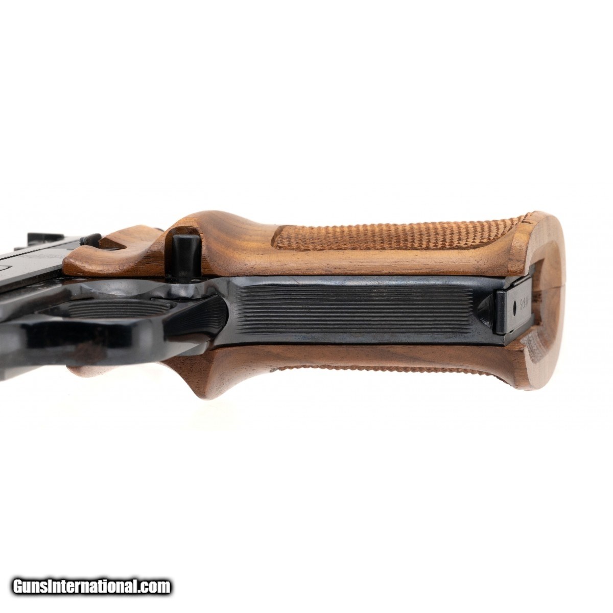 SN:90335, Manufactured circa 1960, .22 long rifle with a 5.5"" barrel. Bore is in excellent condition. Semi-auto target pistol with wooden grips and adjustable rear sight. Has the scarce extendable front sight option. Overall condition is very good. Comes with box and extra magazine. (Consignment)