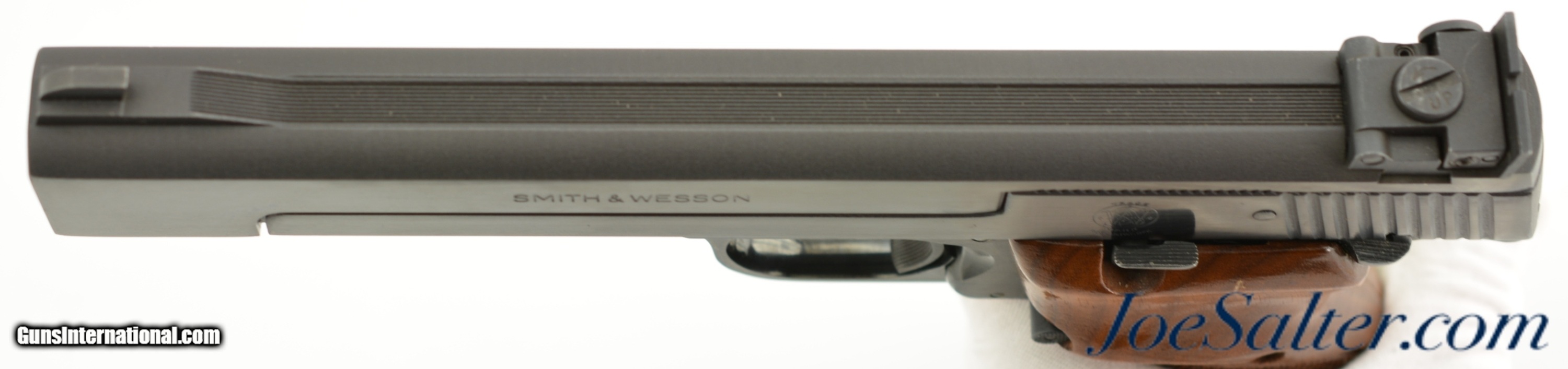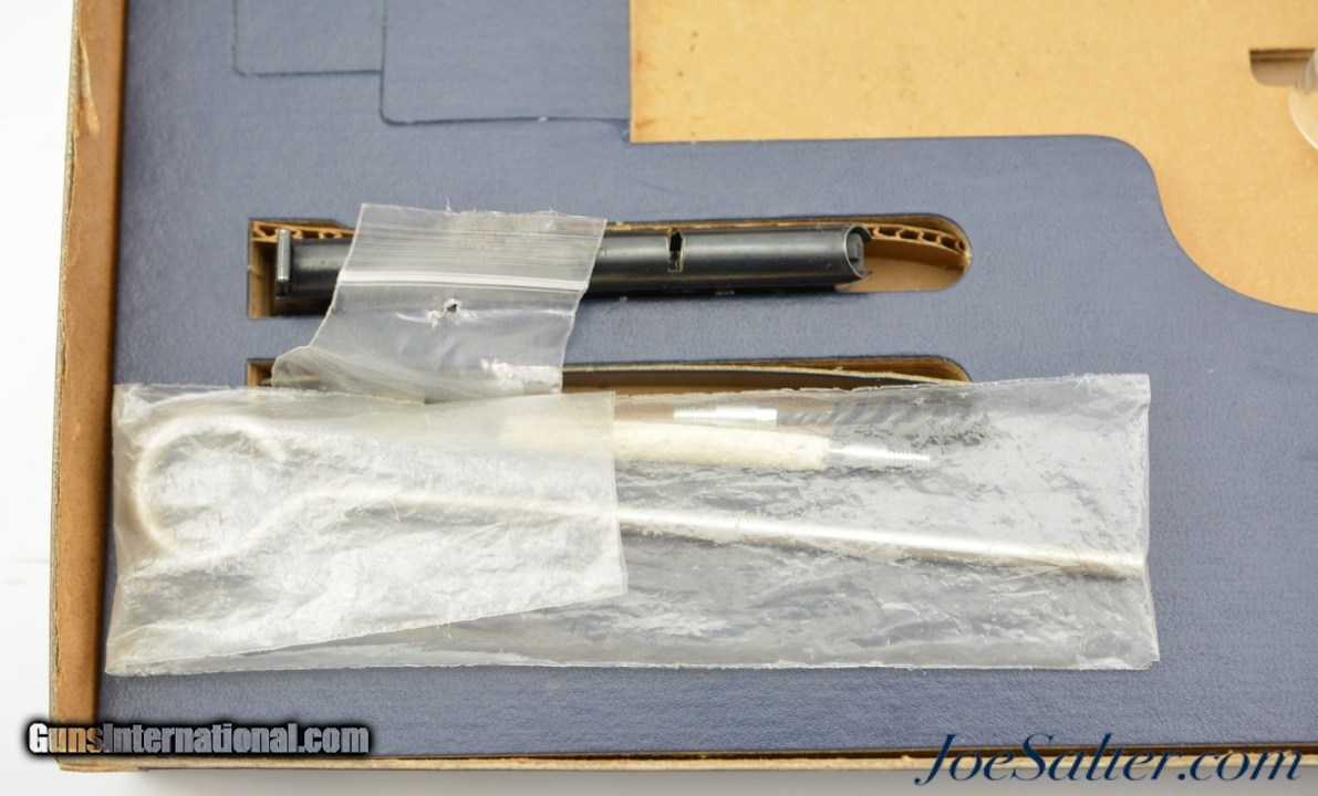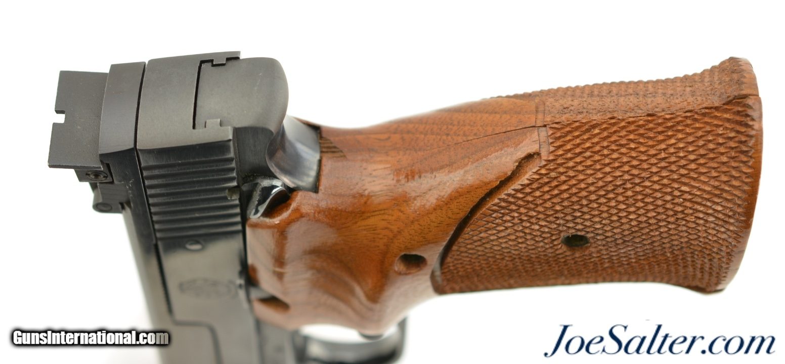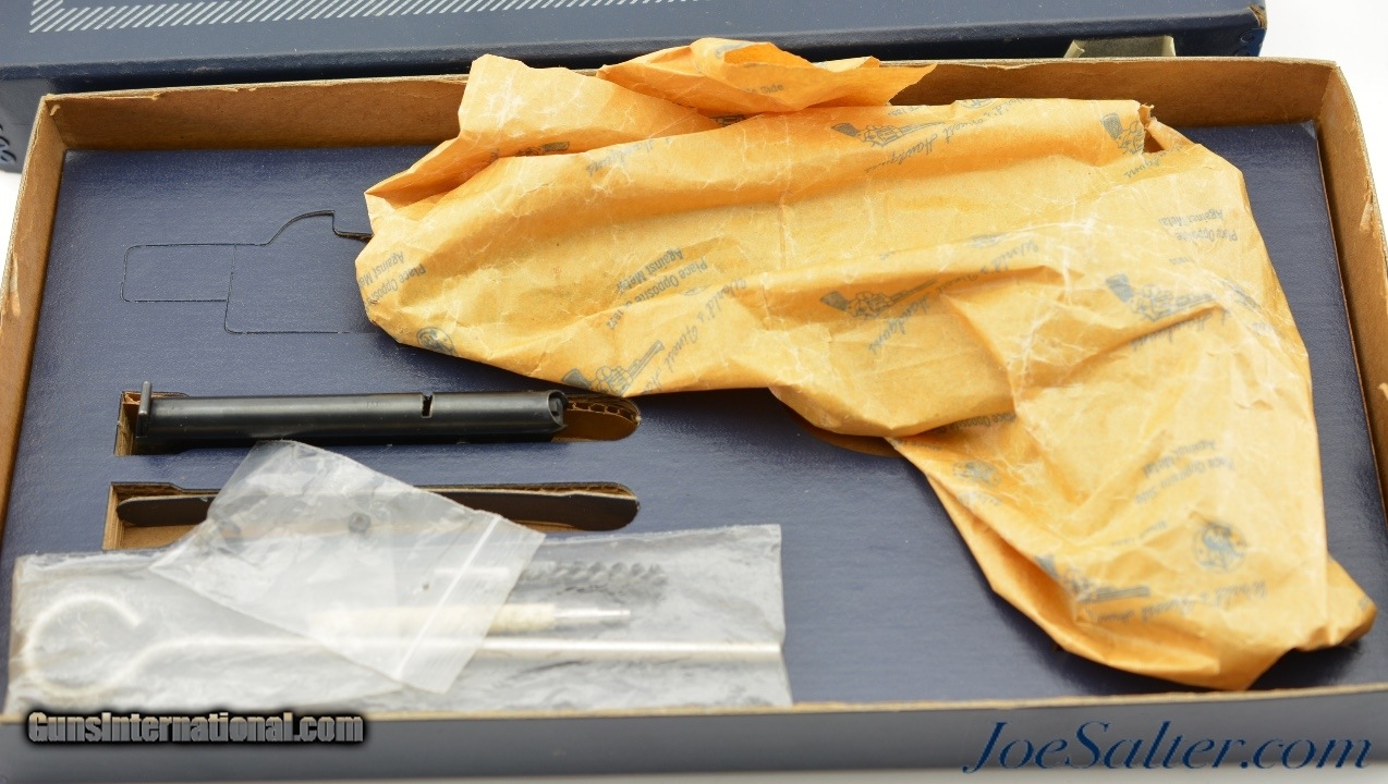 Description: Serial #A582087, .22 LR, 5.5 inch barrel with a bright, excellent bore. This is the Smith & Wesson Model 41 target semi-automatic pistol manufactured in 1979. In excellent plus condition the barrel and frame retain virtually all, 98-99% original blue and matte finish on the barrel and frame with some very minor handling and use marks. The walnut grips are likewise excellent with crisp checkering and what appears to be a factory blemish on the right thumb rest. It is sighted with an adjustable rear and blade front target sights. It comes in the original blue Bangor Punta box with two factory original S&W 10 round magazines and cleaning tools. An excellent desirable Smith & Wesson target pistol. FFL SOLD |