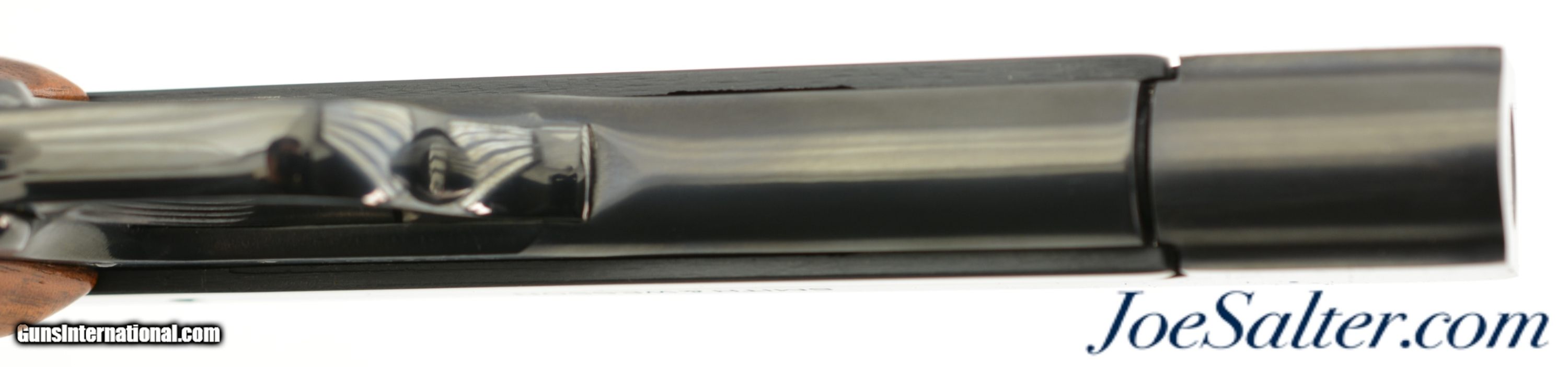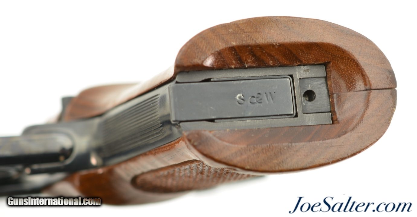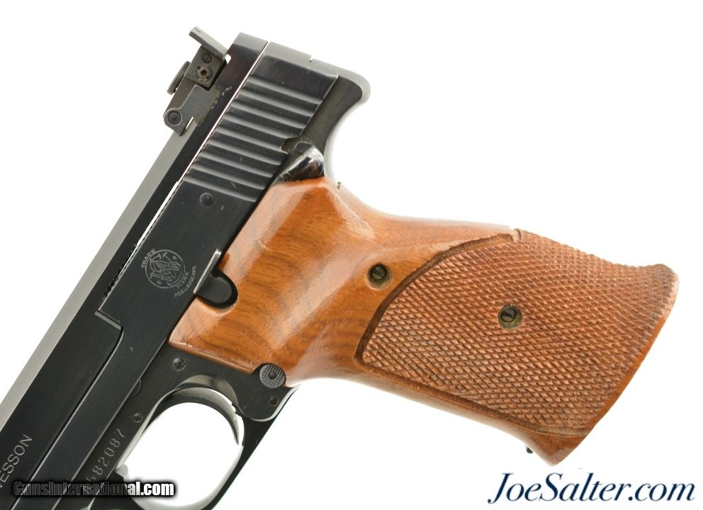 Description: Serial #A582087, .22 LR, 5.5 inch barrel with a bright, excellent bore. This is the Smith & Wesson Model 41 target semi-automatic pistol manufactured in 1979. In excellent plus condition the barrel and frame retain virtually all, 98-99% original blue and matte finish on the barrel and frame with some very minor handling and use marks. The walnut grips are likewise excellent with crisp checkering and what appears to be a factory blemish on the right thumb rest. It is sighted with an adjustable rear and blade front target sights. It comes in the original blue Bangor Punta box with two factory original S&W 10 round magazines and cleaning tools. An excellent desirable Smith & Wesson target pistol. FFL SOLD |