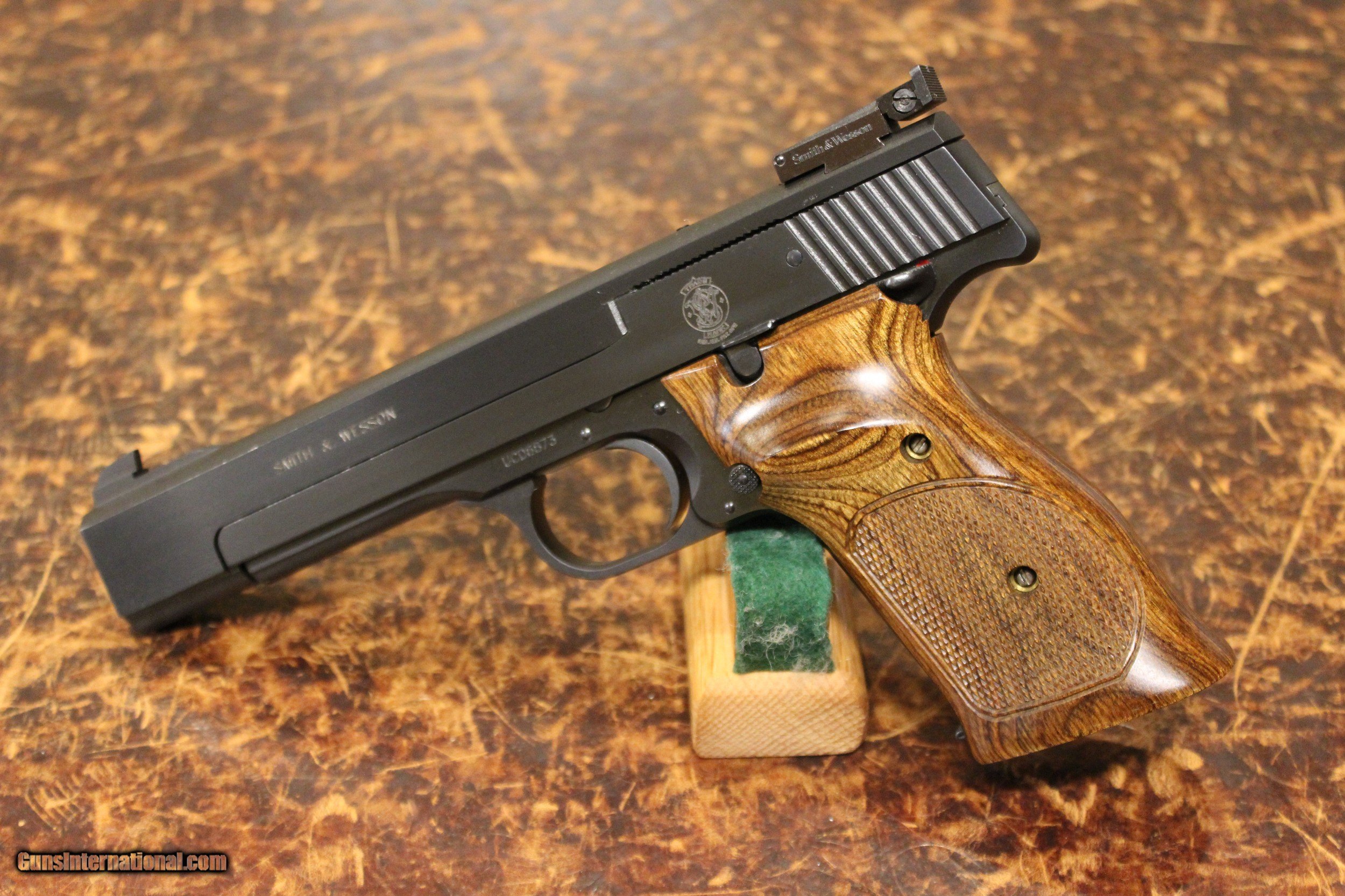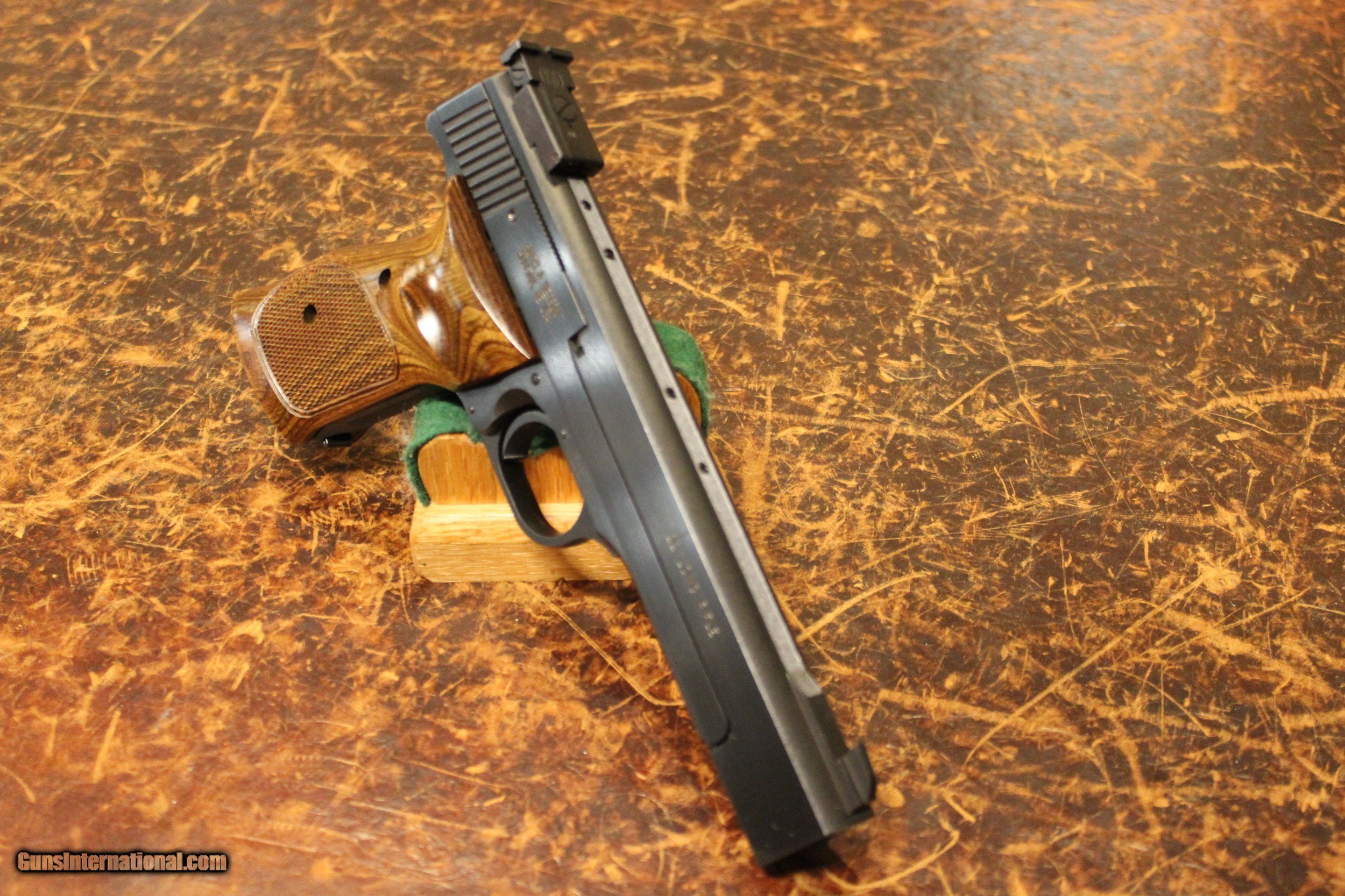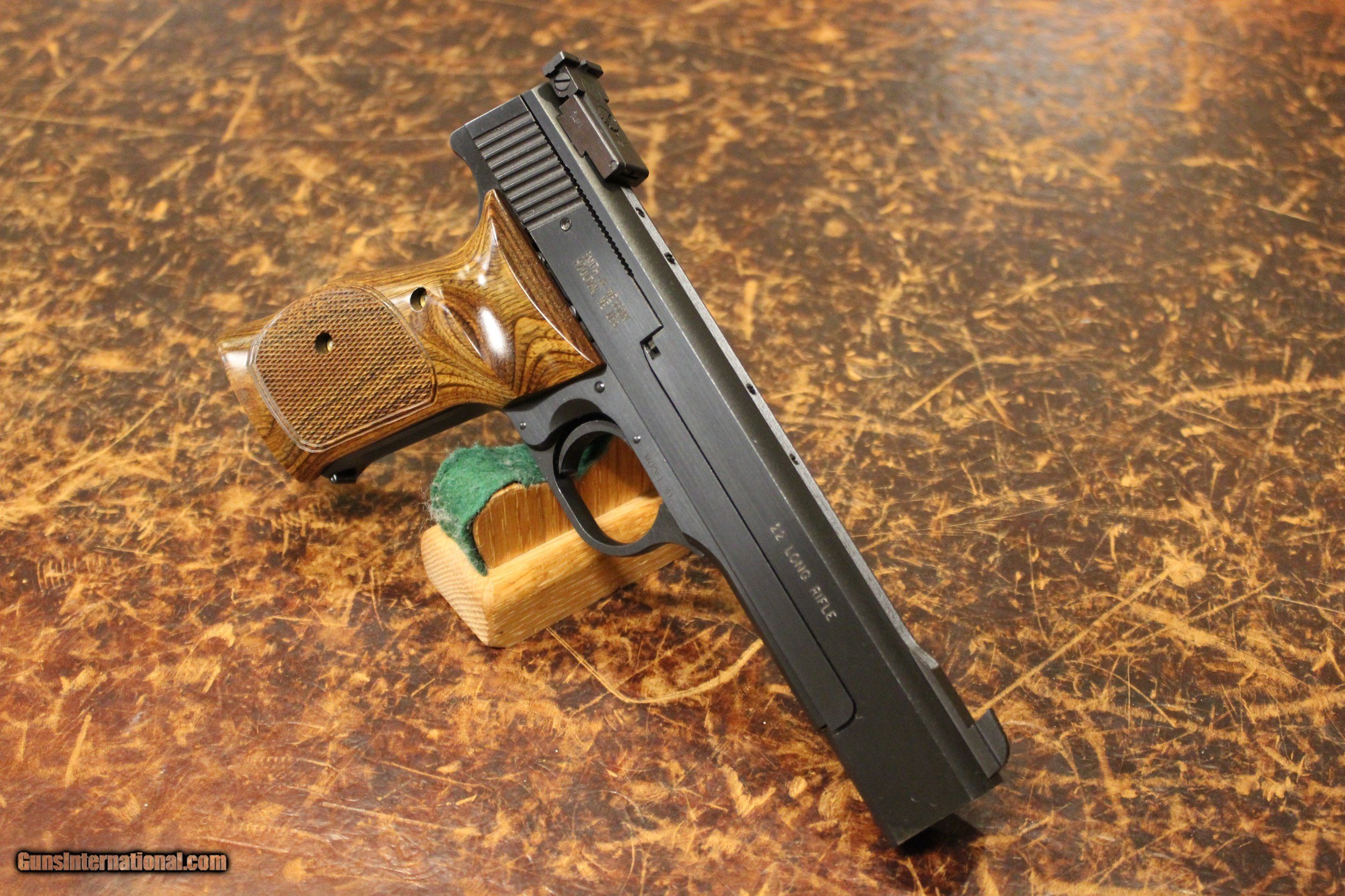 Description: Smith & Wesson model 41 Target pistol wearing a 5.5 inch heavy barrel and Target adjustable sights, contoured thumb rest checkered wood grips. COMES WITH BOX AND TWO MAGS.EXCELLENT CONDITION SOLD |