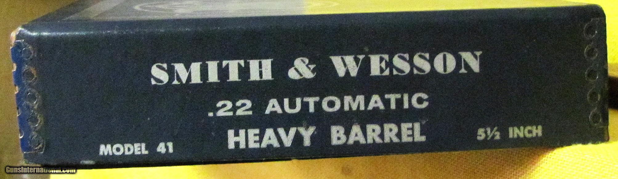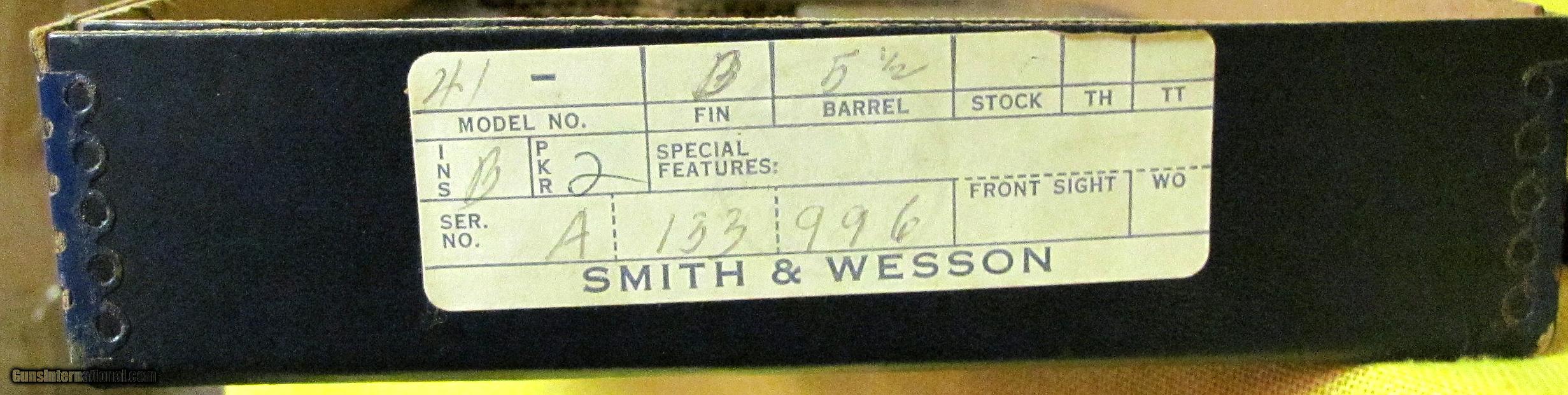 Description: S&W model 41 (HEAVY BARREL) our stock # YA10269 in .22 L.R. CAL., with 5 1/2" barrel. Color BLUE. S&W MODEL 41 HEAVY BARREL, MIRROR BORE, COCKING INDICATOR, WALNUT CHECKERED TARGET GRIPS EXCELLENT, 98%+ ORIGINAL FACTORY FINISH IN ORIGINAL BOX, LIKE NEW CONDITION. OUR NEW STOCK # D31842 Condition 98%+ LIKE NEW. Serial number A133996. SOLD |