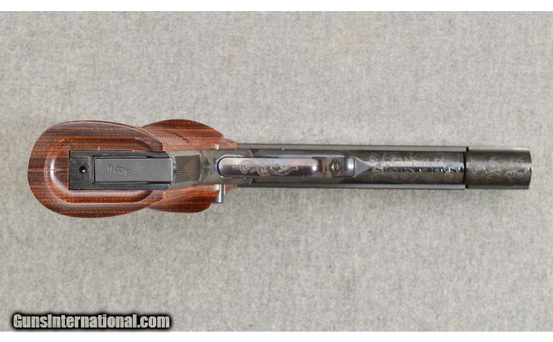 Description: For your consideration, a Smith & Wesson model 41 in .22lr. This is a commemorative issued in celebration of the 50th anniversary of the 1958 introduction to S&W's catalog of the model 41. The piece is festooned with foliate scroll work with gilded inlays. Included is the glass topped, velvet lined presentation case. 9mm Luger SOLD Metal Condition: Excellent Wood Condition: Excellent Bore Condition: Excellent Barrels: 5.5 Triggers: Serrated Weight: 2 lbs Sights: Iron Sights Item Location: Hamburg, PA |