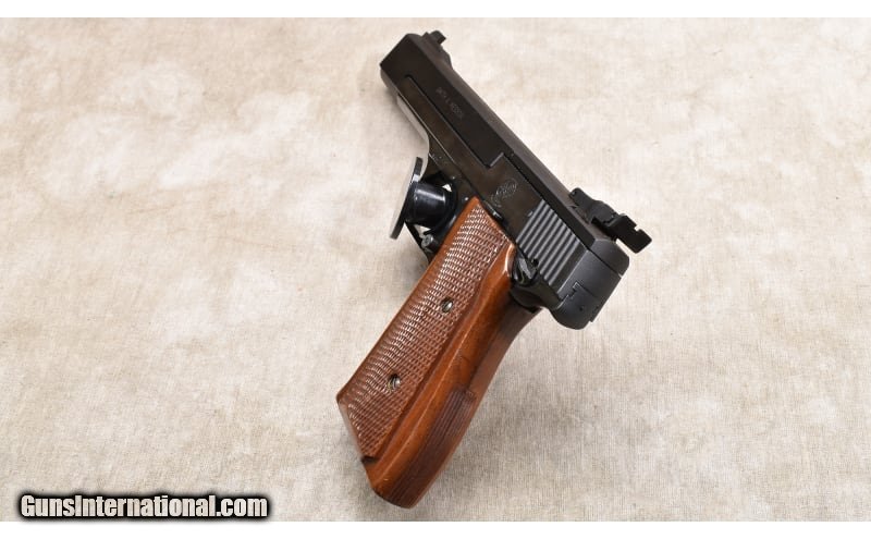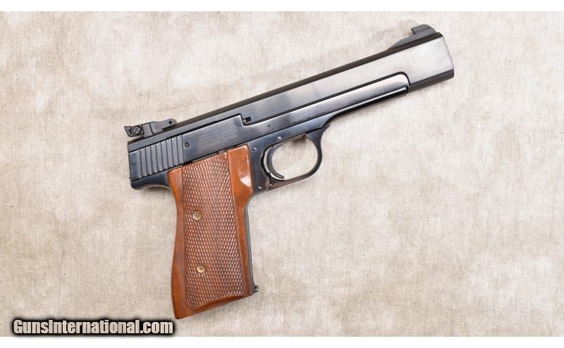 Description: Designed and refined over a period of 10 years after WWII, the S&W Model 41 was, and is, a target competitor's pistol. It was made to feel like the Colt 1911. This one has a 5-1/2 inch barrel with a "weighted" muzzle for control. The sights are Patridge -type target sights, and the grips are somewhat thicker to give better control. This specimen is in excellent condition showing little use and excellent maintenance. .22 Long Rifle SOLD Chambers: 10 rounds Metal Condition: Excellent. Wood Condition: Excellent. Bore Condition: Shiny and bright with sharp rifling. Barrels: 5-1/2 inches Triggers: Factory single action trigger.. Butt Pad: Checkered walnut Weight: 45 ounces Sights: Patridge post and notch adjustable target sights. Item Location: Rogers |
