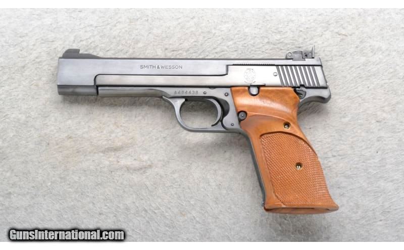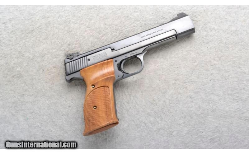 Description: This Smith & Wesson Model 41 is a right hand semi-auto pistol in .22 Long Rifle Cal. It has a 5.5 inch barrel with a rear serrated slide. A raised blade front sight and an adjustable notch rear sight. The target style grip is a checkered hardwood with a right-hand thumb and fore finger rest. .22 Long Rifle SOLD Chambers: 10 round magazine. Metal Condition: Excellent. Wood Condition: Very Good. Bore Condition: Excellent. Barrels: 5.5 inch barrel with a rear serrated slide. Weight: 46 oz. Sights: Raised blade front. Adjustable notch rear. Item Location: Richfield, WI |