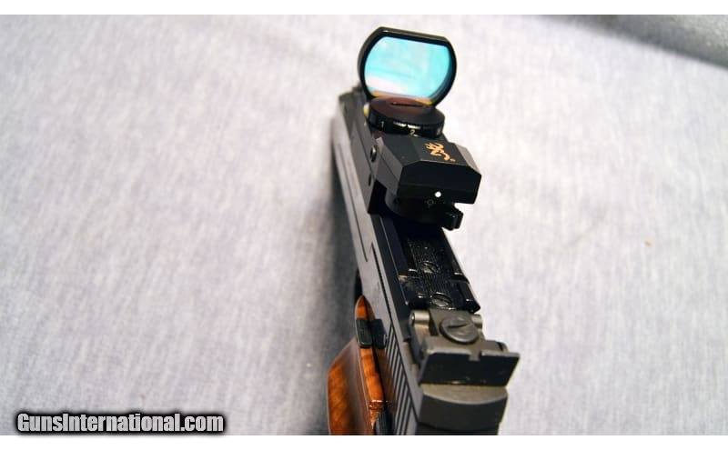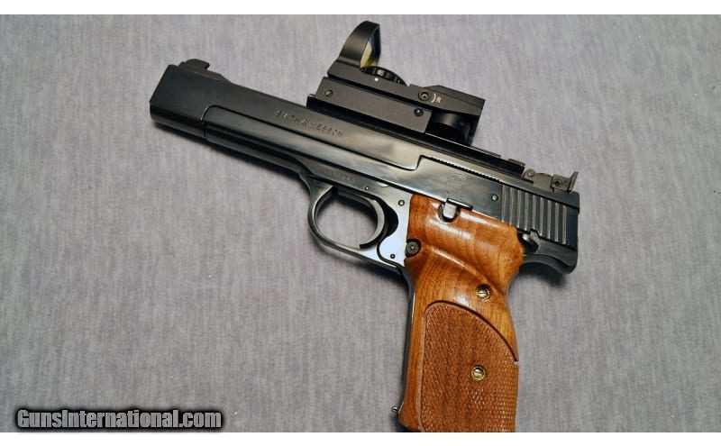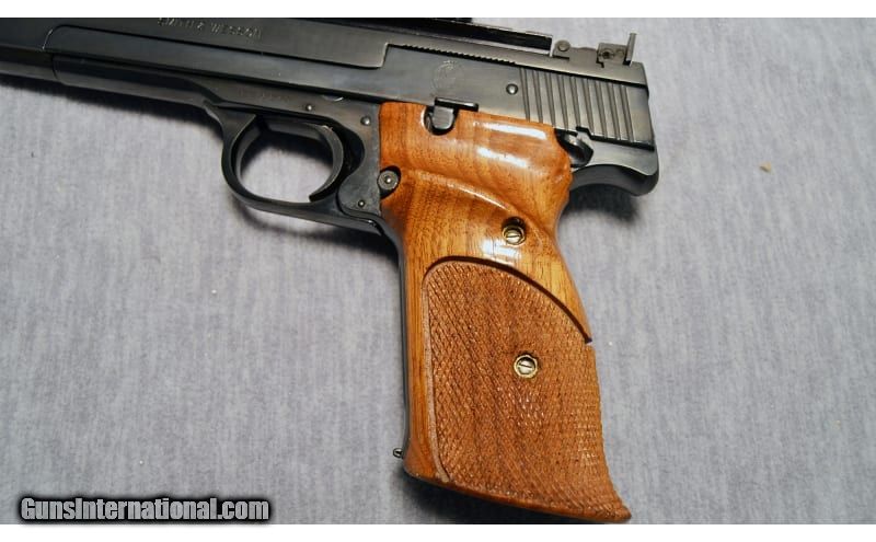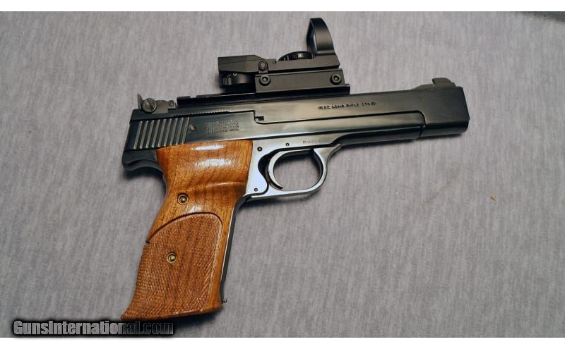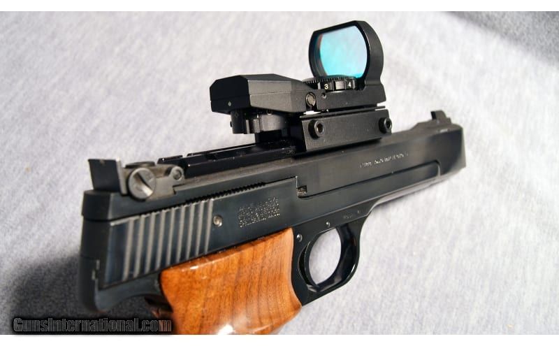 Description: Smith & Wesson Model 41 chambered in .22 Long Rifle. Heavy weight with light trigger pull and contour checkered wood grips make this a great target pistol. Overall condition is very good. .22 Long Rifle SOLD Metal Condition: Very good Wood Condition: Very good Bore Condition: Very good Barrels: 5.5" rifled Triggers: Factory Weight: 3 lbs Sights: "Browning red dot sight. Front blade, rear adjustable u-notch. Item Location: Cheektowaga, NY |