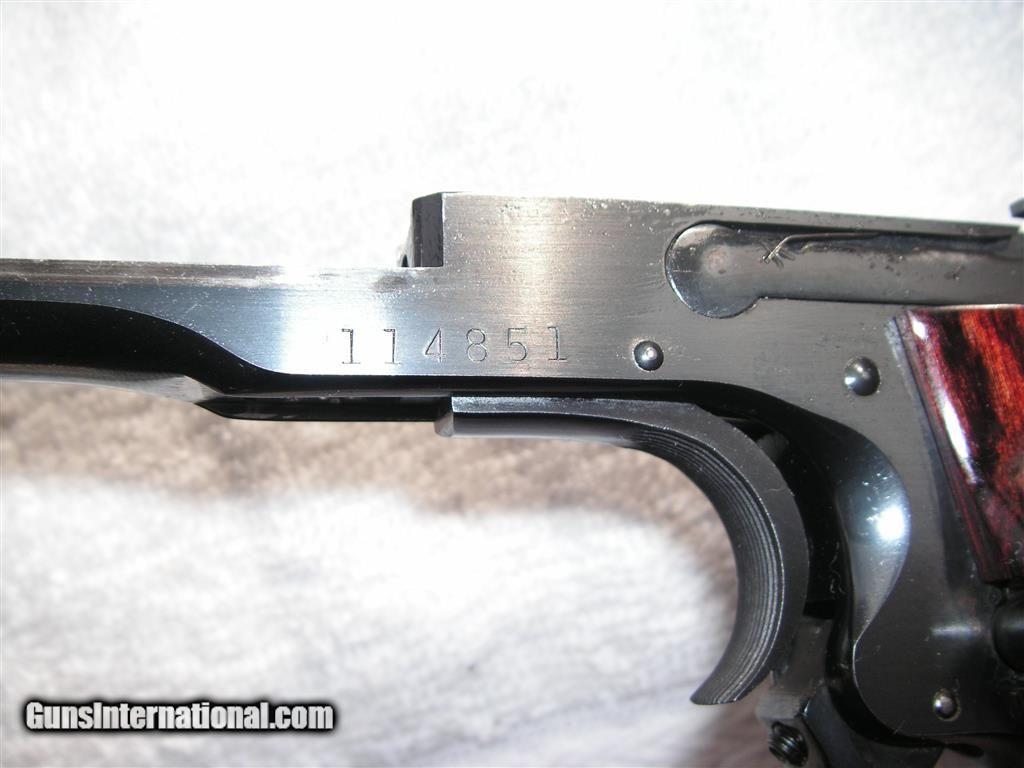 Description: SEE THE PICTURES OF THIS EARLY SMITH & WESSON HIGH POLISH ROYAL BLUE FINISH ABSOLUTELY BEAUTIFUL MODEL 41 CALIBER 22LR EARLY VARIATION IN LIKE NEW ORIGINAL CONDITION WITH CACKING INDICATOR TWO ORIGINAL METAL FOLLOWERS MAGAZINES AND ROSEWOOD GRIPS. IT ALSO HAS A VERY CRISP ACTION AND TRIGGER. IT IS THE ONE OF THE BEST ACCURATE TARGET PISTOL WHICH DESIGN WAS USED BY OTHER'S FOREN GUN COMPANIES LIKE WALTHER/GERMANY AND HAMMERLI/SWITZERLAND. THE EARLY MODEL 41 PISTOLS WHERE MADE WITH MUCH BETTER QUALITY AND FINISH, THEREFORE THE HIGHEST SHOOTING SCORE SHOOTERS PREFER THEM. We offer three days inspection. Only not fired changed parts or condition guns would be accepted. Return shipping cost is the buyer expense. We accept bank & postal money orders or personal & business checks, but those take time to clear. We also offer 90 days layaways with 25% down & three more payments of 25% per month. The layaway plan does not have 3 days inspection privileges; therefore there is “NO RETURNS” policy. If you have offered to buy my guns, and the payment has not made soon after (from 3 to 5 days), I will not guarantee you will be the buyer of it. I can secure your purchase only when you have paid for it. If your payment comes too late, I will return it back to you. Please check our other nice listings. SAFETY NOTICE: Buyer solely responsible for following all safety requirements in handling guns. By , the buyer agrees to hold seller harmless against damages, injury or death caused by defective merchandise or ammo. If you like, we can negotiate terms of shipping. The offered shipping price includes insurance cost & priority mail cost only. SOLD Curio/Relic: Yes Manufacturer: SMITH & WESSON Model: 41 Serial Number: 114851 Caliber Info: 22LR Bore: SHINY & BRIGHT Condition: LIKE NEW ORIGINAL Metal Condition: EXCELENT ORIGINAL Wood Condition: EXELLENT Barrels: 5.5 IN |