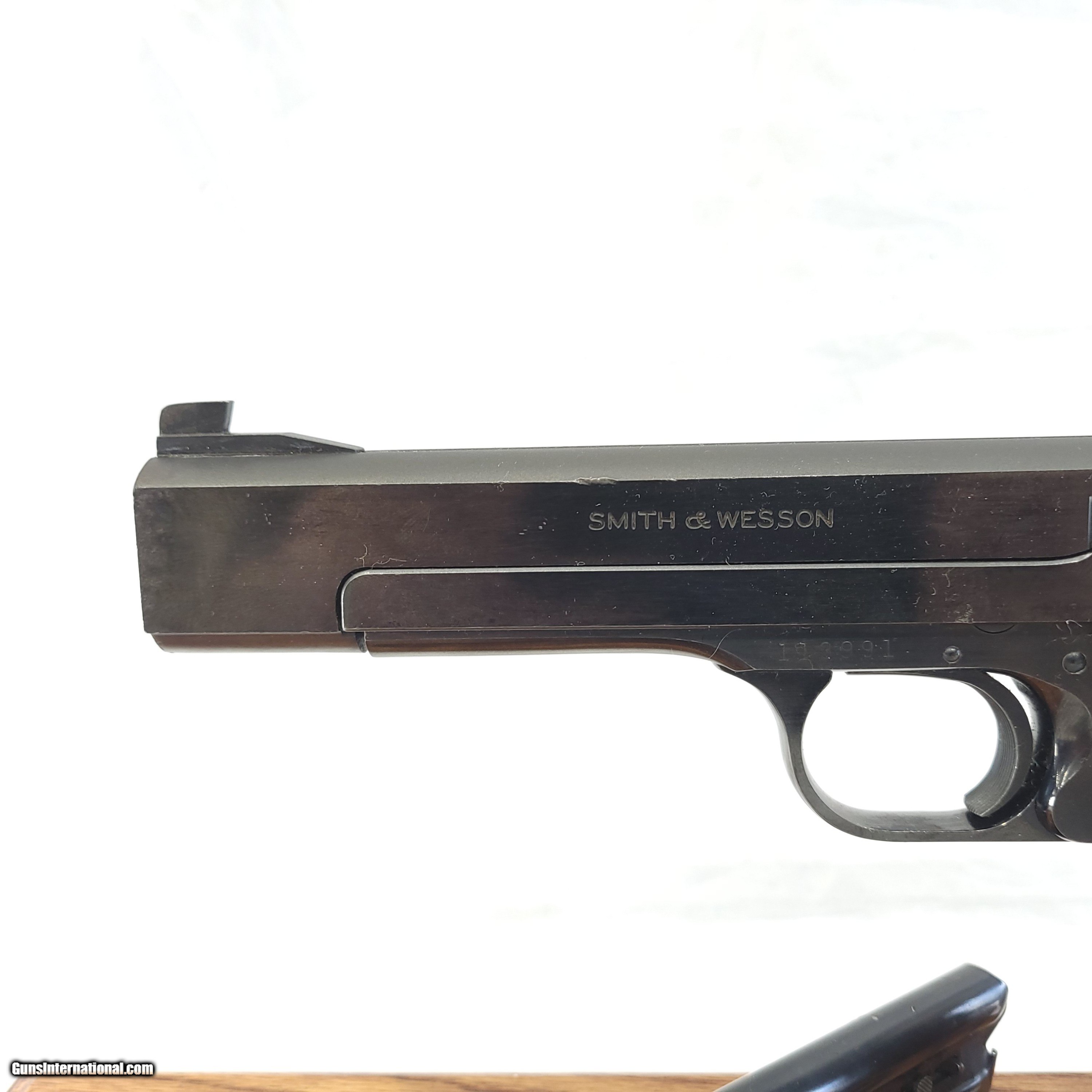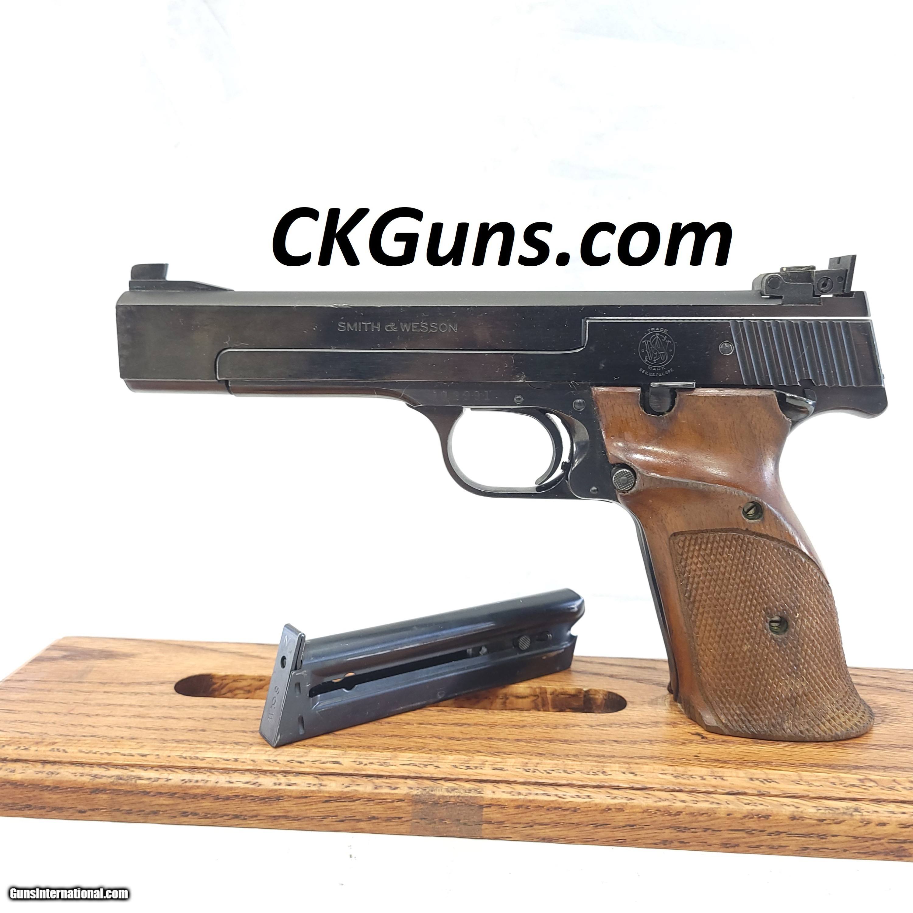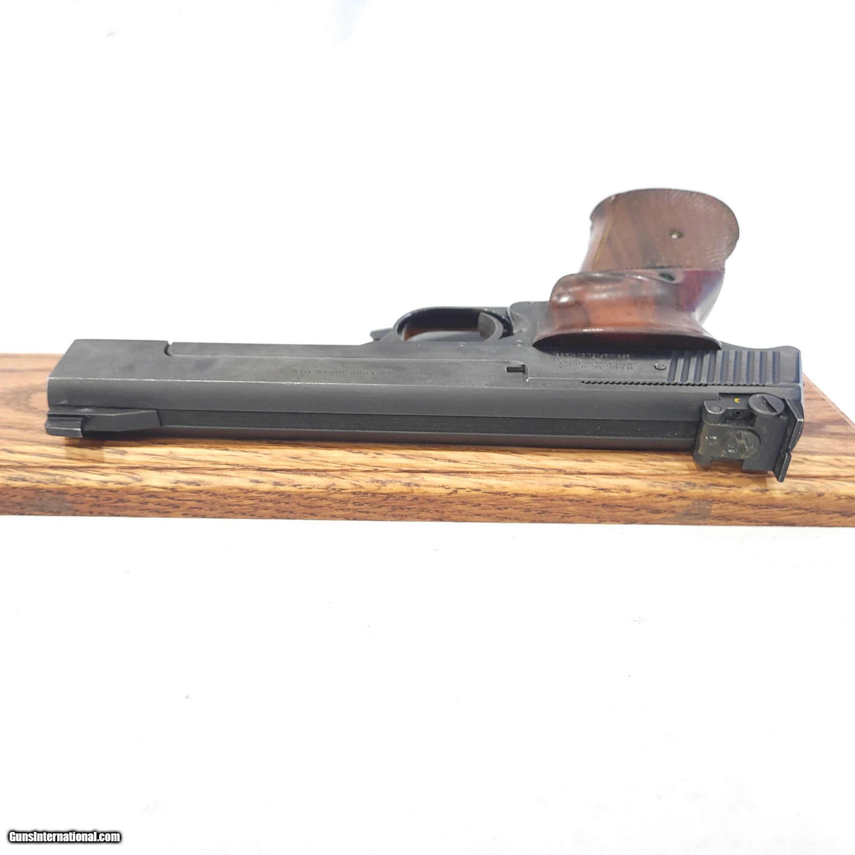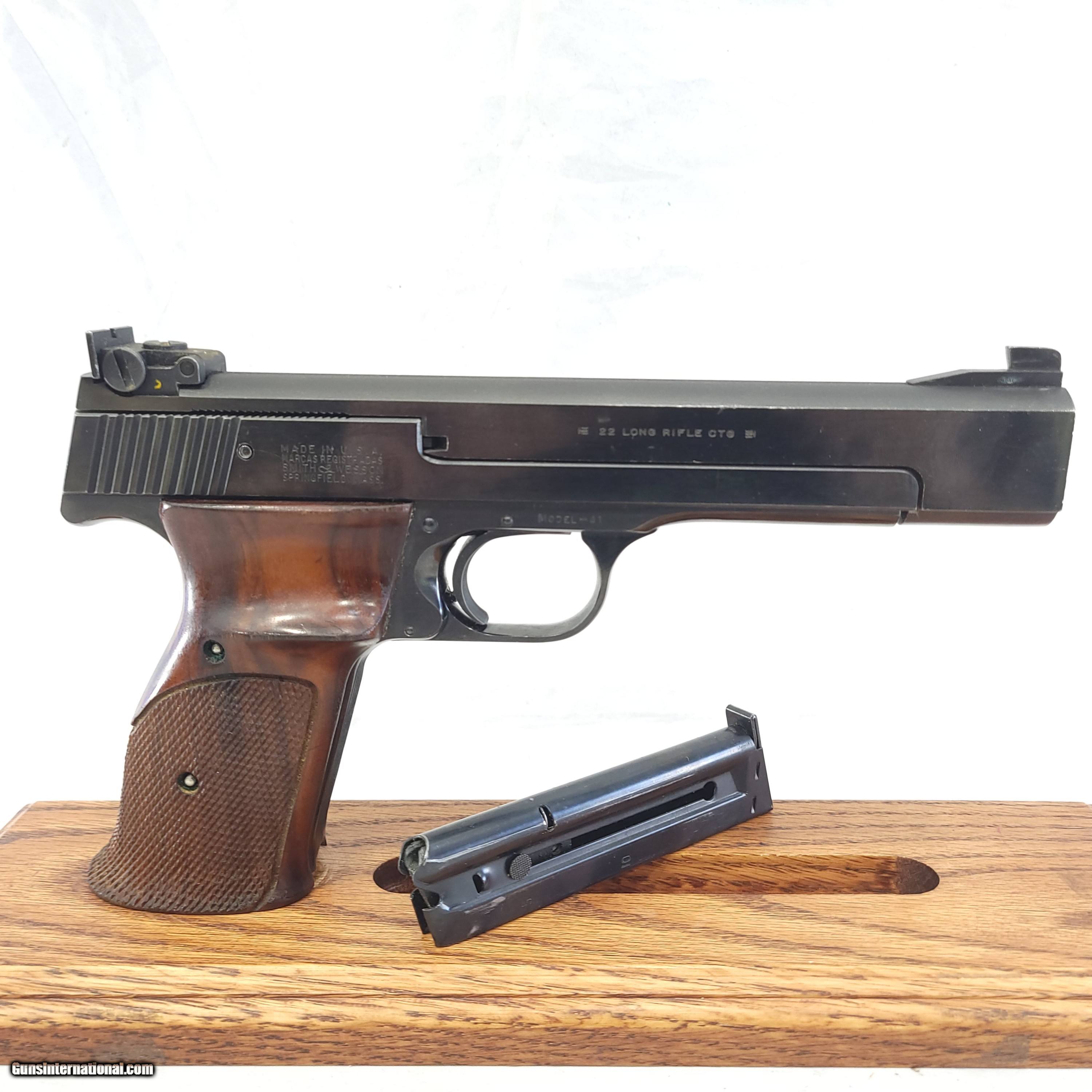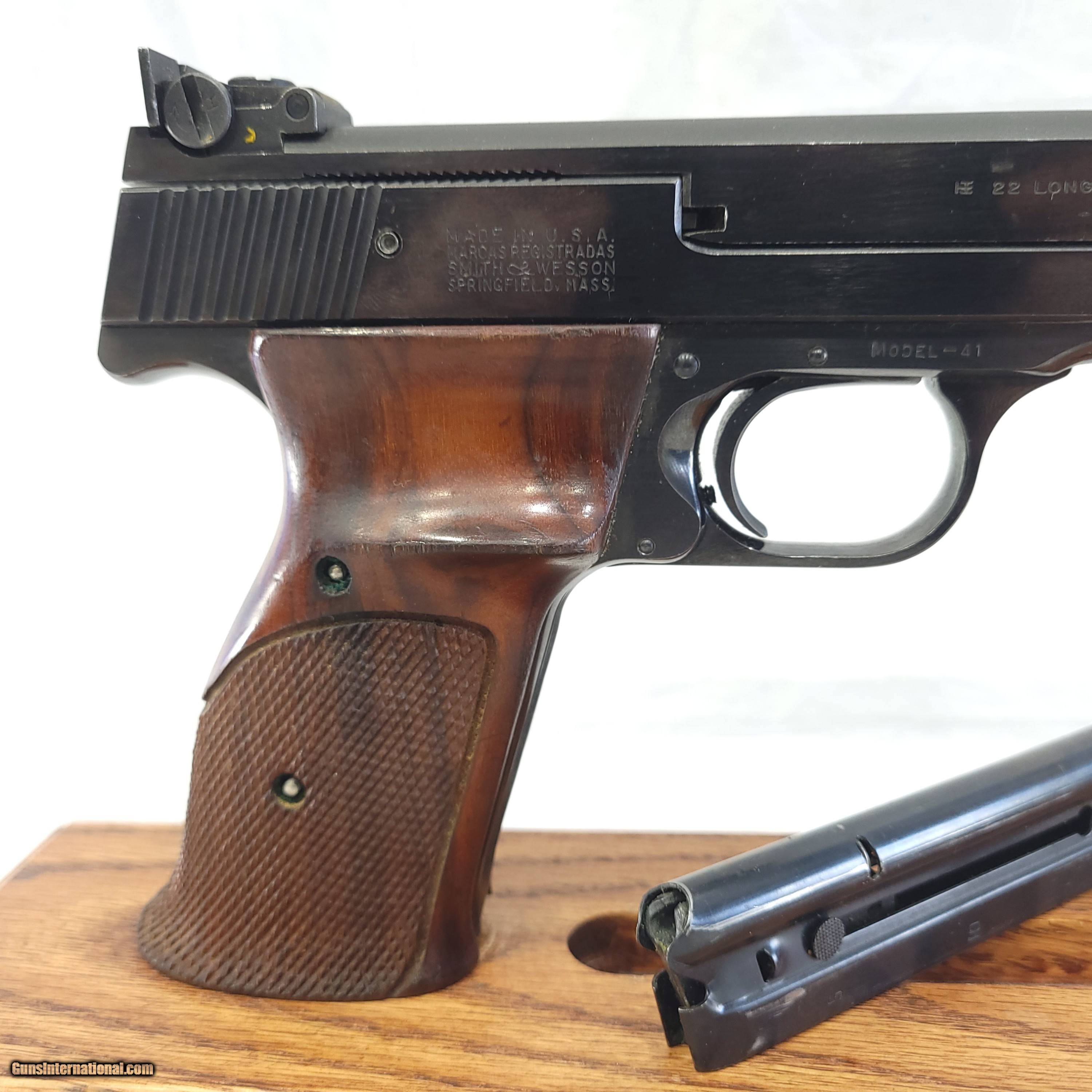 Description: INV 11428 SMITH & WESSON MDL. 41, CAL. 22LR. SER. 113991. THIS "X RING BLASTER" HAS RETAINED ABOUT 97+% OF THE ORIGINAL FACTORY FINISH. THE BULK OF THE LOSS IS DUE TO SOME SHARP EDGE SIVERING, SEVERAL LITTLE SURFACE SCRATCHES AND SOME SMALL PATCHES OF SURFACE PIN PRICKS ON THE LEFT SIDE OF THE MUZZLE. THE WOODEN GRIPS SHOW SLIGHT WEAR ON THE EDGES OF THE THUMB REST. THE LEFT PANEL DOES HAVE A FEW FLATTENED POINTS. THE BALANCE OF THEM ARE GREAT. ALL PARTS ARE ORIGINAL TO THE GUN. THE SLIDE RAILS, BOLT FACE AND FEED RAMP SHOW ONLY THE MODEST USE. THE BORE IS PRISTINE, SUNSHINE BRIGHT WITH RAZOR SHARP RIFLING WITHOUT A WHISP OFF FROST. IT COMES WITH ONE ORIGINAL MAGAZINE. IT IS TRULY A GREAT FIND FOR THE BUYER WHO WANTS AN "X RING BLASTER" AND DOESN'T WANT TO SELL HIS FIRST BORN TO GET IT. MODESTLY PRICED AT.. $795.*** *** 100% OFTHE GUN'S PRICE IS SATISFACTION GUARANTEED. To purchase this firearm or if you want to request more information contact us at: Email ckguns[at]ymail[dot]com Phone 201-512-0002 Cell 201-575-6838 FAX 201-215-4759 We accept most major credit cards. Prices shown are Discounted 3% for Cash or Check. The buyer must be familiar with all the laws governing the purchase and the ownership of firearms in their own city and state. The Yankee Armorer, Inc is not responsible for any failure to comply with or observe these laws. The Yankee Armorer, Inc will only ship after full payment and receipt of all required documents. Shipping: Add $35.00 for handguns, $45.00 for long guns. New Jersey buyers are subject to a 7% sales tax. The Yankee Armorer, Inc offers a 3 day inspection period with full refund upon return of intact firearm and in the original condition. The Yankee Armorer, Inc offers a no interest lay away program - 25% down; 25% in 30 days; 25% in 60 days; and full payment in 90 days. Any violation of this policy is subject to restocking and forfeiture of all payments. Any variation from this policy must be agreed to in advance. Unshipped Cancelled sales are subject to a 20% restocking fee. Be advised that all firearms sold by The Yankee Armorer, Inc. or the Gun Exchange, LLC (SELLER) are sold as collector’s items. They have not been fired or tested for safety and must be examined by a license gunsmith prior to use. By purchasing any item from the (SELLER), you are agreeing to hold the (SELLER) free from any damages or lawsuits of any nature. Any item left for transfer or storage will be charged to $25.00 per month, per item from the day of its receipt. Any variation from this policy must be agreed to in advance. Store hours 10:00 am to 5:00 pm Tuesday -Saturday. It's always best to call for appointment. Store 201-512-0002, cell 201-575-6838. SOLD |
