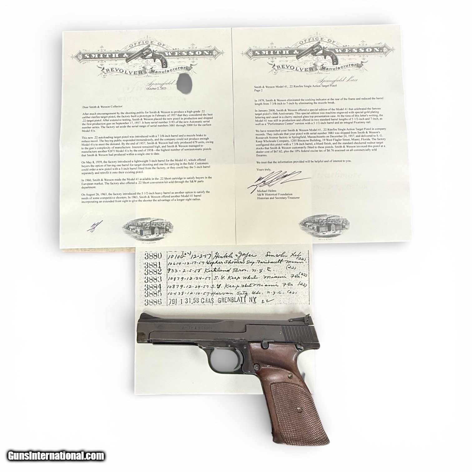 Description: Guns Listing ID: 615336 1957 Smith & Wesson Model 41 - First Year Production - Factory Letter Included Offered here is a documented first-year production Smith & Wesson Model 41, shipped in 1957, the inaugural year of commercial production for one of the most respected American .22 LR target pistols ever produced. This pistol is serial number 3883 and includes official documentation from Smith & Wesson in the form of a Smith & Wesson Historical Foundation factory letter, which is included with the firearm. The letter confirms shipment on December 24, 1957 to S.G. Keep Wholesale Company in Miami, Florida and documents the pistol’s original factory configuration at time of shipment. According to the factory letter, this pistol originally shipped with a 7 3/8 inch barrel, blued finish, and walnut target stocks. The pistol is now fitted with a 5.5 inch factory Model 41 barrel, which is period-correct, original Smith & Wesson manufacture, and appropriate to the era of the pistol. The original 7 3/8 inch barrel referenced in the factory letter is not included. This distinction is disclosed clearly and accurately for collector transparency. The Model 41 is widely regarded as one of the finest American-made rimfire target pistols ever built, known for its superb balance, accuracy, and trigger quality. 1957 represents the first year of commercial Model 41 production, and pistols documented to that year are, by definition, first-year production examples, making them especially desirable among collectors. This pistol is best graded as Very Good overall condition, while being excellent for its age. The original blued finish presents well and shows honest signs of careful use over time, including light surface scratches and visible surface patina markings near the beavertail area by the grip. The original walnut target stocks show normal handling marks consistent with age. All markings remain clear and correct, and there is no evidence of refinishing, restoration, or abuse. The pistol retains its originality and mechanical integrity. Included with the pistol are nine magazines, a high-quality custom leather holster, and a modern nylon magazine pouch. The magazine count is a meaningful value addition, particularly for an early Model 41, as original magazines are increasingly difficult to acquire in quantity. This is an honest, factory-documented early Model 41 offered with full disclosure regarding configuration, making it suitable for both the informed collector and the serious shooter who appreciates historically significant firearms. All used firearms are sold “as is," with no warranties, expressed or implied. What makes this Model 41 stand out: • Documented 1957 first-year commercial production • Smith & Wesson Historical Foundation factory letter included • Early serial number with strong collector appeal • Factory-correct, period-appropriate 5.5 inch Smith & Wesson barrel installed • Original 7 3/8 inch barrel referenced in the letter is not included • Very Good condition that is excellent for a 1957 pistol • Includes nine magazines plus leather holster Curio/Relic: Yes Manufacturer: SMITH & WESSON Model: Model 41 1957 Documented First-Year Production Caliber Info: .22 LR Condition: Used - Non-Certified Barrels: 5.5" BARREL Action: SEMI AUTOMATIC Finish: walnut, blued Price: $2,350.99 Contact Seller |