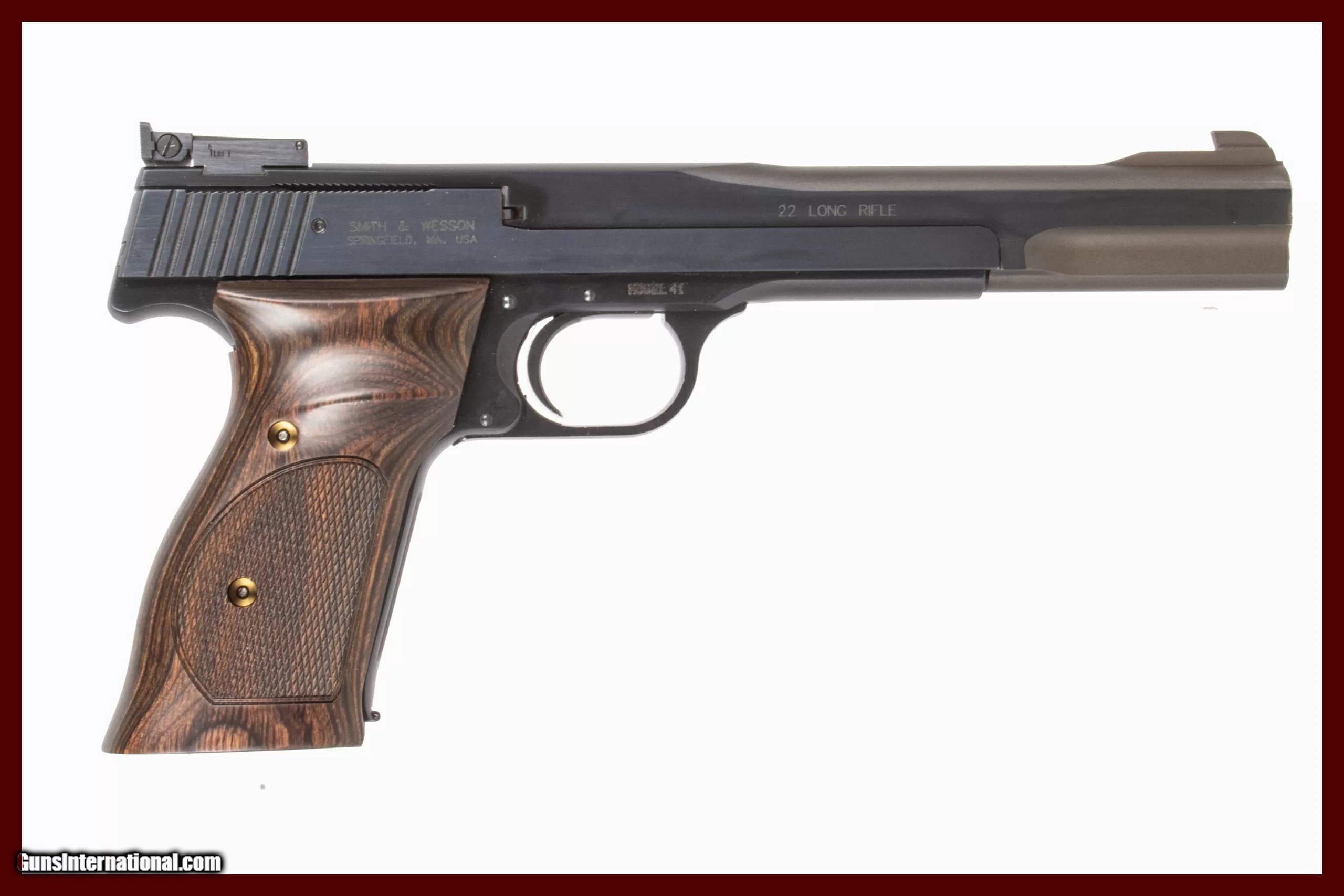 Description: Smith & Wesson Model 41 chambered for .22 Long Rifle with seven-inch barrel, blued steel with satin blued backfill, target sights, and wood grips with diamond checkering. Action appears to be in good working order with mirror bright, sharply rifled bore. The NRA grading condition for this USED firearm is Very Good+. We ship domestically in the United States. Additional shipping rates apply to Alaska and Hawaii. Dury’s Lifetime Warranty: All firearms purchased from Dury’s Gun Shop, NEW or USED, are covered by a lifetime warranty. We will repair or replace, at our discretion, any firearm purchased from Dury’s Gun Shop, Inc. for as long as it is owned by the purchaser. This warranty is not transferable. WE BUY GUNS! NO COLLECTION TOO BIG OR SMALL FOR OUR GUNS INTERNATIONAL CUSTOMERS ALL OF OUR FIREARMS CAN BE PURCHASED DIRECTLY FROM OUR DURY’S GUNS SITE ! SOLD Manufacturer: Smith & Wesson Model: 41 Caliber Info: 22 Long Rifle Barrels: 7inches |