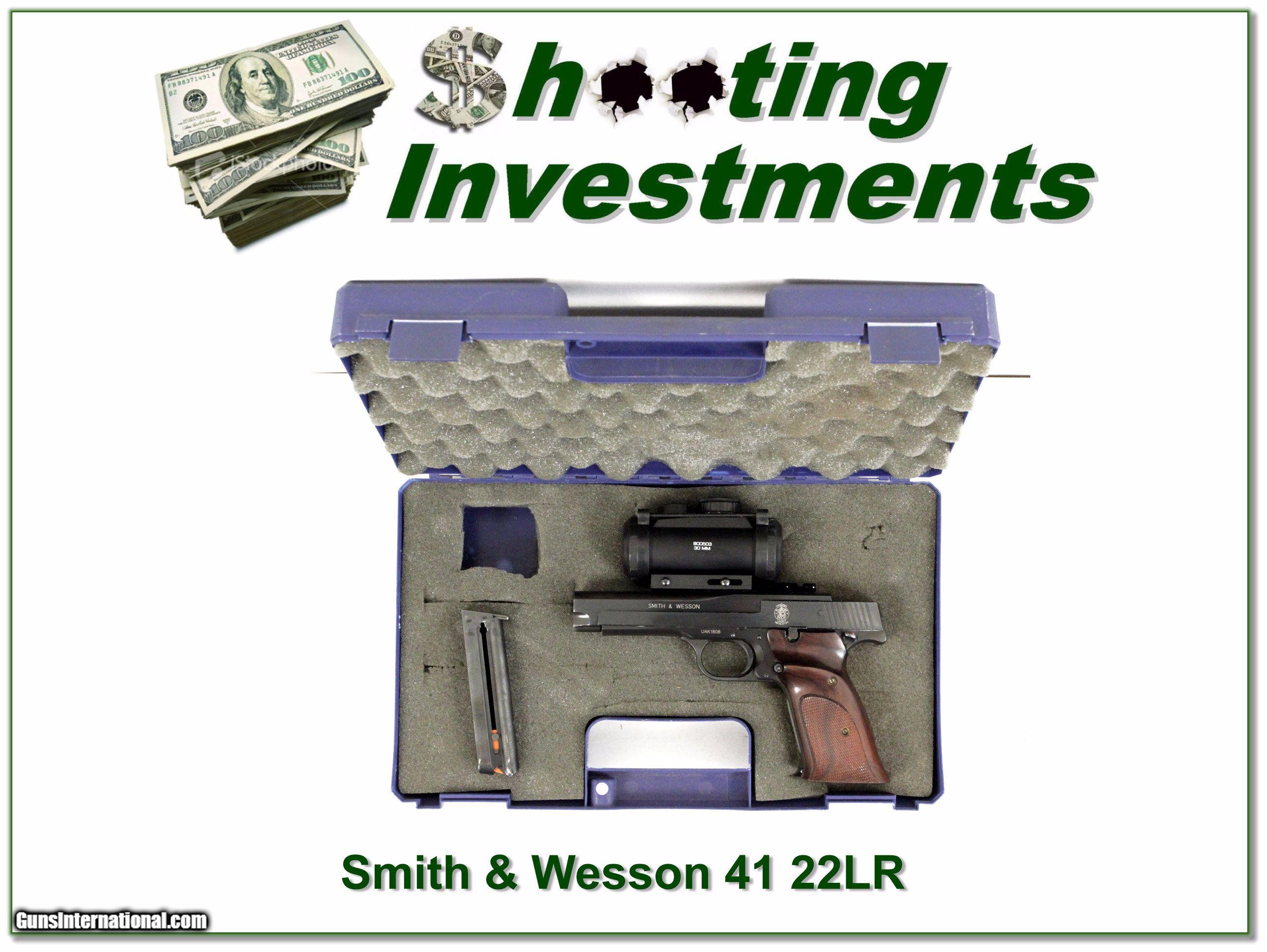 Description: This is a S&W Model 41 22. It comes with 2 magazines in original case, it has a 5in scope barrel and includes scope as seen. It is in excellent lightly used condition. I am selling this one on consignment and as such, lay-a-way can’t be used. It does of course have the standard 3-day inspection. Shipping and insurance is $29. Please email me with any questions or larger pictures. (I now consign quality firearms only 10%! Let me know if you have any you would like to sell!) 17-0808 Payment: Payment is by Money Order, Cashiers Check or Personal Check. I can now also accept MasterCard and Visa with a 3% convenience fee. PayPal can be used for some items but never firearms. Please let us know if you would like to pay via PayPal. Shipping: The shipping charge will be listed in each description. It is $39 for most long guns and $29 for most handguns. Some heavy guns or those insured for over $2000 will be higher. Shipments to Alaska and Hawaii are higher because air shipment is required. Most firearms are shipped on Tuesday and Thursday and usually in 5 days of receipt of payment. We package all shipments carefully and insure them. For long guns you can purchase a new Plano case for $19. They now cost us $22 when buying 100 at a time. Optics are shipped Priority Mail and most other non-firearm shipments are shipped First Class. Returns: Our return policy is simple. If for any reason you are not pleased with your purchase, you may return your item for a full refund of purchase price. Ammunition cannot be returned. It is important to us that you are happy. Guns cannot be fired or dissembled before returning them and they must be returned in the same condition as received. Notification of a return must occur with-in 3 days of receipt at your dealer. Shipping, convenience and dealer fees are not refundable and are the responsibility of the buyer. Lay-a-way: If needed, we offer a 60 day lay-a-way option on most firearms. It is 1/3 now, 1/3 in 30 days and 1/3 in 60 days. Lay-a-way firearm sales are final and if not completed the first payment cannot be returned. Consigning your firearms with Shooting Investments: We will help you get top dollar for your firearms. While most local guns shops charge 20% or more, our fee is only 10% with a minimum of $75. At your local gun shop it might take months to sell. Selling on-line provides instant access to thousands of interested buyers. You won’t find any other on-line dealer willing to sell your firearms for only 10% or listing every gun on 3 separate s. Selling through an House typically costs the seller 15% and the buyer an addition 15% (so 30%) and you have to wait several months to sell and longer to receive funds. If properly priced, we will sell your firearms in a few weeks. Send us an email or give us a call and we’ll explain how easy it is for you to get top dollar. Trading: Trading for use is really just buying your gun to re-sell. If you have a gun you want to trade, please email a picture and we will let you know what we can give or it. You will always get more if we sell it for you on consignment. Help for California Buyers: We are happy to ship to California. It is the buyer’s responsibility to make sure any item you buy is legal in your state. We are also happy to help with your purchase of a firearm from someone other than us. If you see a gun you would like to buy but the seller can’t or won’t ship to California they can ship to use and we’ll then ship it to your California dealer. The cost for this service is only $30 + shipping. Let us know if we can help! SOLD |
