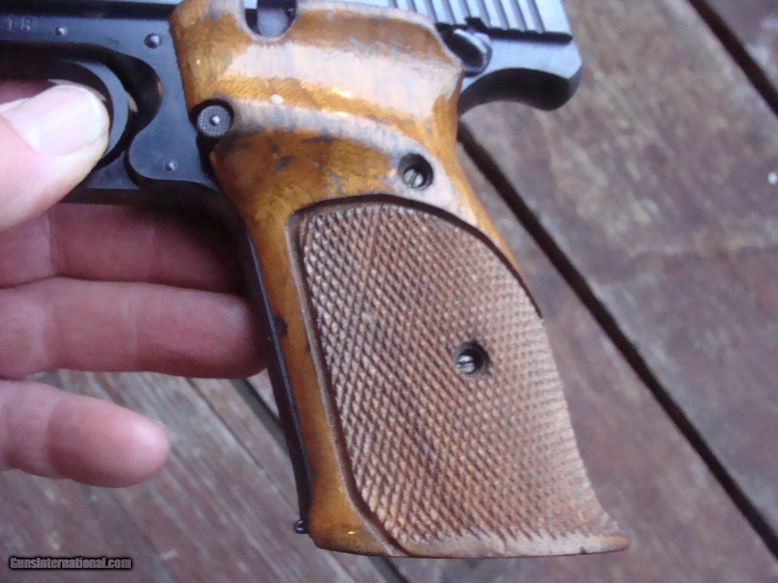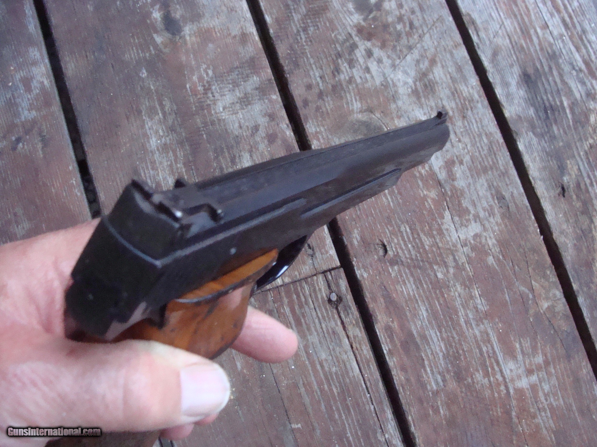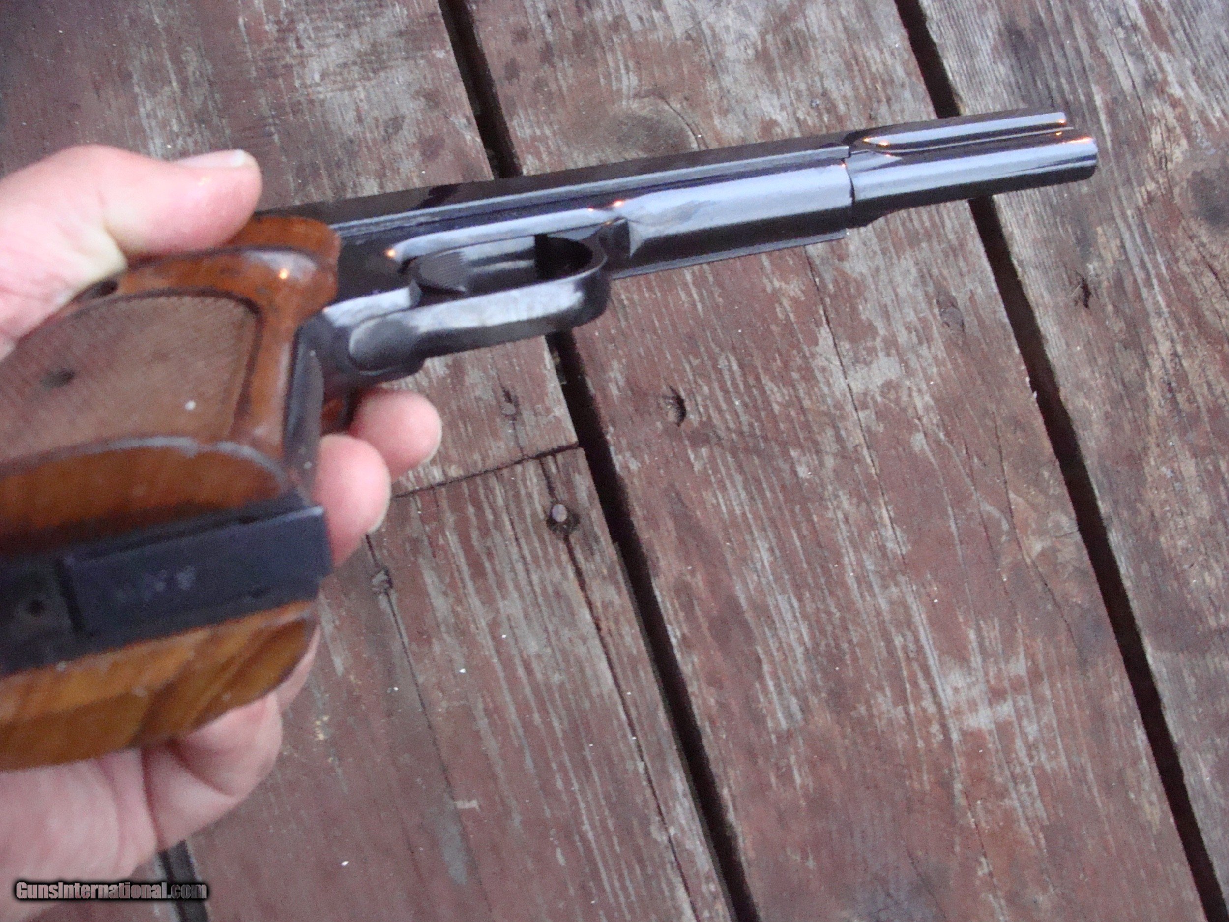 Description: Nice looking gun with minor surface imperfections offered for 1/2 of what they are normally offered for. Finish wear on factroy grips and blued surfaces. A terrific value for any wanting a serious target gun for a fraction of what they are normally sold for or a nice plinker or pot gun to shoot a grouse or rabbit while big game hunting. Please look at pics. This gun may not be returned for cosmetic conditons described here and seen in pics. Shipping is $ 25.00 PLEASE READ EVERYTHING BELOW IN BOLD: IF IT DOES NOT SAY NEXT TO THE PRICE..."SALE PENDING OR UNDER DEPOSIT"...IT IS AVAILABLE. WE DO NOT REPLY TO INQUIRIES THAT SAY "INTERESTED IN THIS GUN" OR "IS IT AVAILABLE" IF YOU WOULD LIKE TO BUY THIS OR ANY OF OUR GUNS WE SUGGEST YOU PHONE US; WE ARE OFTEN AVAIALABLE LONG HOURS. IF YOU ARE INTERSTED IN A GUN THAT IS UNDER DEPOSIT AND WOULD LIKE TO BE NOTIFIED IF A SIMILAR GUN COMES IN DROP US A LINE AND WE WILL MAKE EFFORTS TO CONTACT YOU WHEN ONE DOES COME IN. WE HAVE OVER 2000 SALES ON ALL SITES WITH AN A+ RATING ON ALL WE ALSO KEEP AN INVENTORY OF OLDER PERIOD CORRECT SCOPES; CALL WITH NEEDS WE MOSTLY PICK VERY CLEAN AND LIGHLTY USED GUNS. WE ARE HAPPY TO TAKE CONSIGNMENT GUNS AND COLLECTIONS OR WILL BUY YOURS OUTRIGHT. WE SOMETIMES ARE EMPLOYED FOR ESTATE PURPOSES AND VALUATIONS. CT RESIDENTS MUST CONTACT US TO UNDERSTAND OUR IN STATE TRANSFER POLICIES. PAYMENT USPS MONEY ORDER ONLY AT THIS TIME. ( WE CAN TAKE A DEPOSIT WITH A CARD BUT THE GUN MUST BE PAID WITH A USPS MONEY ORDER) IT IS THE BUYERS RESPONSIBILITY TO GET US A COPY OF YOUR RECEIVING FFL'S LIC AND A COPY OF YOUR PHOTO ID BEFORE THE GUN SHIPS YOU MUST CALL YOUR FFL.WE DO NOT CALL FOR YOU. LAYAWAY PURCHASES NOT COMPLETED OR ANY RETURNED ITEM UNLESS NOT AS DESCRIBED OR DAMAGED ARE SUBJECT TO A 10% RELISTING/RESTOCKING FEE AND MUST BE RETURNED WITH NO NEW MARKS OR SCRATCHES, SENT BACK INSURED, PRIORITY SIGNATURE REQUIRED. ALL INFORMATION CONTAINED HEREIN IS BELIEVED TO BE ACCURATE BUT IS NOT GUARANTEED. WITH ANY OLDER OR USED GUN IT SHOULD BE EXAMINED BY A GUNSMITH OR COMPETENT EXPERT PRIOR TO USE) SOLD |