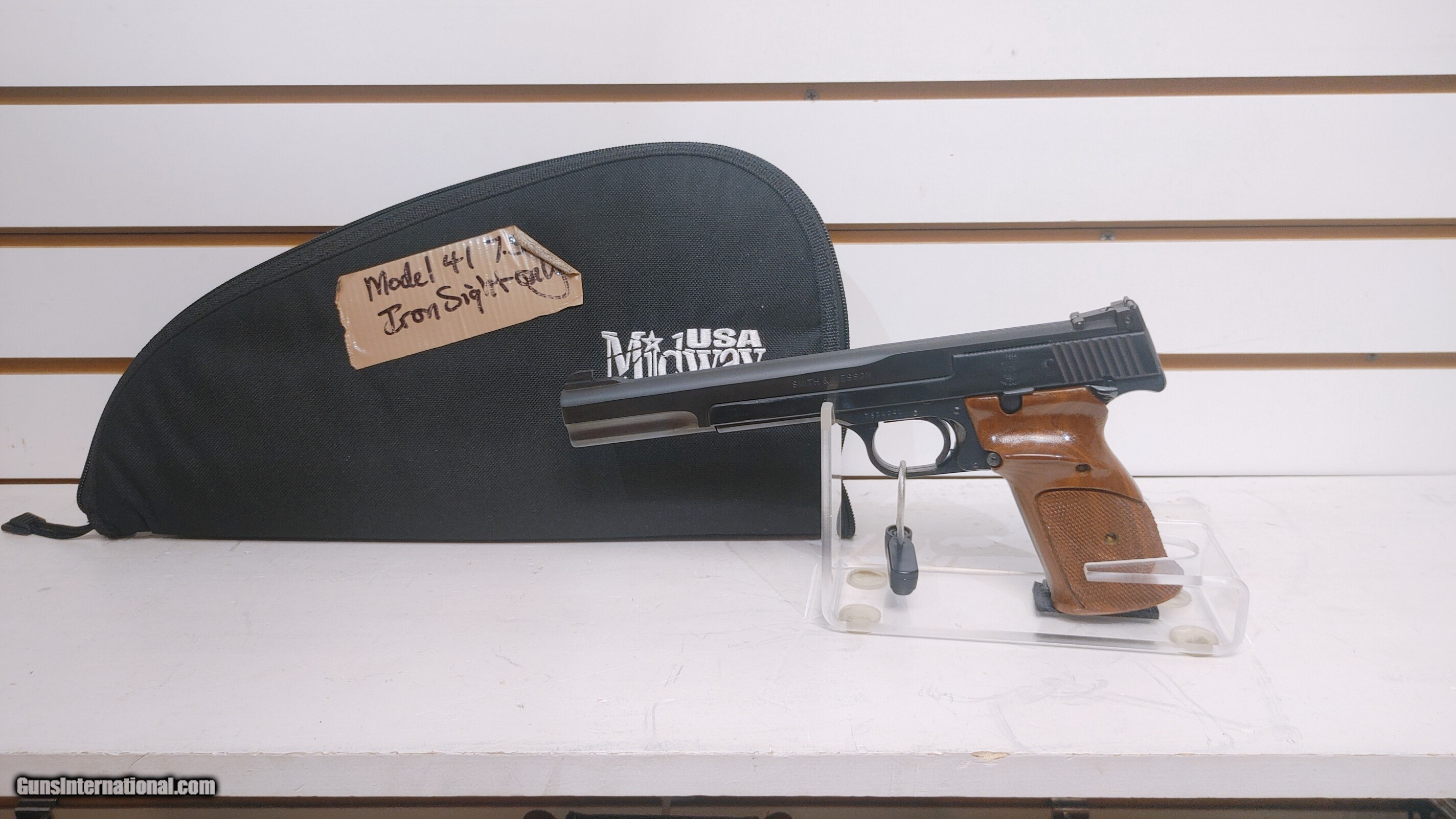 Description: Used Smith & Wesson Model 41 22 LR 1 mag 7 1/4" bbl very good condition soft pouch included Buyer pays shipping Millers Gun Center Located in New Castle, Delaware "Home of TAX-Free shopping" No Credit Card Fees SOLD Handgun Caliber: .22 Long Rifle Serial Number: TBZ4041 |