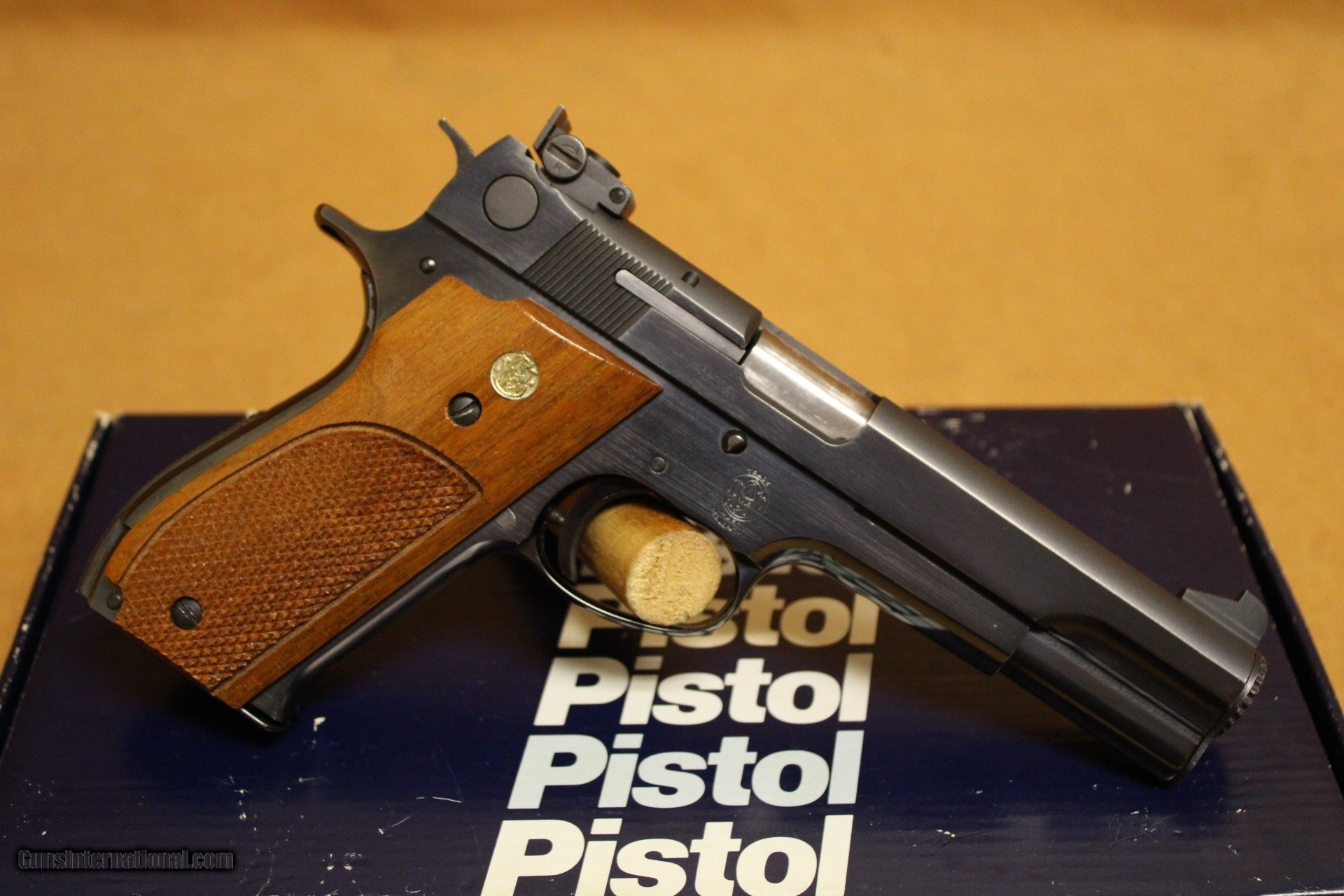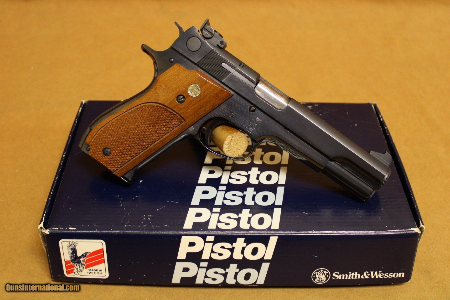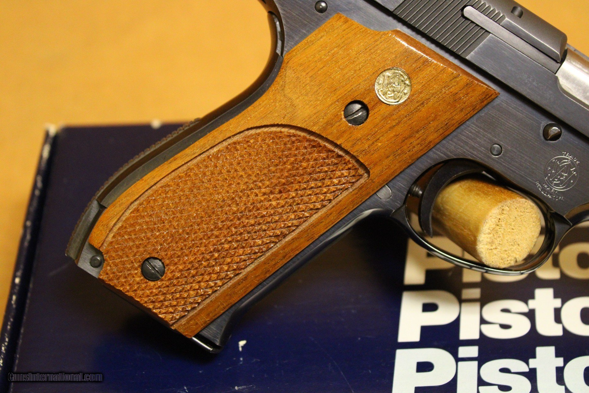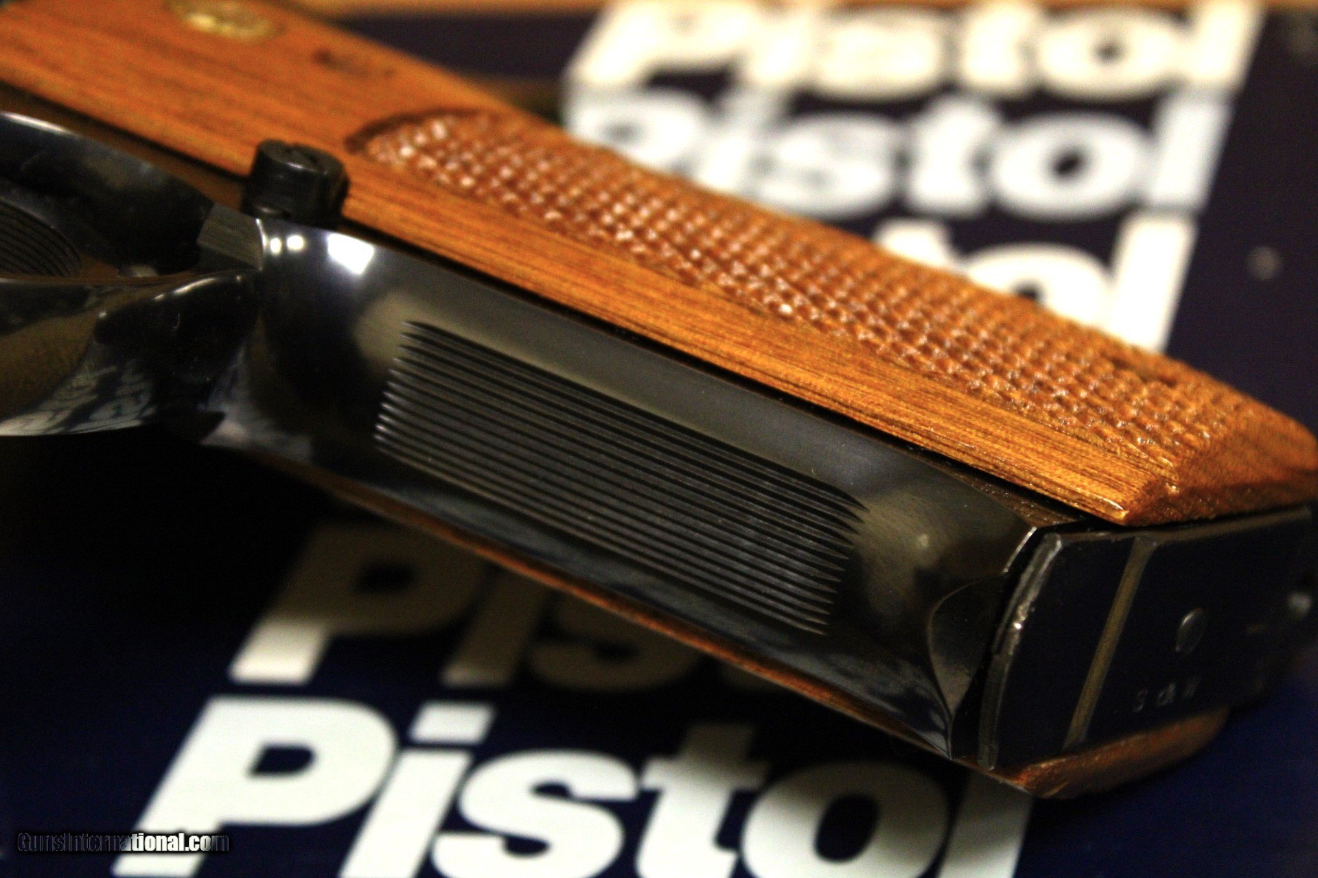 Description: The front sight has a Patridge-type top rear face with a serrated ramp leading up to it and is fixed to the slide. The rear sight is a target sight with a square notch, adjustable for windage and elevation, and is dovetailed into the slide. The grips are checkered walnut, each with an S & W medallion at the top. The grips are near pristine, and free of defects. The bore is bright and the rifling is sharp.In our opinion, this bore rates 9 out of 10. This handgun retains about 99% of its metal finish. There is a hairline mark on the left side of the slide, near the muzzle.The screw heads range from perfect to slightly marred. The markings are clear. The Smith & Wesson Model 52 (the .38 Master Single Action) is a serious target pistol designed to fire only .38 Special Wadcutter ammunition with the bullet seated flush with the case mouth. It was created in 1961 for the sport of NRA Bullseye shooting and retained the basic trigger mechanism of the Model 39, with the Double-Action disconnector removed, allowing the pistol to be fired in Single action only. The model was produced by S&W until the machinery used to manufacture it wore out and was considered to be too costly to replace. Fortunately, this Model 52 is like new and in pristine condition, possibly unfired. This is a great handgun, no longer produced by Smith & Wesson. All items are also available for sale in our brick & mortar store and are subject to prior sale. Think long, think wrong. Payment On firearms, we typically only accept credit cards or money orders/cashier's checks.