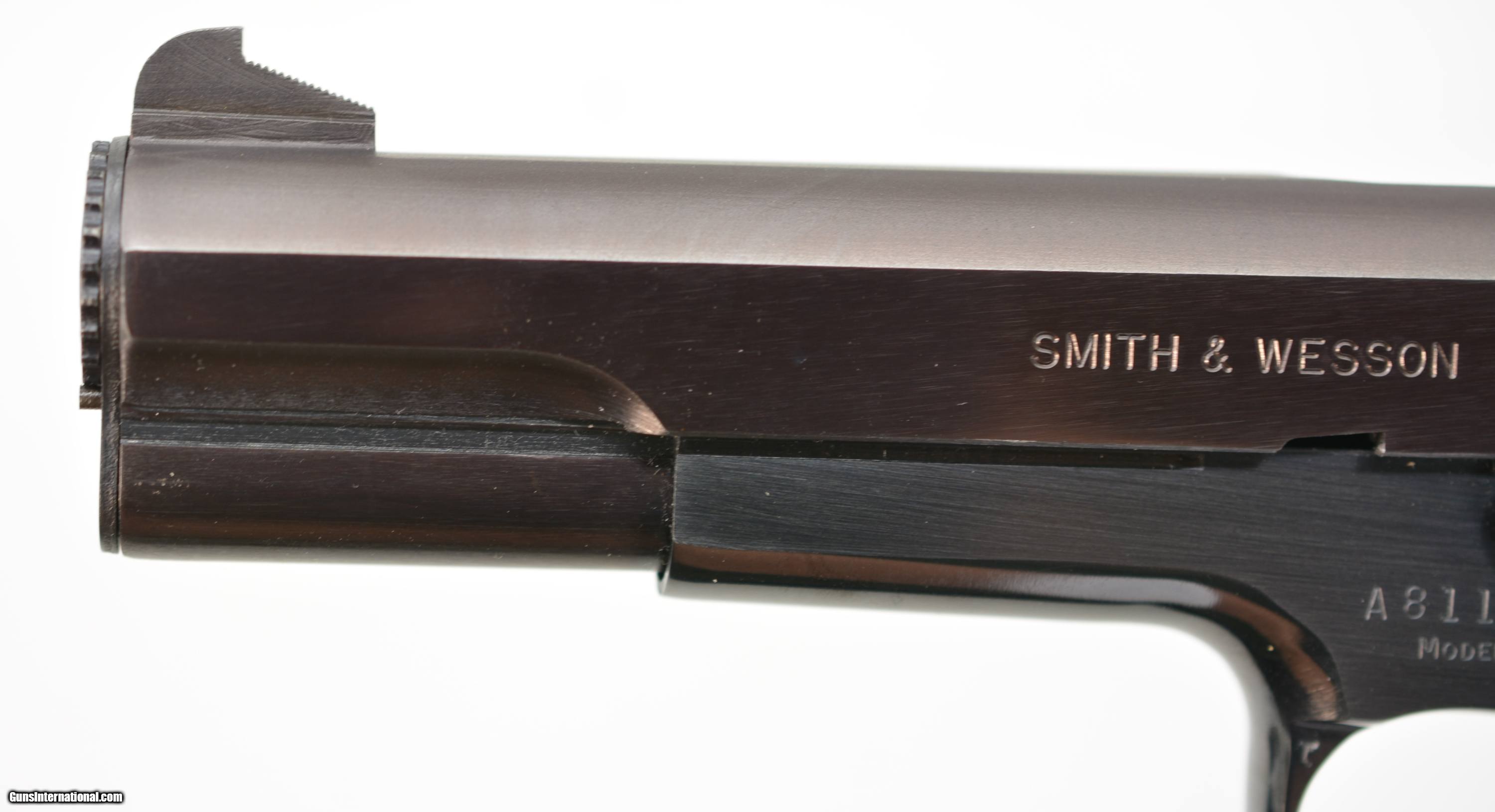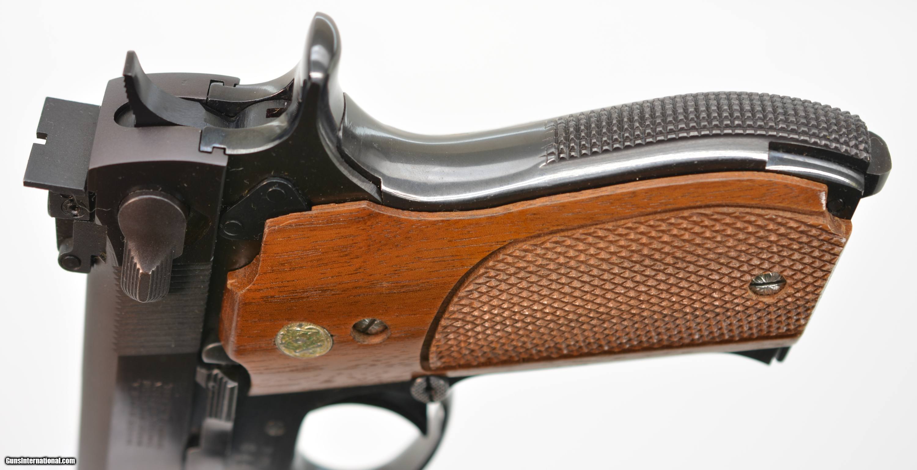 Description: Serial #A811770, .38 Special Wad Cutter, 5" barrel with a bright, excellent bore. This is the Smith and Wesson model 52-2 and features an efficient extractor system (added in 1971) along with an adjustable trigger stop, serrated hammer. The gun is in excellent plus condition with virtually all (99% plus) original finish remaining on the frame, grip and slide with crisp checkered walnut grips. The gun does not appear to have been fired more than a few times – perhaps at the factory. It would be difficult to find a nicer example. Included is the original factory box, paperwork and tool. FFL SOLD Manufacturer: S&W Model: 52 Caliber Info: .38 Spl Gauge Info: .38 Spl |