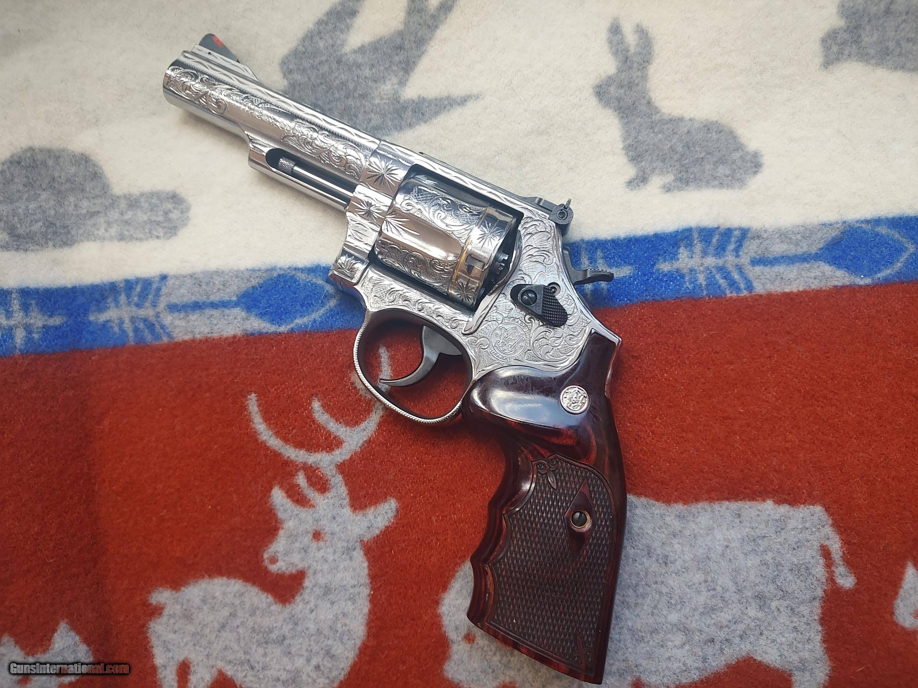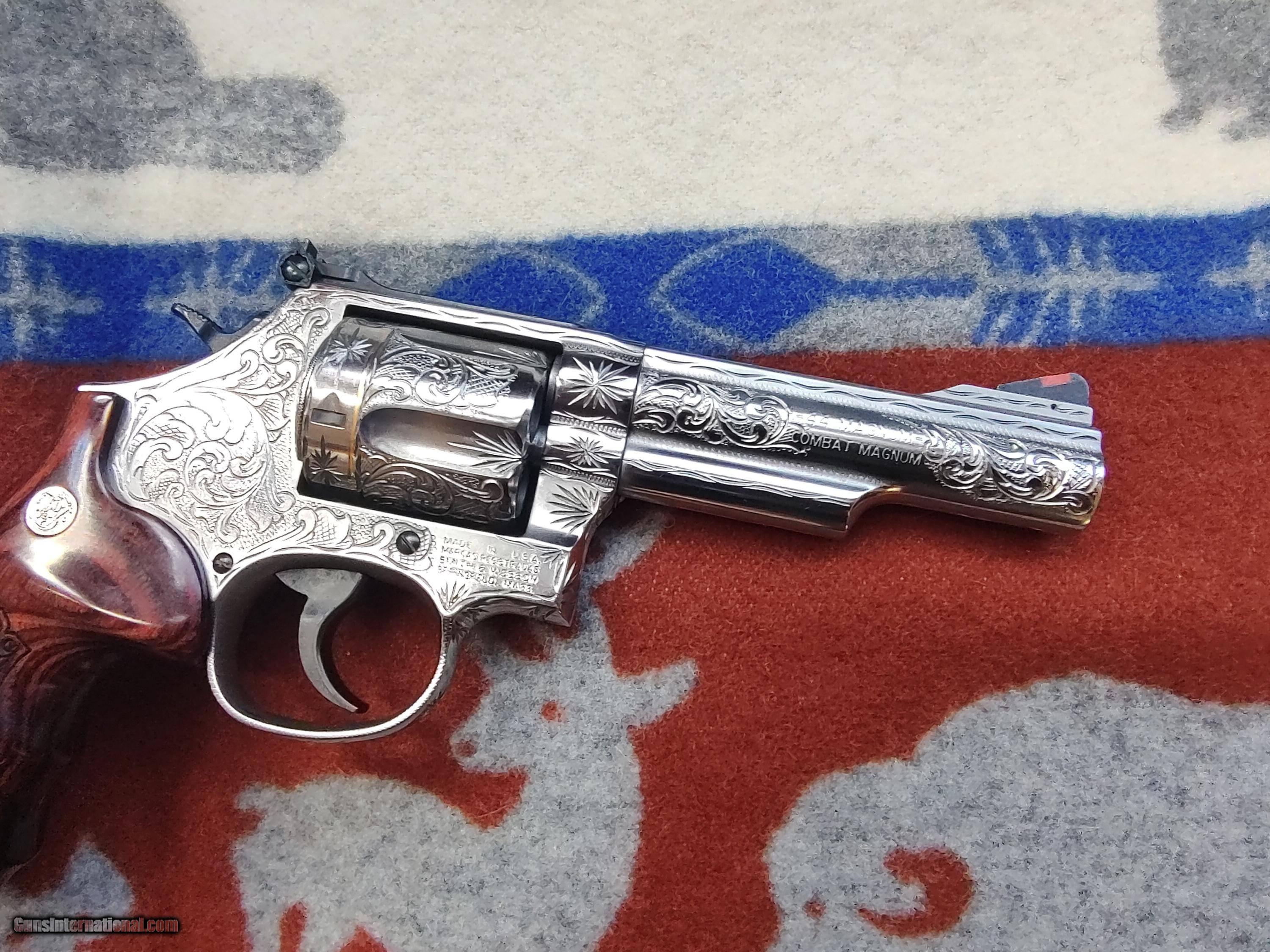 4 3/8 inch barrel, 5 shot 44 Magnum or 44 Special, with beautiful Rosewood S&W grips . Yes it is stainless steel but with the high polished stainless and a beautiful hand engraving it looks to be Nickel.