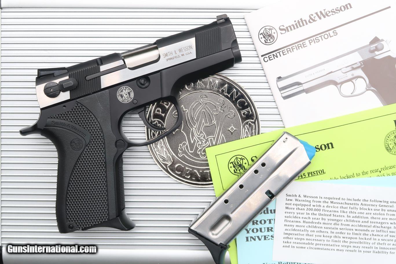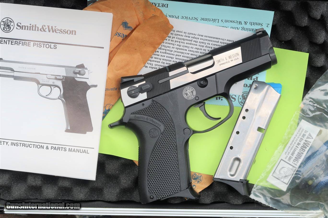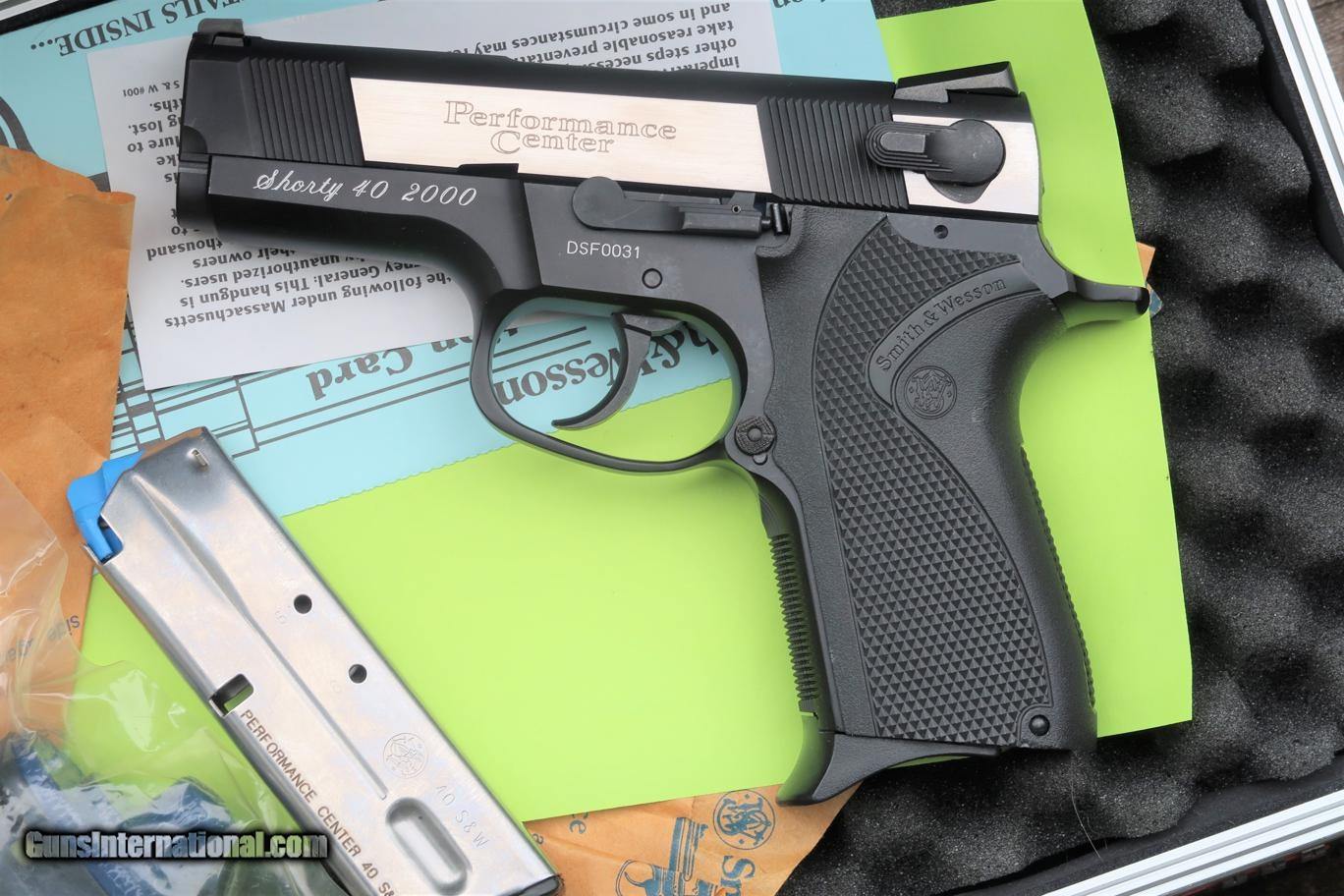 Description: Stunning early Dual tone "Shorty 40" was built by the S&W Performance Center to be distributed by Camfour in the year 2000. Though several other "Shorty 40" models were previously made, this was the first 2 tone variant, mating a stainless 2 tone blackened slide to an aluminum frame. Early and often copied features include a slide with front & rear serrations to enhance gripping, a drift adjustable front sight and a Novak rear sight, a system with three white dot highlighting. Ambidextrous decocker only (not a safety). Bobbed and lightened hammer. Bbl. stabilized with a hand fit Briley Bushing. Checkered frontstrap & mag. release. Black checkered wrap around plastic grips, each panel marked with the S&W name/logo. Frame is marked on left side "SHORTY 40 2000" followed by the SN & has the S&W Performance Center logo on the right side. Beveled mag well. Complete with factory 9 round magazines, safety lock, factory literature, aluminum Performance Center case, and original, matching, Performance Center shipping sleeve. Synopsis: Smith & Wesson, 2000 Shorty 40, Dual toned, Near new in Case, DSF0031, A-1669 Condition: Near New, certainly Excellent+, with just a few, very tiny, handling marks as imaged. Comparable condition spare magazine, literature, and still-sealed safety lock. Aluminum case with a few tiny scuffs, shipping sleeve with a missing flap. ~~Insured shipping fee of $65; most packages shipped using FedEx 2nd Day.~~ SOLD Manufacturer: Smith & Wesson Serial Number: DSF0031 Caliber Info: .40 S&W |