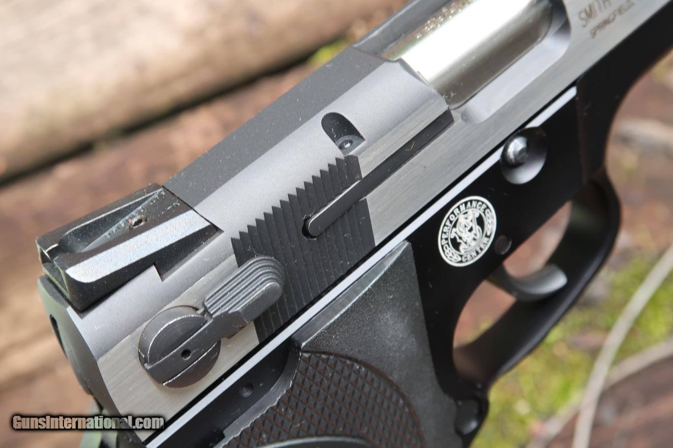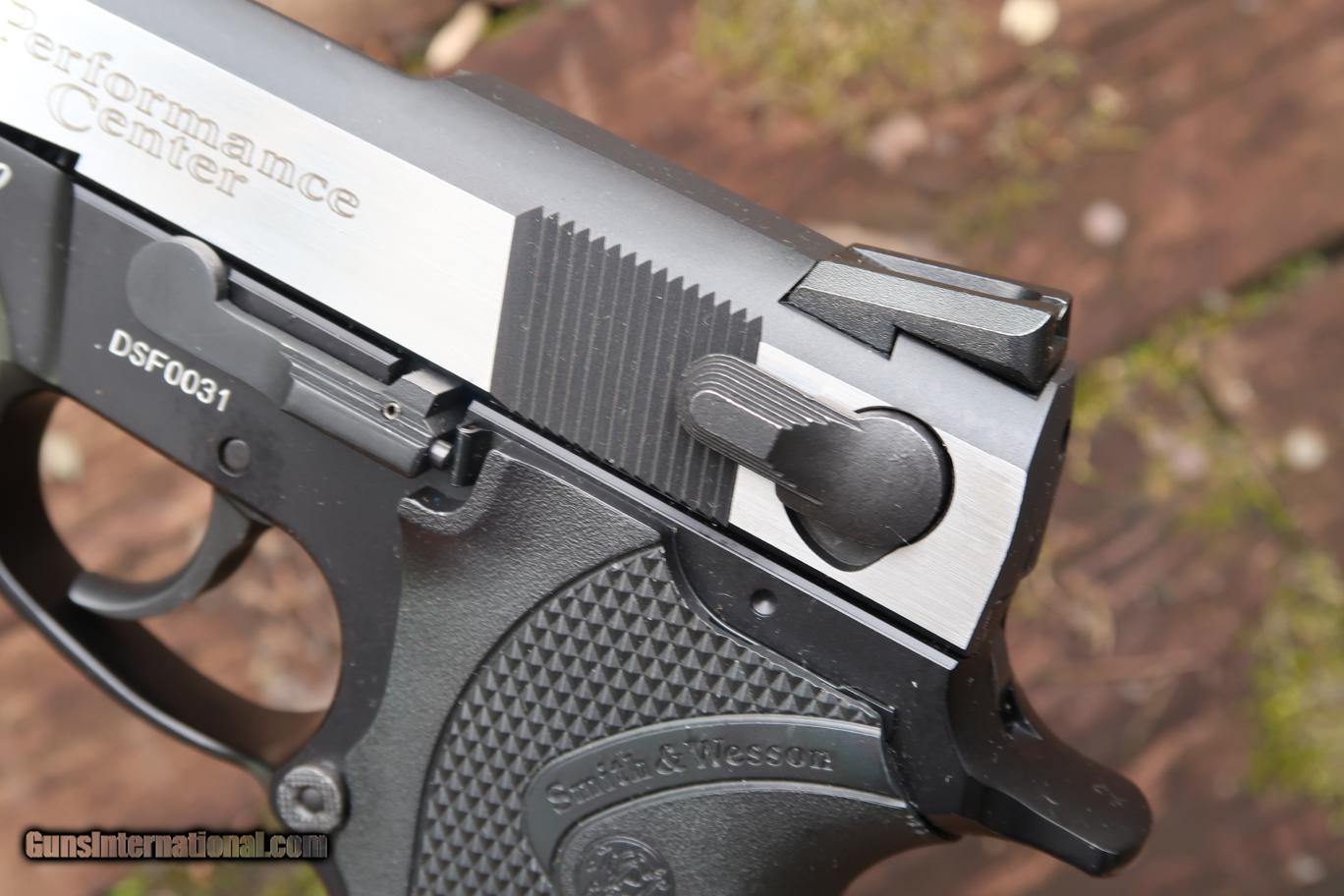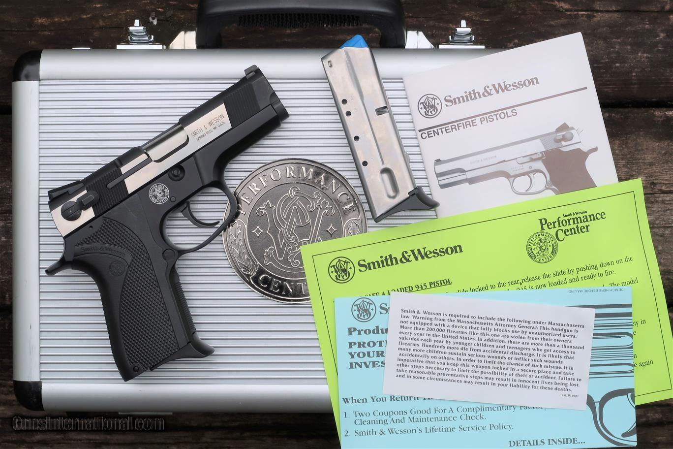 Description: Stunning early Dual tone "Shorty 40" was built by the S&W Performance Center to be distributed by Camfour in the year 2000. Though several other "Shorty 40" models were previously made, this was the first 2 tone variant, mating a stainless 2 tone blackened slide to an aluminum frame. Early and often copied features include a slide with front & rear serrations to enhance gripping, a drift adjustable front sight and a Novak rear sight, a system with three white dot highlighting. Ambidextrous decocker only (not a safety). Bobbed and lightened hammer. Bbl. stabilized with a hand fit Briley Bushing. Checkered frontstrap & mag. release. Black checkered wrap around plastic grips, each panel marked with the S&W name/logo. Frame is marked on left side "SHORTY 40 2000" followed by the SN & has the S&W Performance Center logo on the right side. Beveled mag well. Complete with factory 9 round magazines, safety lock, factory literature, aluminum Performance Center case, and original, matching, Performance Center shipping sleeve. Synopsis: Smith & Wesson, 2000 Shorty 40, Dual toned, Near new in Case, DSF0031, A-1669 Condition: Near New, certainly Excellent+, with just a few, very tiny, handling marks as imaged. Comparable condition spare magazine, literature, and still-sealed safety lock. Aluminum case with a few tiny scuffs, shipping sleeve with a missing flap. ~~Insured shipping fee of $65; most packages shipped using FedEx 2nd Day.~~ SOLD Manufacturer: Smith & Wesson Serial Number: DSF0031 Caliber Info: .40 S&W |