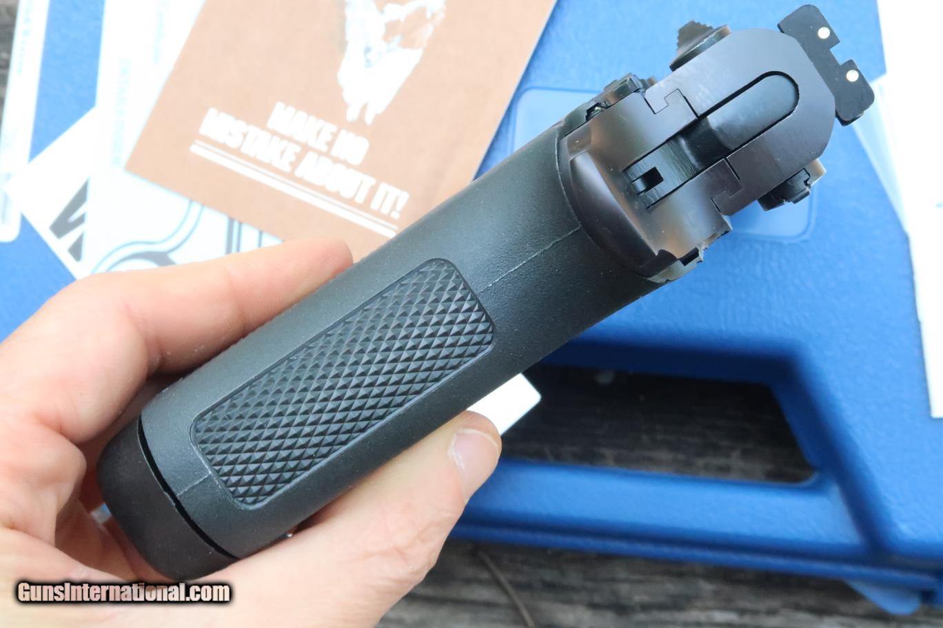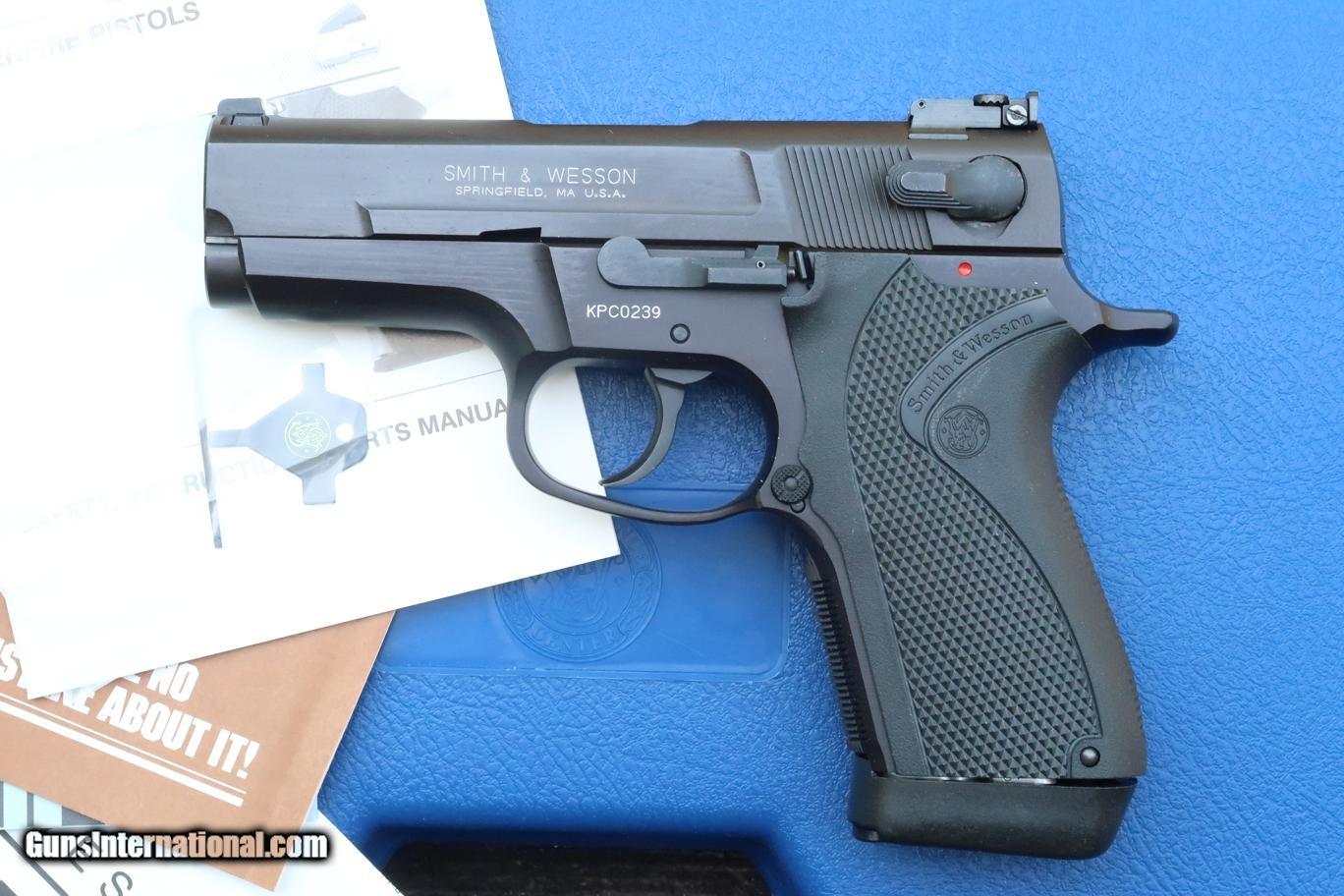 Description: Standard configuration 4006 in “Shorty 40” .40 S&W with 3.5” barrel, drift adjustable front sight and fully adjustable rear sight, each with white dotted highlights. Ambidextrous safety/decocker, bobbed hammer and black plastic wrap around grips, each with the S&W name and logo. Fitted with 11 round magazine, marked by the Performance Center, caliber noted, with indicator holes: 3 on the left side marked 6, 8, and 10: 5 on the right side marked 4, 5, 7, 9, and 11. Complete with factory literature, screwdriver/allenhead wrench, and PC blue case with factory end label matched to pistol. Synopsis: Smith & Wesson M4006 Derivative as offered through the Performance Center, this example being a third variation pistol with “Shorty .40 mk3” on the right side of the slide, estimated production 500 guns. Condition: As new with no discernable external wear. Mirror bore. Perfect manual mechanics. Comparable condition literature. Box with a few surface scuffs. A virtually new S&W Shorty 40, a classic out-of-production pistol with all factory literature and matching case. ~~Insured shipping fee of $65; most packages shipped using FedEx 2nd Day.~~ SOLD Manufacturer: Smith & Wesson Serial Number: KPC0239 Caliber Info: .40 S&W |