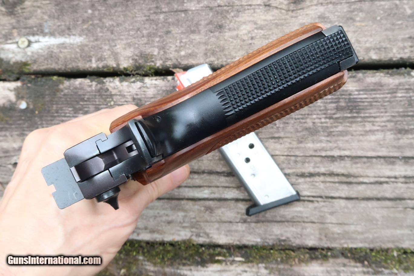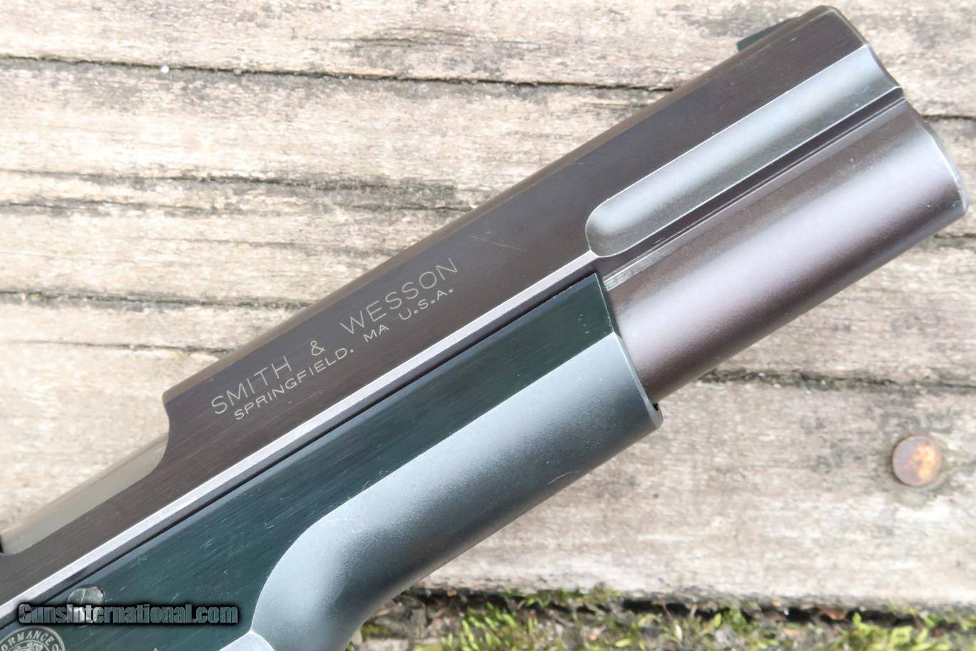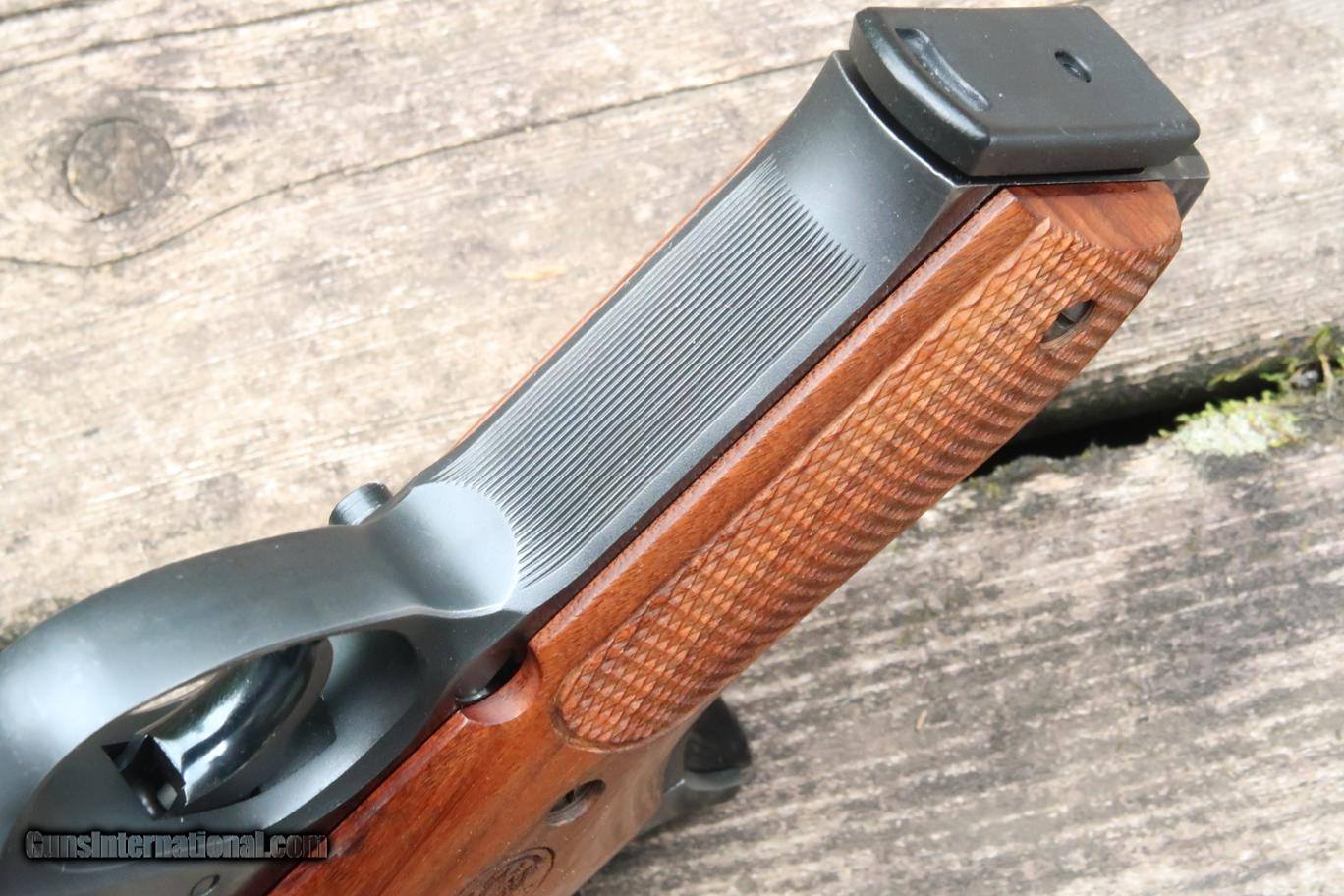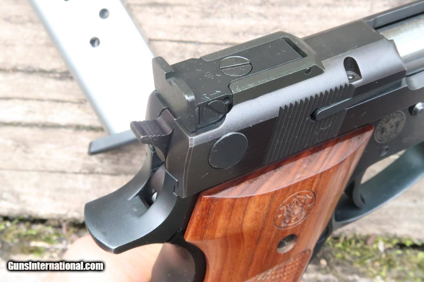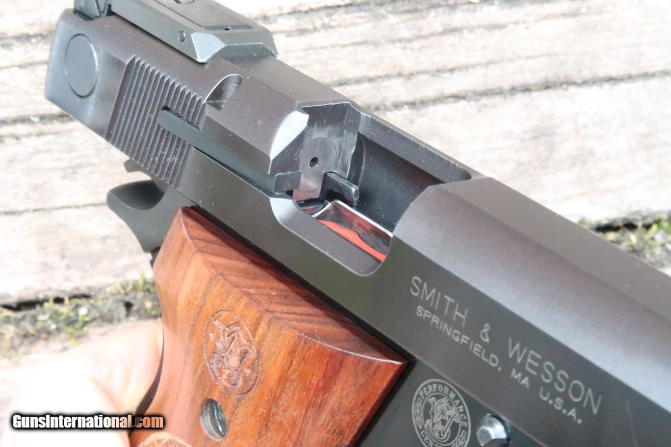 Excellent with 99% original finish showing sharp edge wear and handling marks as one would expect from a lightly used target gun with a mirror bright bore and perfect manual mechanics. Comparable condition grips, magazines, case, and literature. A modern but top -tier classic pistol sure to please any S&W collector or accuracy fanatic.