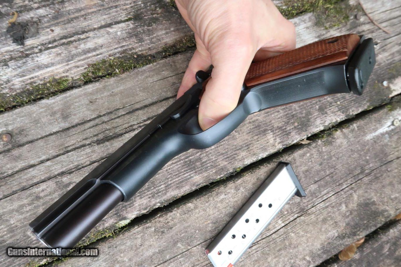 Description: Description: S&W released its 952 series through the Performance Center in 2000, billing the gun as “the most accurate 9mm in the world”. Total production has been cited at 1,735 pistols. This example, a 952-1, made in 2002 as reflected by the fired case seal, has the usual 5” barrel, drift adjustable front sight, and fully adjustable Wilson Combat rear sight. Left side of slide marked Performance Center suffixed by 9(mm)52. The full serial number is on the left side of the frame, exposed chamber marked with caliber and “Performance”. Performance Center seal and “952-1” on the right side of the frame. Major and most minor components are blued except the barrel that is in the white. Slab S&W checkered panels. In-the-white magazines, primary and spare, with eight indicator holes numbered 2-9, an orange/red follower, and a plastic polymer floorplate. Complete with factory literature, fired cartridge, and PC aluminum case. Synopsis: Smith & Wesson, S&W, Model 952-1, Performance Center Cased with Spare Magazine and Literature. Condition: Excellent with 99% original finish showing sharp edge wear and handling marks as one would expect from a lightly used target gun with a mirror bright bore and perfect manual mechanics. Comparable condition grips, magazines, case, and literature. A modern but top -tier classic pistol sure to please any S&W collector or accuracy fanatic. SOLD Manufacturer: Smith & Wesson Serial Number: KAZ0690 Caliber Info: 9mmP |