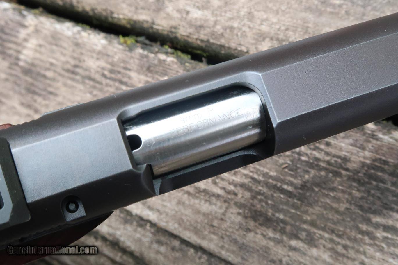 S&W released its 952 series through the Performance Center in 2000, billing the gun as “the most accurate 9mm in the world”. Total production has been cited at 1,735 pistols. This example, a 952-1, made in 2002 as reflected by the fired case seal, has the usual 5” barrel, drift adjustable front sight, and fully adjustable Wilson Combat rear sight. Left side of slide marked Performance Center suffixed by 9(mm)52. The full serial number is on the left side of the frame, exposed chamber marked with caliber and “Performance”. Performance Center seal and “952-1” on the right side of the frame. Major and most minor components are blued except the barrel that is in the white. Slab S&W checkered panels. In-the-white magazines, primary and spare, with eight indicator holes numbered 2-9, an orange/red follower, and a plastic polymer floorplate. Complete with factory literature, fired cartridge, and PC aluminum case.