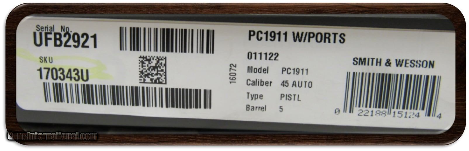 Description: Guns Listing ID: 742378 SMITH & WESSON PC1911 PERFORMANCE CENTER - 45 ACP - 8-ROUNDS - 5\" BARREL HAMMER-FIRED SINGLE-ACTION SEMI-AUTO PISTOL INCLUDES S&W HARD-CASE W/ OWNER‚‚S MANUAL Smith & Wesson‚‚s premium version of the classic 1911, the SW1911 E-Series is a line of single-action semi-automatic handguns chambered in 45 ACP with an 8+1 capacity and a frame constructed from steel. The checkered wood laminate grip employs a positive hold and includes a thumb and beaver-tail grip safety. Other features include an external extractor, skeletonized hammer and trigger, and front slide serration SOLD Manufacturer: SMITH & WESSON Model: PC1911 PERFORMANCE CENTER Caliber Info: .45 ACP Condition: Used - Non-Certified Barrels: 5 BARREL Finish: STAINLESS |