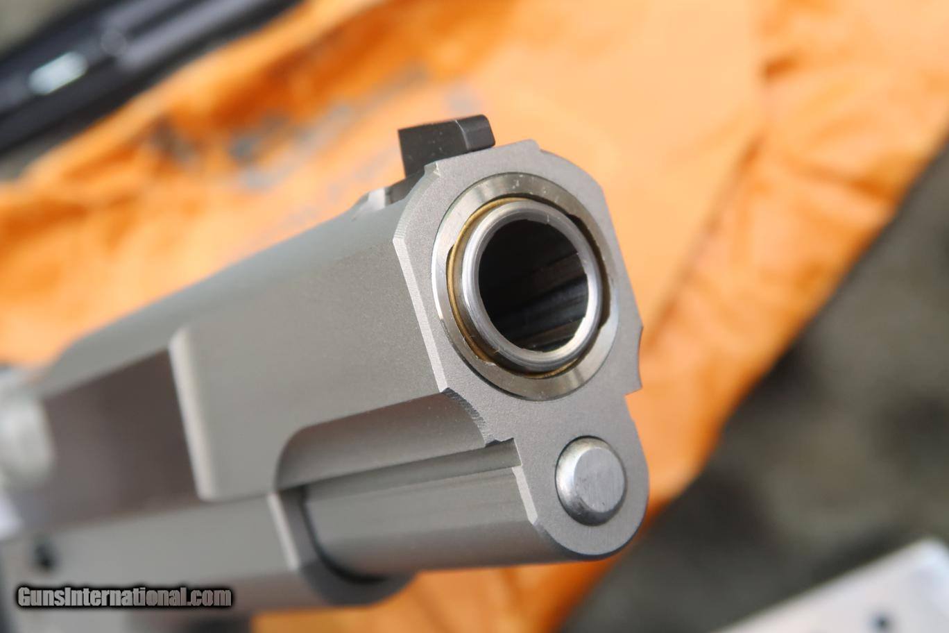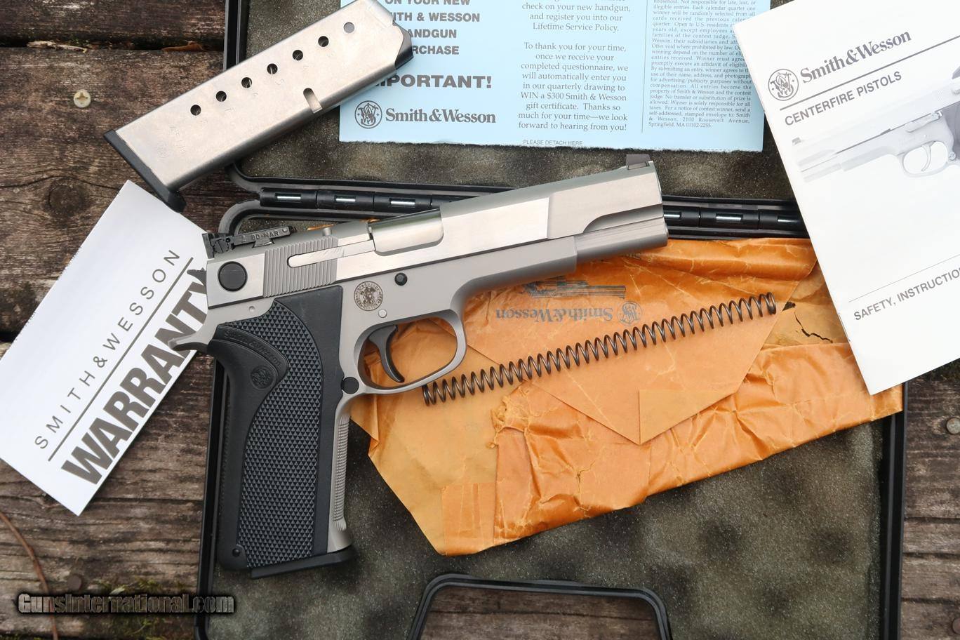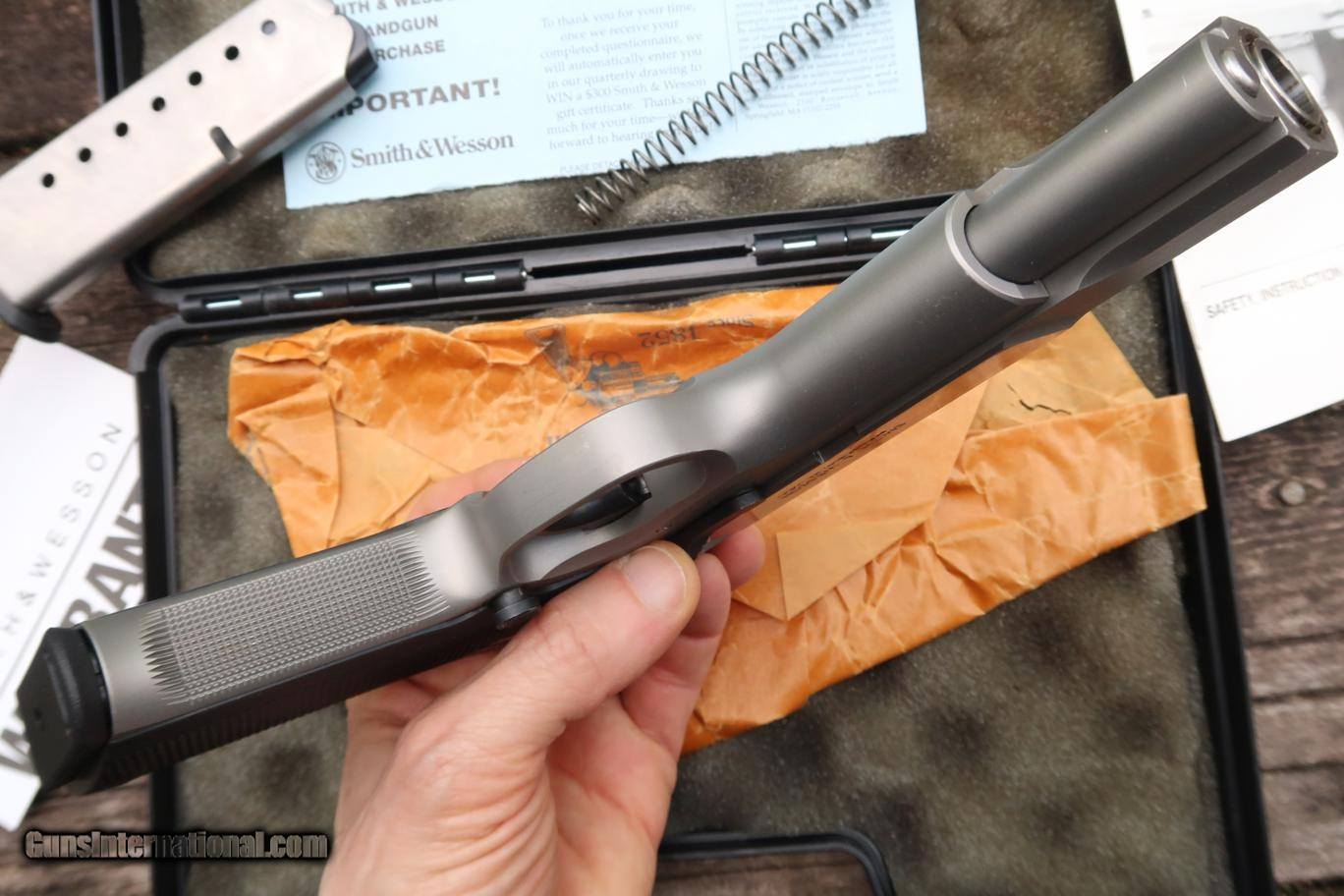 Description: Attractive and super desirable Performance Center 845, which is a full target version of the popular model 745, this designated the 845 Limited. Stainless construction. Slide with Bo-Mar low profile sights. Left side controls. Extended beavertail. Checkered front strap. Checkered wrap around high impact plastic grip. Extended mag. release. Bevelled mag. well. Frame and magazines marked w/ Performance Center logos. These guns were shipped w/ an extra recoil spring, which is included, along with a spare magazine, paperwork and the original, matching, black Performance Center carrying case. Synopsis: Smith & Wesson, Model 845, Performance Center, .45 ACP, MPC0418, A1656 Condition: Excellent + with just the minute handling marks. The only way to upgrade would be to purchase an example that was NIB. ~~Insured shipping fee of $75; most packages shipped using FedEx 2nd Day.~~ SOLD Manufacturer: Smith & Wesson Serial Number: MPC0418 Caliber Info: .45 ACP |