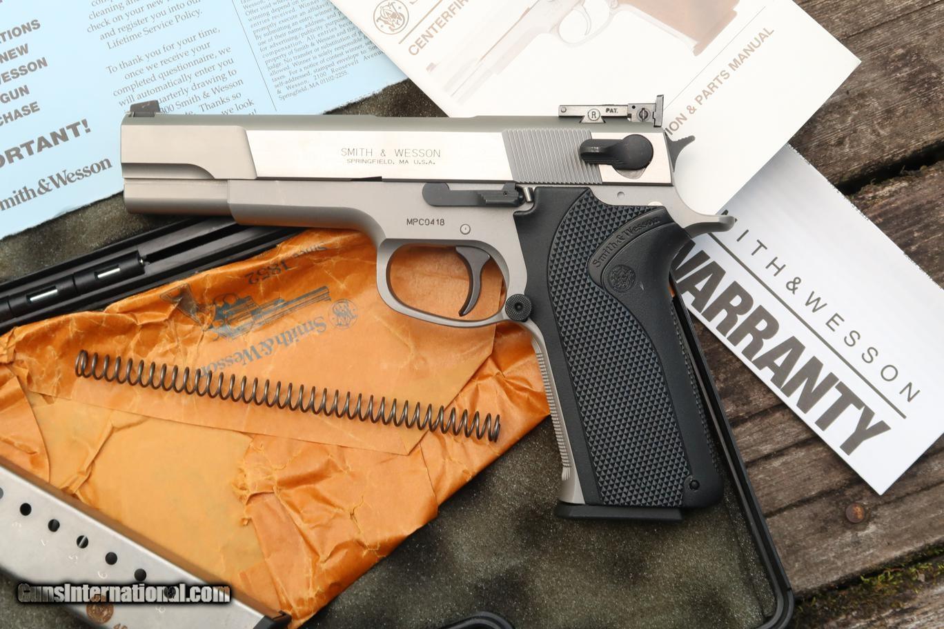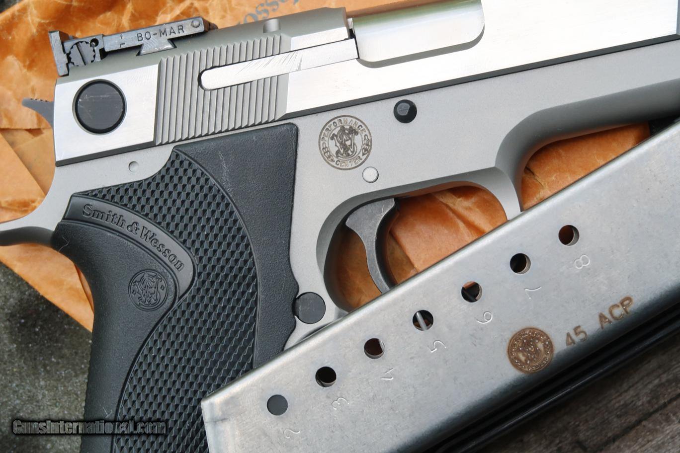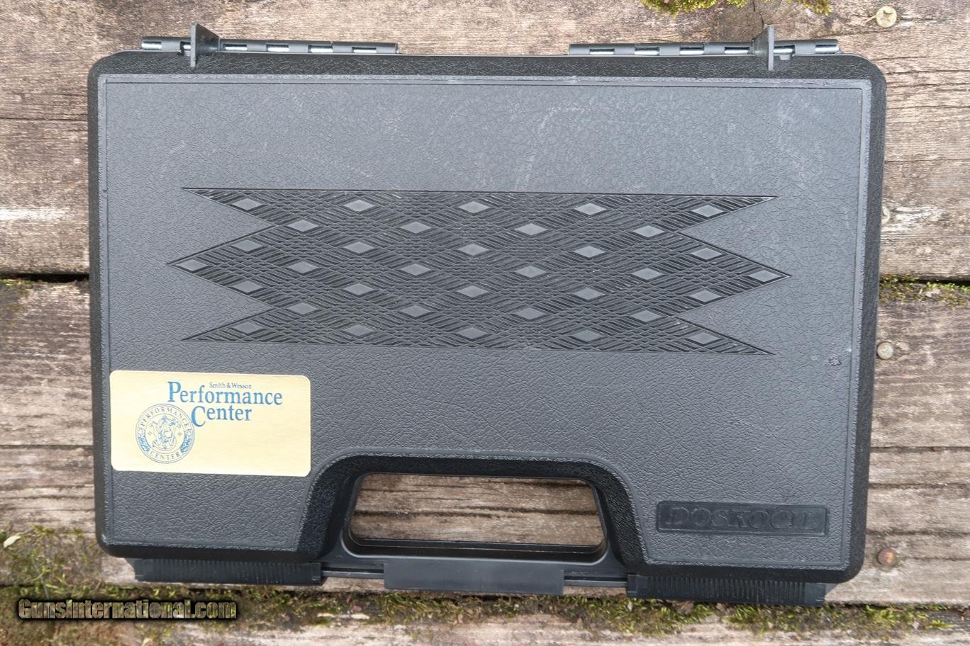 Description: Attractive and super desirable Performance Center 845, which is a full target version of the popular model 745, this designated the 845 Limited. Stainless construction. Slide with Bo-Mar low profile sights. Left side controls. Extended beavertail. Checkered front strap. Checkered wrap around high impact plastic grip. Extended mag. release. Bevelled mag. well. Frame and magazines marked w/ Performance Center logos. These guns were shipped w/ an extra recoil spring, which is included, along with a spare magazine, paperwork and the original, matching, black Performance Center carrying case. Synopsis: Smith & Wesson, Model 845, Performance Center, .45 ACP, MPC0418, A1656 Condition: Excellent + with just the minute handling marks. The only way to upgrade would be to purchase an example that was NIB. ~~Insured shipping fee of $75; most packages shipped using FedEx 2nd Day.~~ SOLD Manufacturer: Smith & Wesson Serial Number: MPC0418 Caliber Info: .45 ACP |