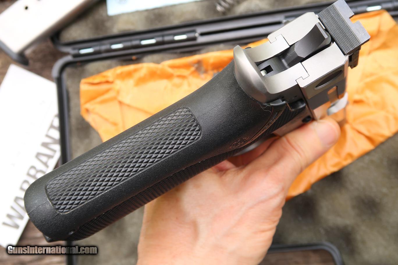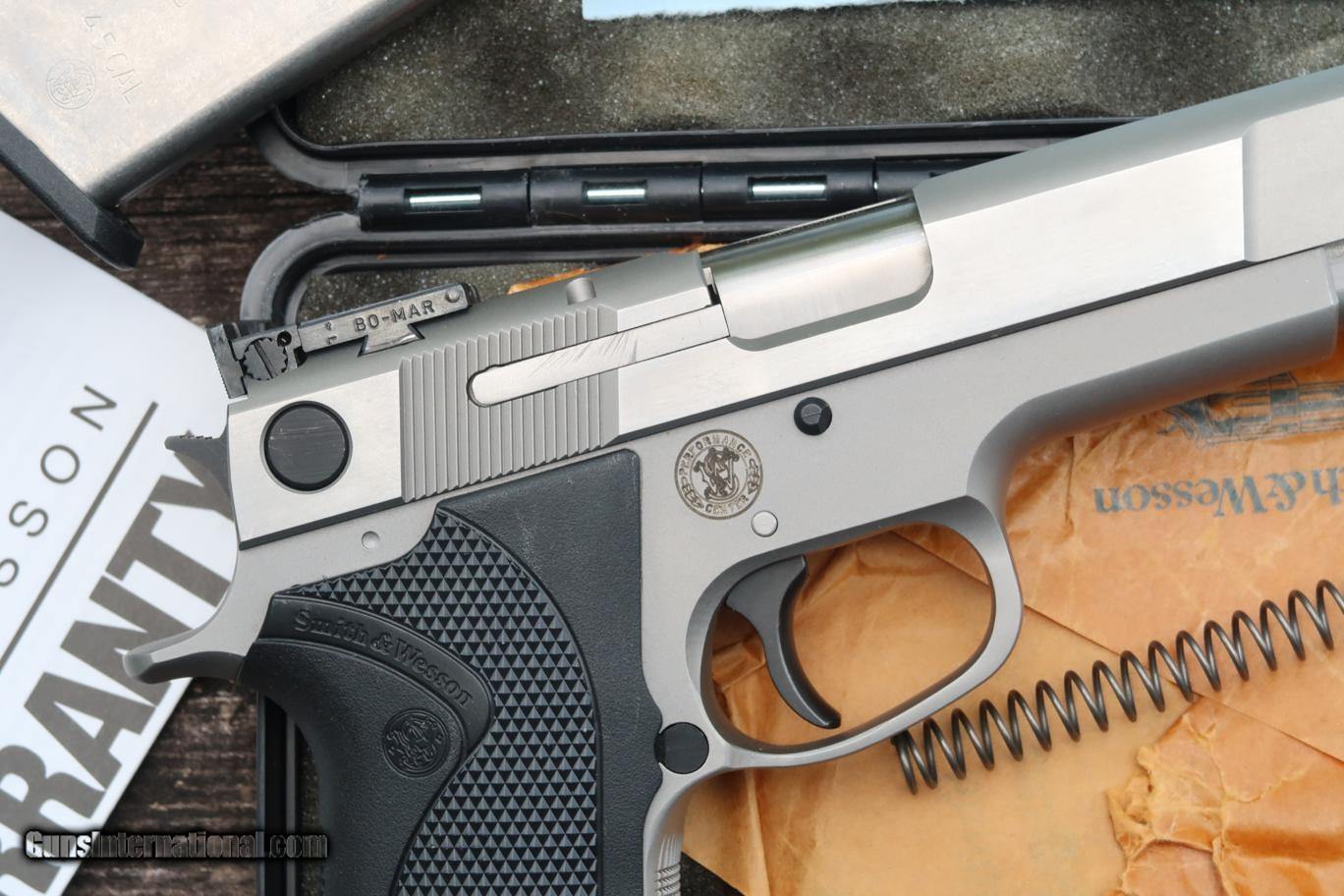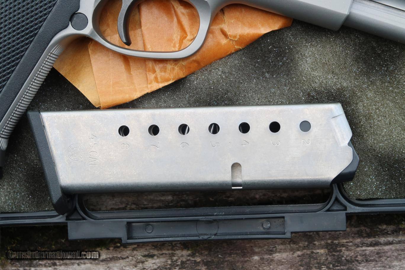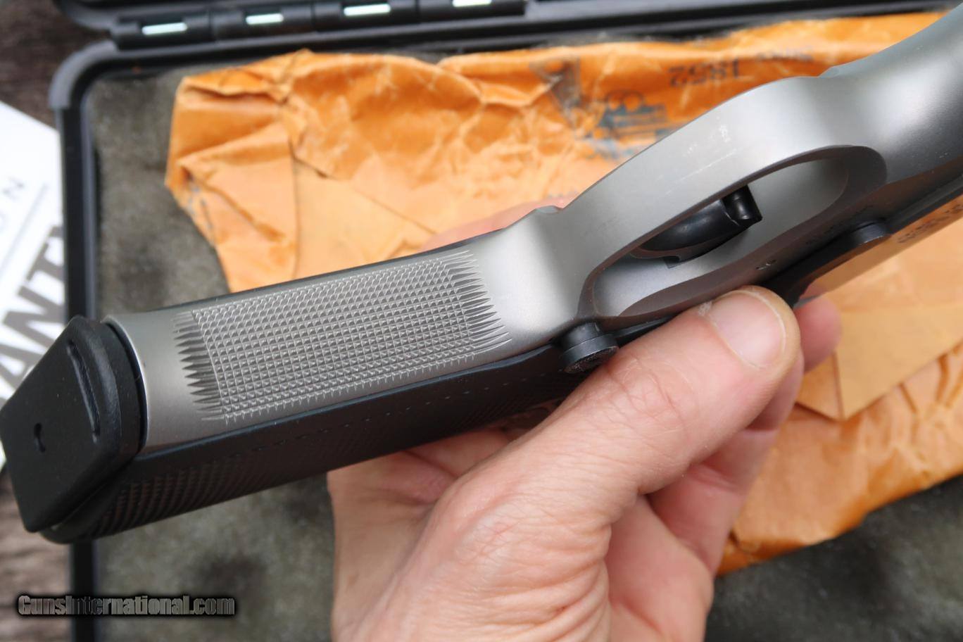 Description: Attractive and super desirable Performance Center 845, which is a full target version of the popular model 745, this designated the 845 Limited. Stainless construction. Slide with Bo-Mar low profile sights. Left side controls. Extended beavertail. Checkered front strap. Checkered wrap around high impact plastic grip. Extended mag. release. Bevelled mag. well. Frame and magazines marked w/ Performance Center logos. These guns were shipped w/ an extra recoil spring, which is included, along with a spare magazine, paperwork and the original, matching, black Performance Center carrying case. Synopsis: Smith & Wesson, Model 845, Performance Center, .45 ACP, MPC0418, A1656 Condition: Excellent + with just the minute handling marks. The only way to upgrade would be to purchase an example that was NIB. ~~Insured shipping fee of $75; most packages shipped using FedEx 2nd Day.~~ SOLD Manufacturer: Smith & Wesson Serial Number: MPC0418 Caliber Info: .45 ACP |