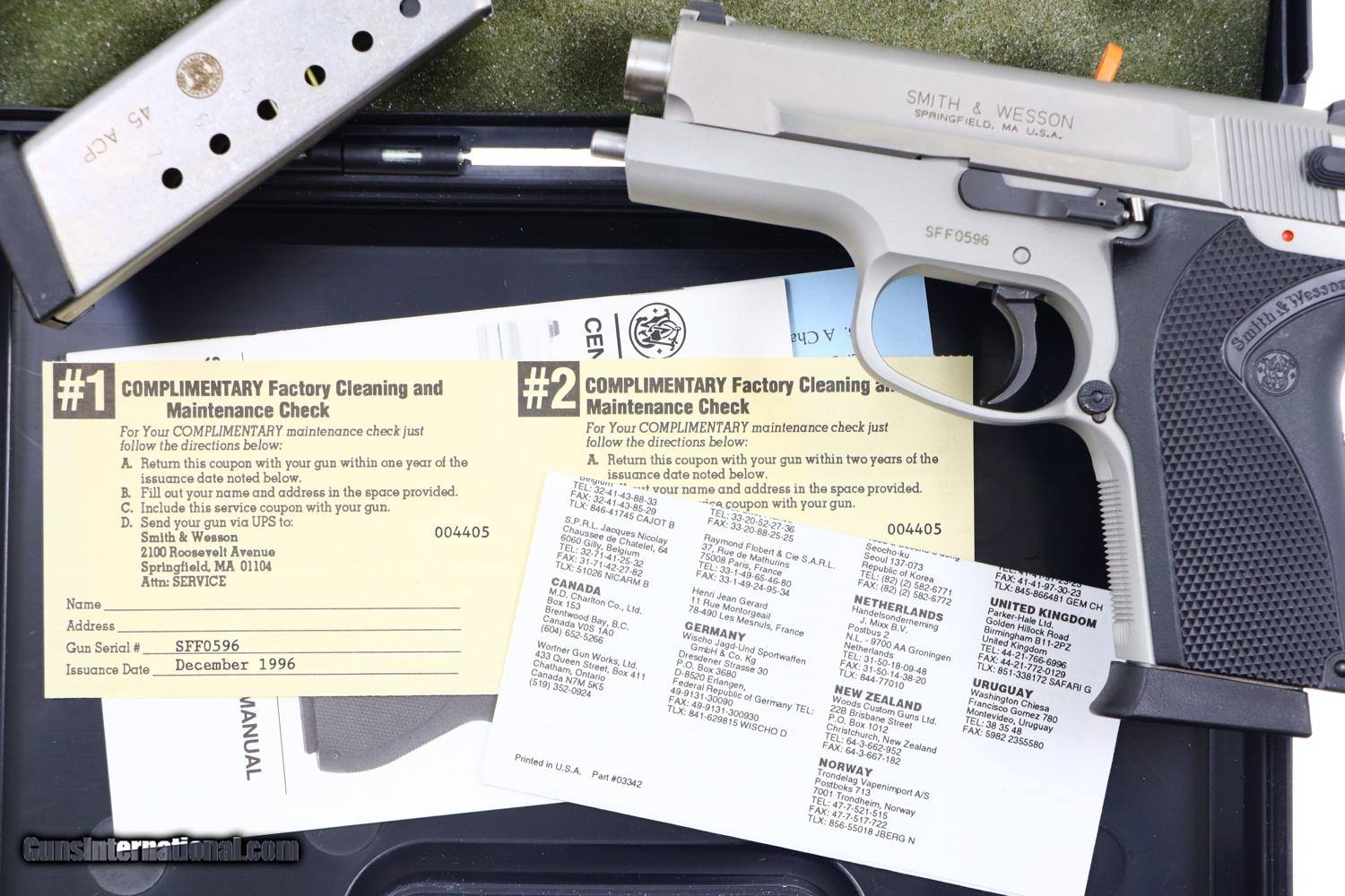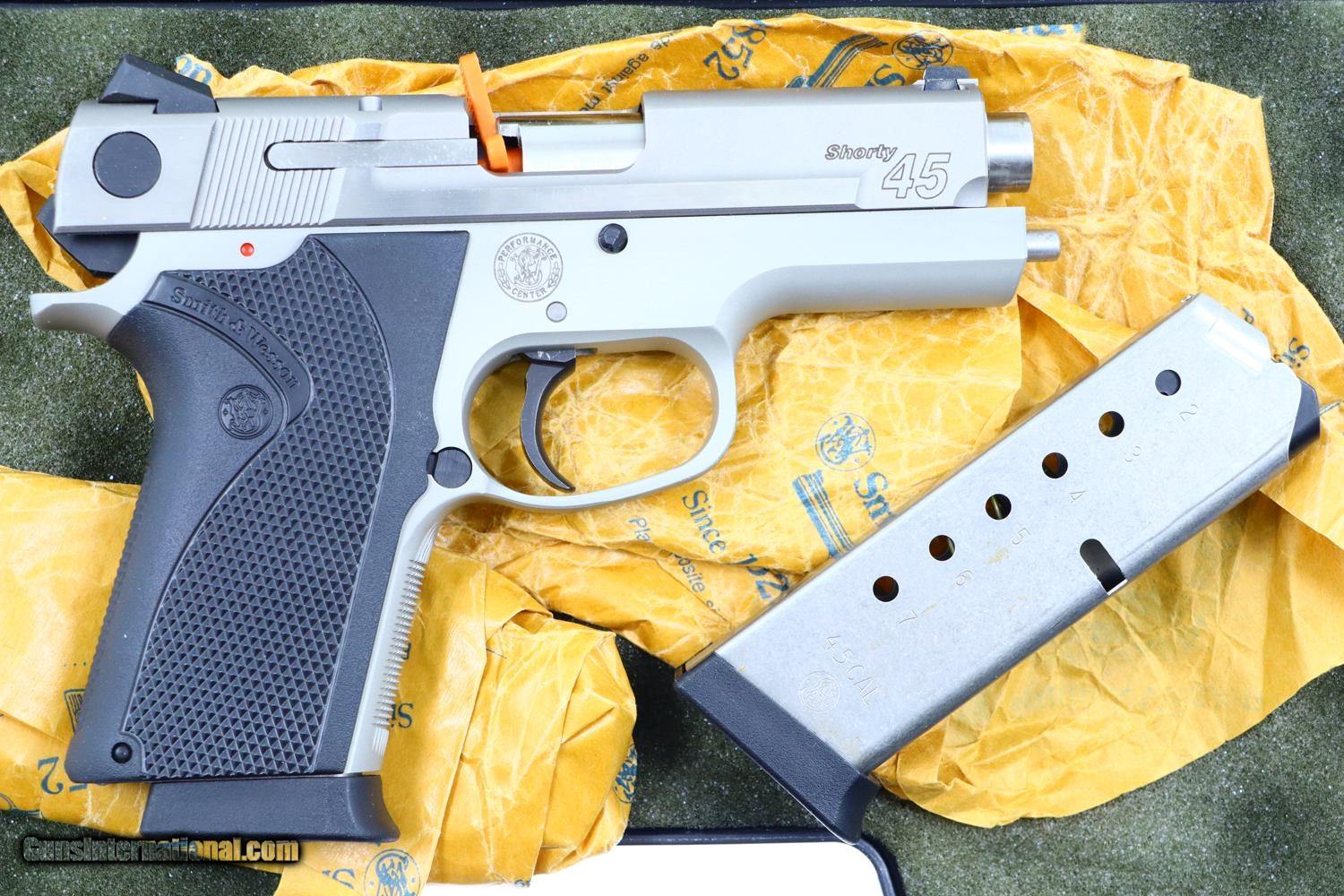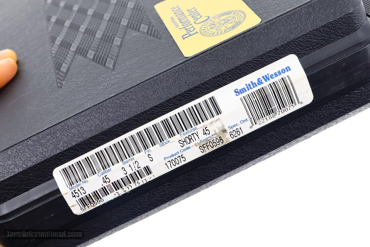 Description: Synopsis: Smith & Wesson, S&W, Shorty 45, Performance Center, SFF0596, FB00997 Description: Bbl. 3.75", marked "Performance Center". This Model 4513, a limited edition pistol released by the S&W Performance Center, has been branded the 'Shorty 45'. This line compact pistols was produced exclusively for Lew Horton Distributor; 1179 units S# SFF0001-SFF1179. These guns were delivered Sept. 25, 1996 to S&W Promotional Department in Springfield, MA to be used at various shooting clubs to promote the model. The pistol has a 3.75 inch barrel, hand fitted for uniform repositioning by a spherical bushing at the front of the slide. Novak LoMount 3 dot sights. Alloy frame with left side controls. S&W checkered black plastic wrap around grip & checkered frontstrap. Bevelled magazine well. Complete with 2 factory 7-round magazines, factory literature, and original matching shipping box. A fantastic, as new package for the most discerning collector and shooter! Condition: Virtually new, the pistol still retaining the original orange chamber flag. Mirror bore. Perfect manual mechanics. Comparable condition case and factory literature. ~~Insured shipping fee of $65; most packages shipped using FedEx 2nd Day.~~ SOLD Manufacturer: S&W Serial Number: SFF0596 Caliber Info: .45ACP |
