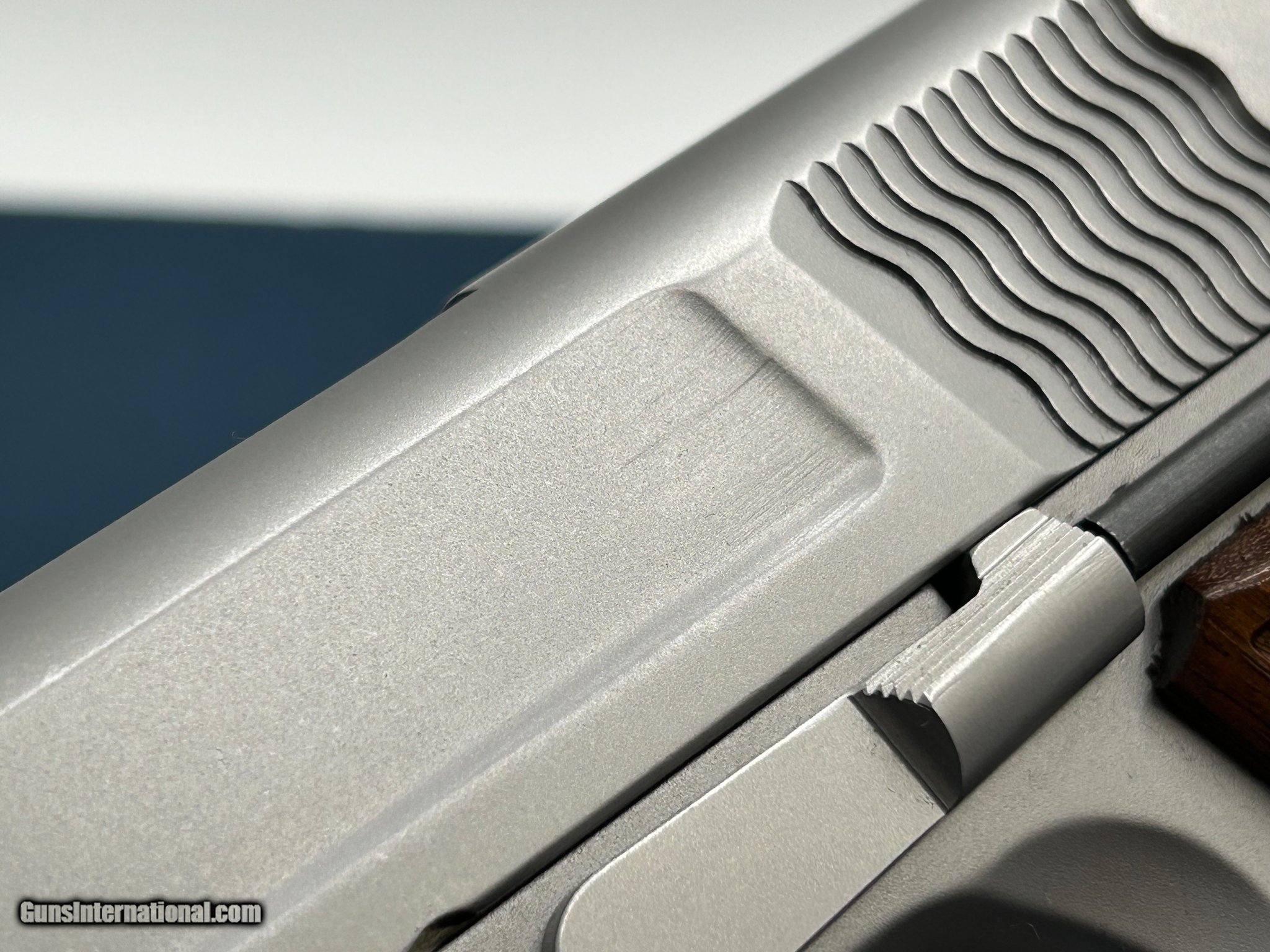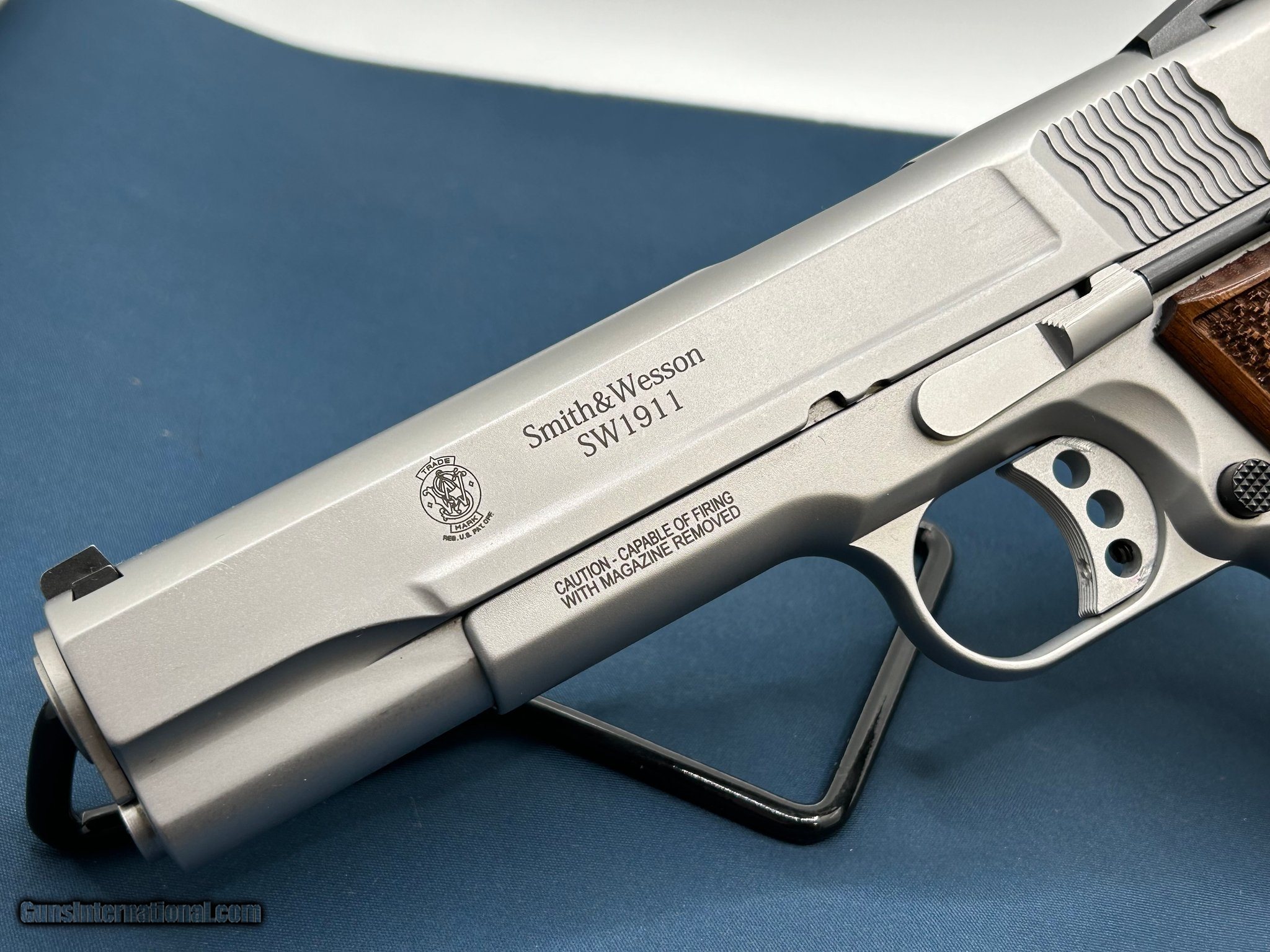 Description: Guns Listing ID: 1364556 Specifications: CALIBER: 9MM SIZE: FULL CAPACITY: 10 ACTION: SINGLE ACTION BARREL LENGTH: 5 GRIP: WOOD SIGHTS: WHITE DOT OPTIC READY: NO SAFETY: GRIP & THUMB COLOR/FINISH: SILVER STATE COMPLIANCE: CO,CT,DE,HI,MD,MA,NJ,NY,OR,RI,VT,WA THREADED BARREL: NO BARREL MATERIAL: STAINLESS STEEL FRAME: STAINLESS STEEL LASER: NO PERFORMANCE CENTER: YES NUMBER OF MAGAZINES: 2 SOLD Manufacturer: SMITH & WESSON Model: SW1911 PERFORMANCE CENTER PRO Caliber Info: 9MM LUGER (9X19 PARA) Condition: Used - Non-Certified Barrels: 5 BARREL |