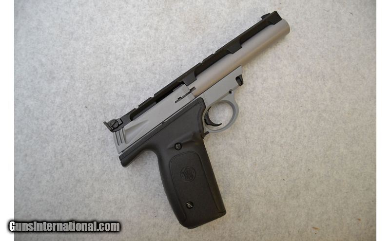 Description: Great condition overall. The finish has a few handling marks; mostly the kind associate with handling. There is a bit of scuffing on the mounting rail but is only cosmetic. Grips are in great shape as well with little to no signs of wear. .22 Long Rifle SOLD Chambers: Semi-automatic fed from detachable magazines. Metal Condition: Very good. Wood Condition: Grips are in excellent condition. Bore Condition: Excellent with healthy shine and strong lands/grooves. Barrels: 5½" Heavy target in satin grey. Triggers: Wide matte black polymer with grooved surface. Butt Pad: Wrap-around black rubber grip panels. Weight: 2lbs 14oz Sights: Fixed front blade and adjustable rear notch. Full length Weaver style rail for optics mounting. Chokes: N/A Item Location: Green Bay |