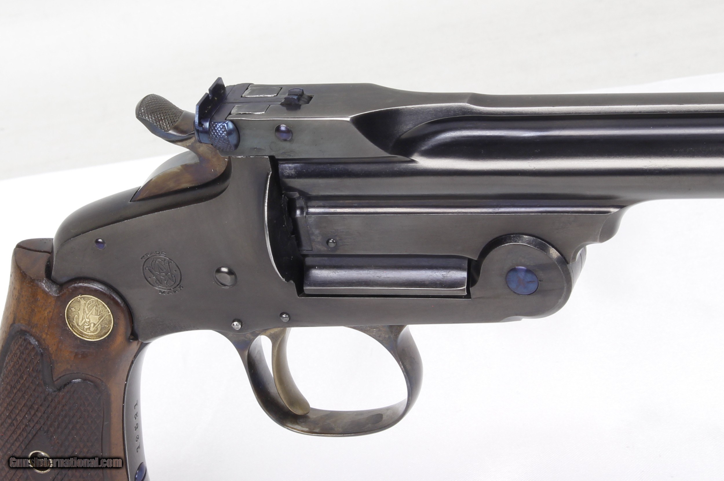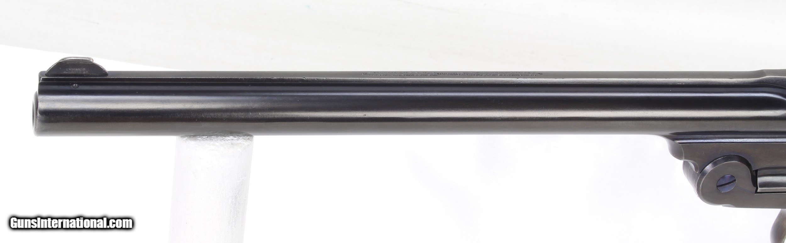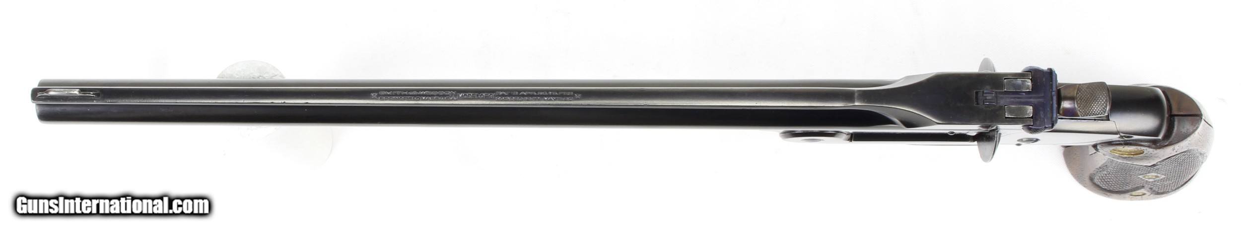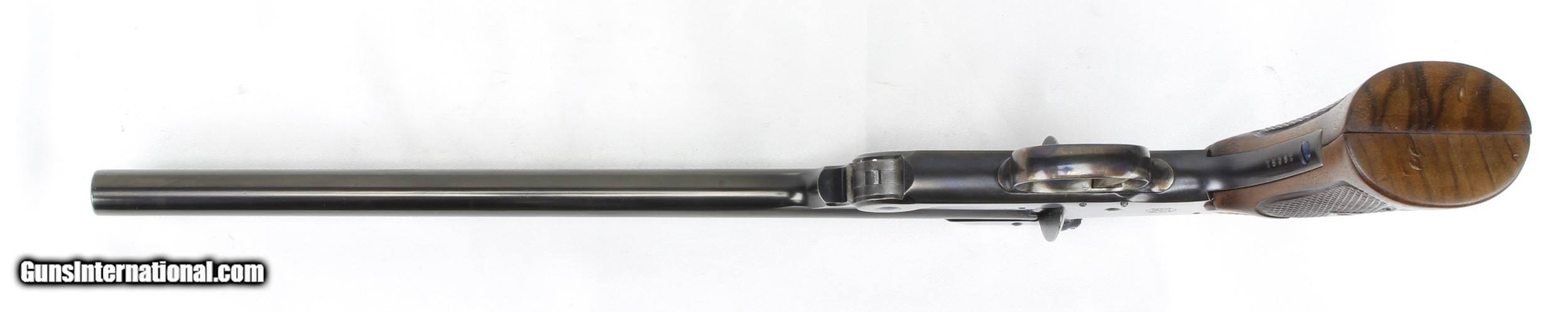Description: Smith & Wesson Model of 91 Single Shot 1st Model Pistol in .22LR. SN #19521. Mfg. 1893-1905. 10" Barrel with an EXCELLENT Bore for it's age. Factory Straw Colored Trigger. Factory Case Colored Trigger Guard. The Blued Metal Finish has been RESTORED by SHOOTER'S EXCHANGE and LOOKS GREAT. Walnut grips were standard on 3rd Model Pistols as 1st Models came with Hard Rubber Grips. Side Plate on left side of frame. Recoil Shield. Single Action Trigger. ONLY 862 MADE. Weight: 1.46 lbs. Trigger Pull: 2.9 lbs. More photos available upon request. Ships to Lower 48 W/ Insurance $30.00. SOLD Curio/Relic: Yes Handgun Caliber: .22 Long Rifle Manufacturer: Smith & Wesson Model: Model of 91 Serial Number: 19521 Barrel Length: 10 Condition: Excellent Metal Condition: Refinished Wood Condition: Excellent Bore Condition: Excellent for Age Action: Single Shot Finish: Blue Weight: 1.46 lbs. Manufacture Date: 1893-1905 |