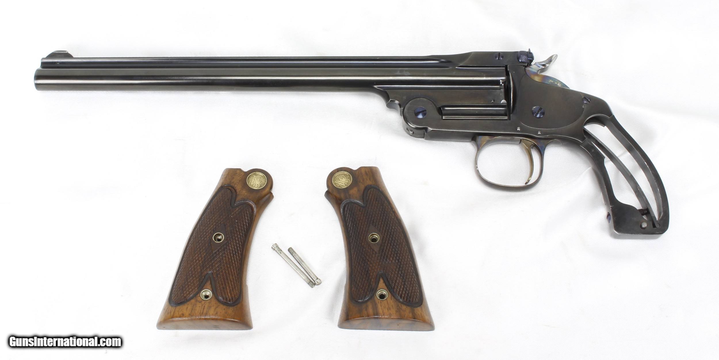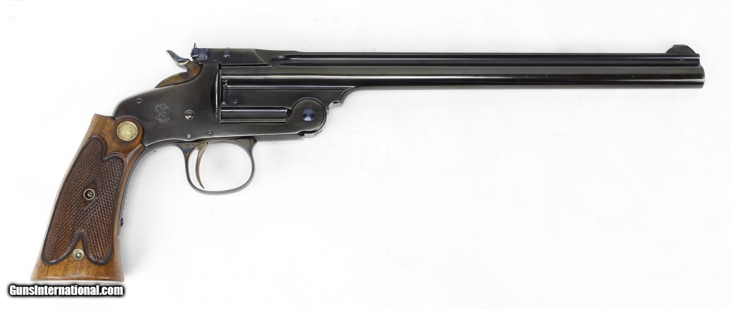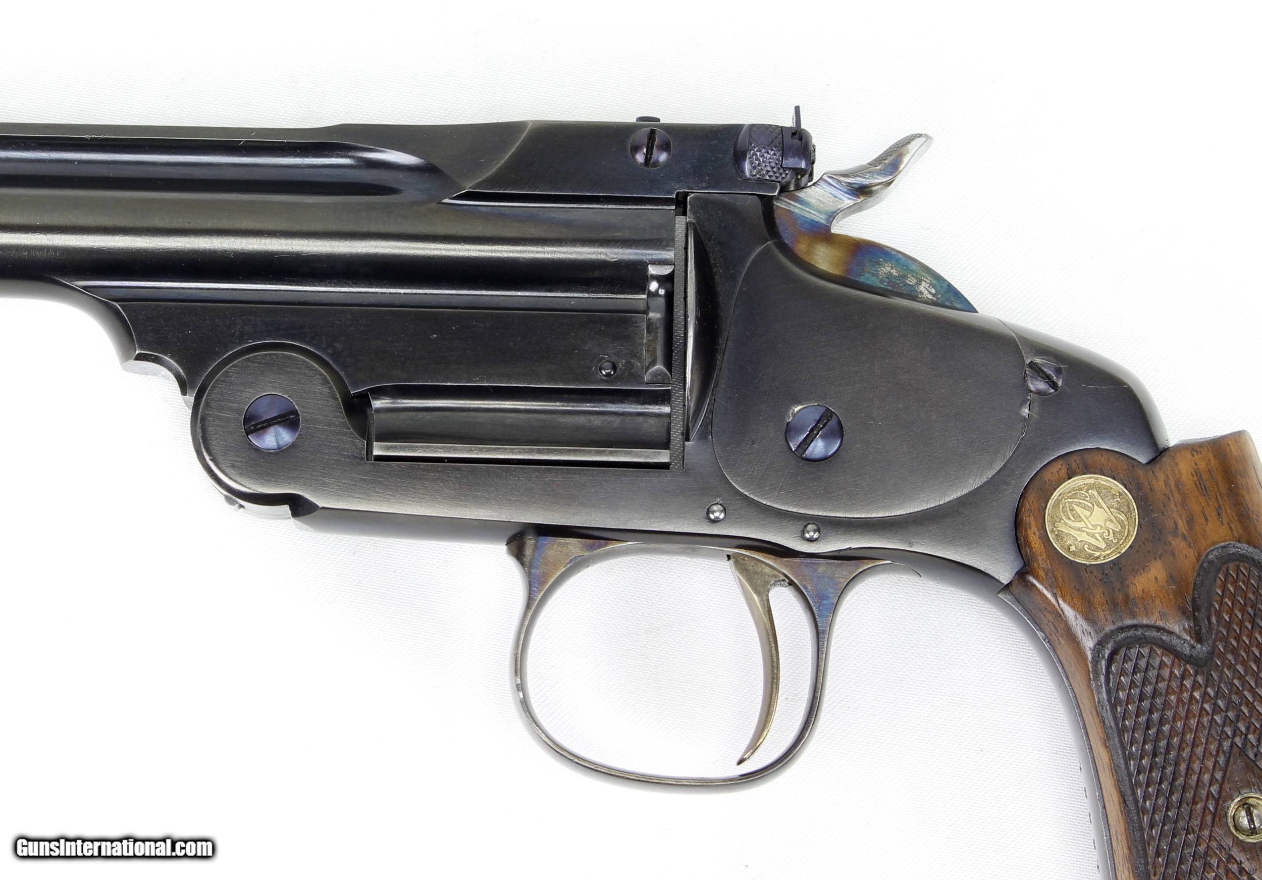 Description: Smith & Wesson Model of 91 Single Shot 1st Model Pistol in .22LR. SN #19521. Mfg. 1893-1905. 10" Barrel with an EXCELLENT Bore for it's age. Factory Straw Colored Trigger. Factory Case Colored Trigger Guard. The Blued Metal Finish has been RESTORED by SHOOTER'S EXCHANGE and LOOKS GREAT. Walnut grips were standard on 3rd Model Pistols as 1st Models came with Hard Rubber Grips. Side Plate on left side of frame. Recoil Shield. Single Action Trigger. ONLY 862 MADE. Weight: 1.46 lbs. Trigger Pull: 2.9 lbs. More photos available upon request. Ships to Lower 48 W/ Insurance $30.00. SOLD Curio/Relic: Yes Handgun Caliber: .22 Long Rifle Manufacturer: Smith & Wesson Model: Model of 91 Serial Number: 19521 Barrel Length: 10 Condition: Excellent Metal Condition: Refinished Wood Condition: Excellent Bore Condition: Excellent for Age Action: Single Shot Finish: Blue Weight: 1.46 lbs. Manufacture Date: 1893-1905 |
