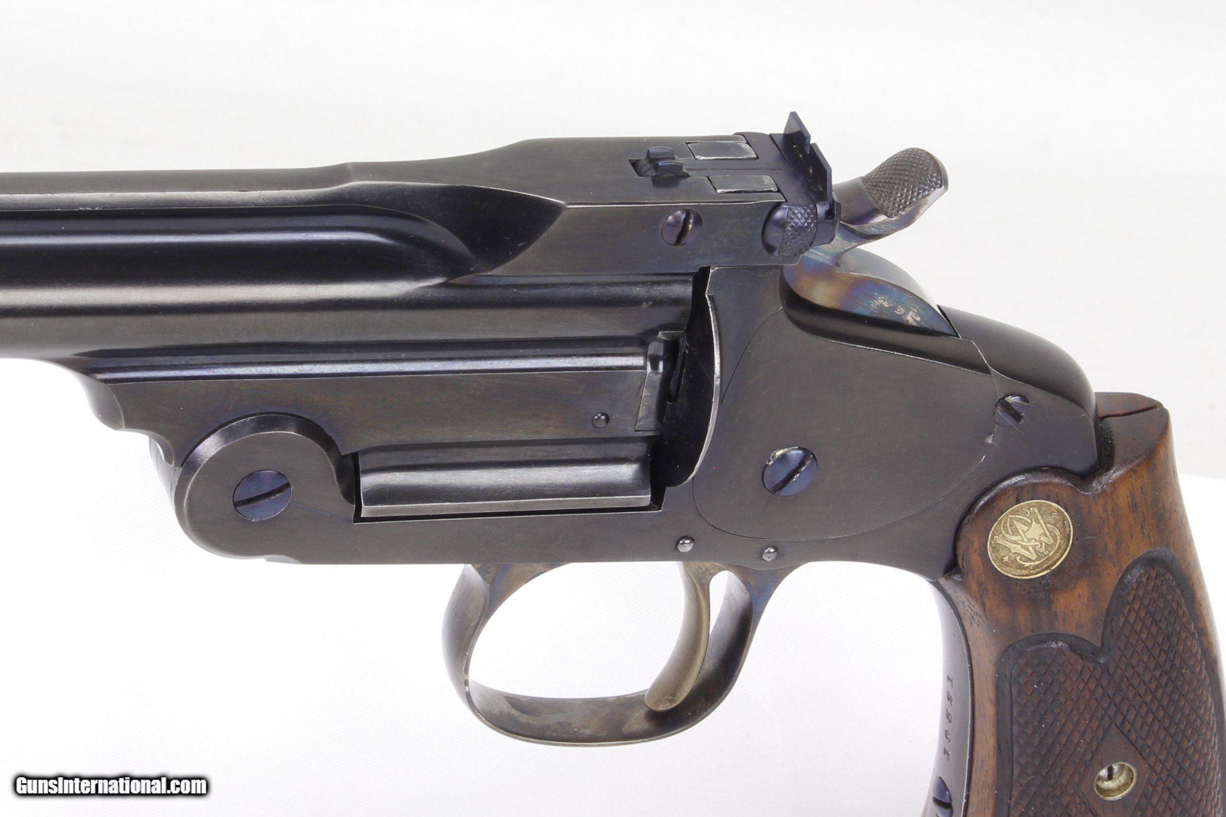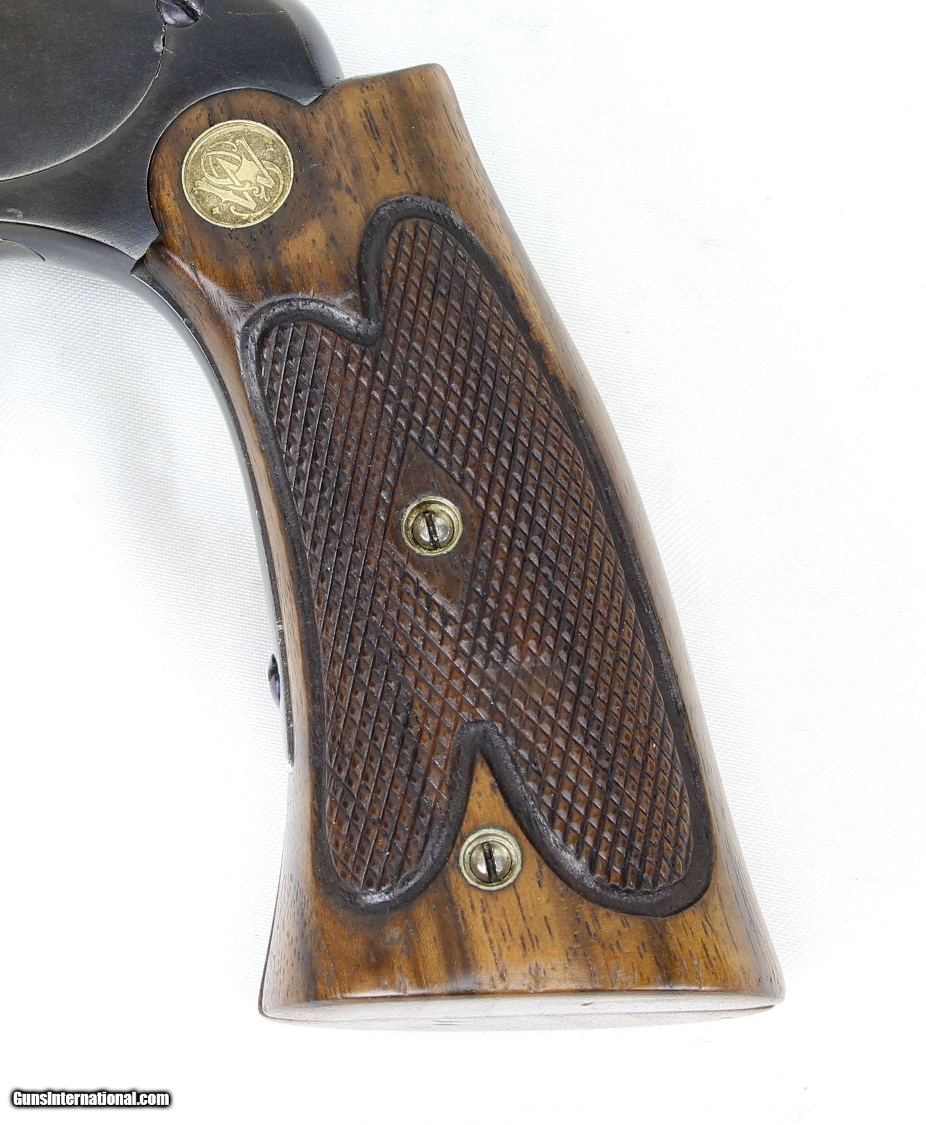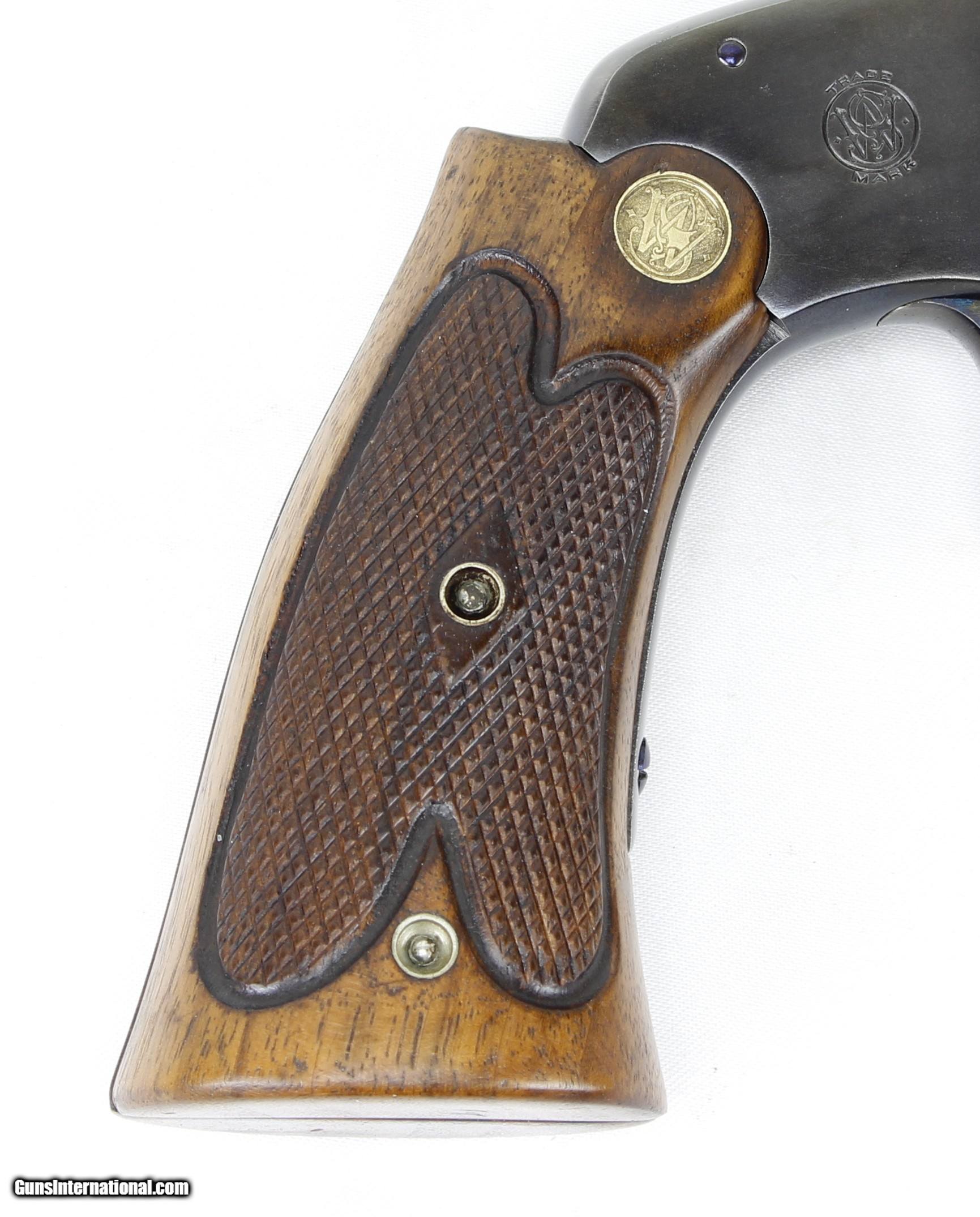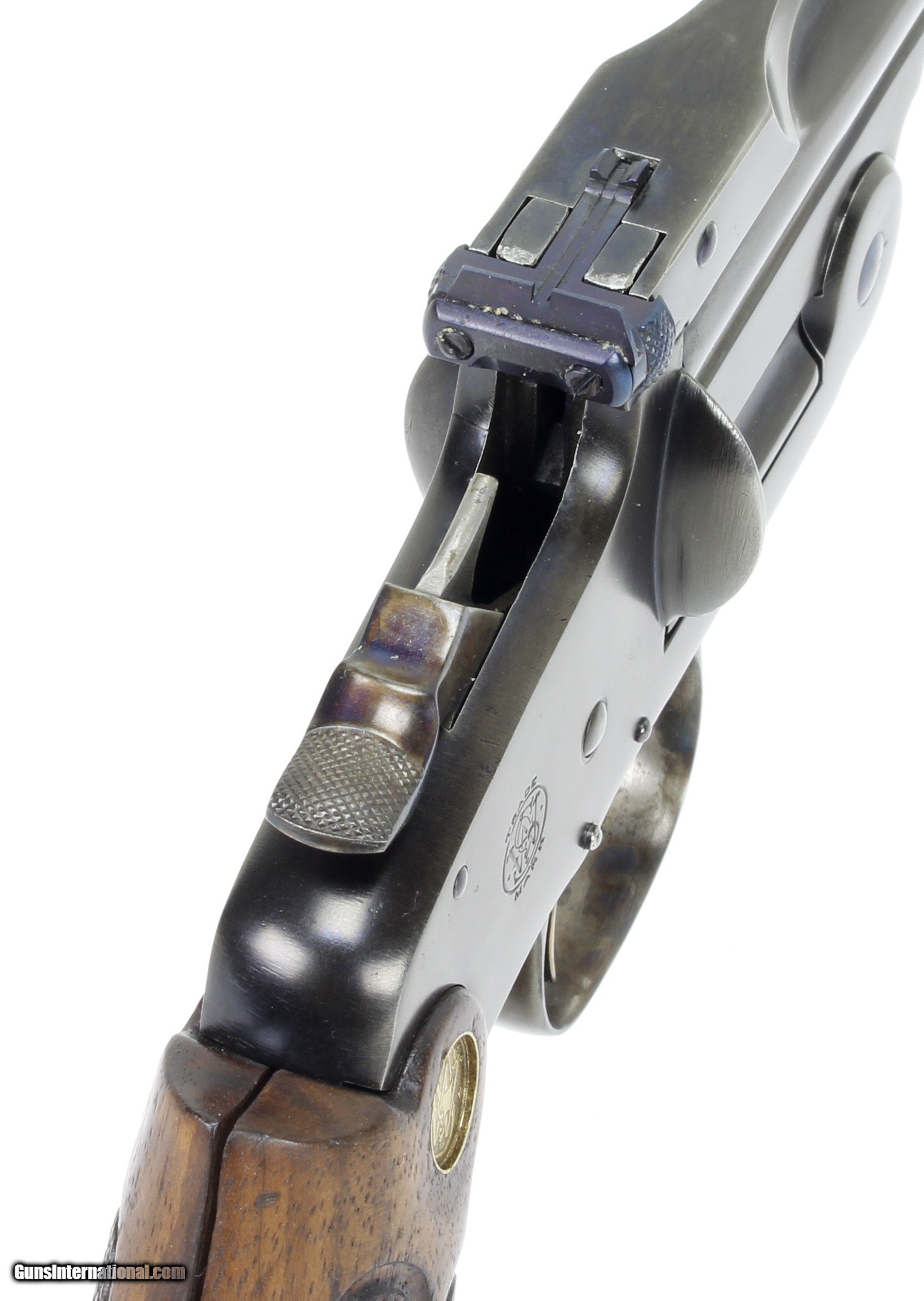 Description: Smith & Wesson Model of 91 Single Shot 1st Model Pistol in .22LR. SN #19521. Mfg. 1893-1905. 10" Barrel with an EXCELLENT Bore for it's age. Factory Straw Colored Trigger. Factory Case Colored Trigger Guard. The Blued Metal Finish has been RESTORED by SHOOTER'S EXCHANGE and LOOKS GREAT. Walnut grips were standard on 3rd Model Pistols as 1st Models came with Hard Rubber Grips. Side Plate on left side of frame. Recoil Shield. Single Action Trigger. ONLY 862 MADE. Weight: 1.46 lbs. Trigger Pull: 2.9 lbs. More photos available upon request. Ships to Lower 48 W/ Insurance $30.00. SOLD Curio/Relic: Yes Handgun Caliber: .22 Long Rifle Manufacturer: Smith & Wesson Model: Model of 91 Serial Number: 19521 Barrel Length: 10 Condition: Excellent Metal Condition: Refinished Wood Condition: Excellent Bore Condition: Excellent for Age Action: Single Shot Finish: Blue Weight: 1.46 lbs. Manufacture Date: 1893-1905 |