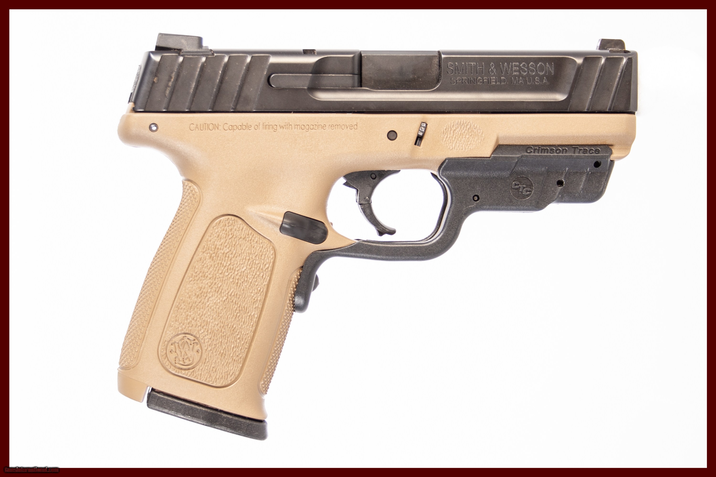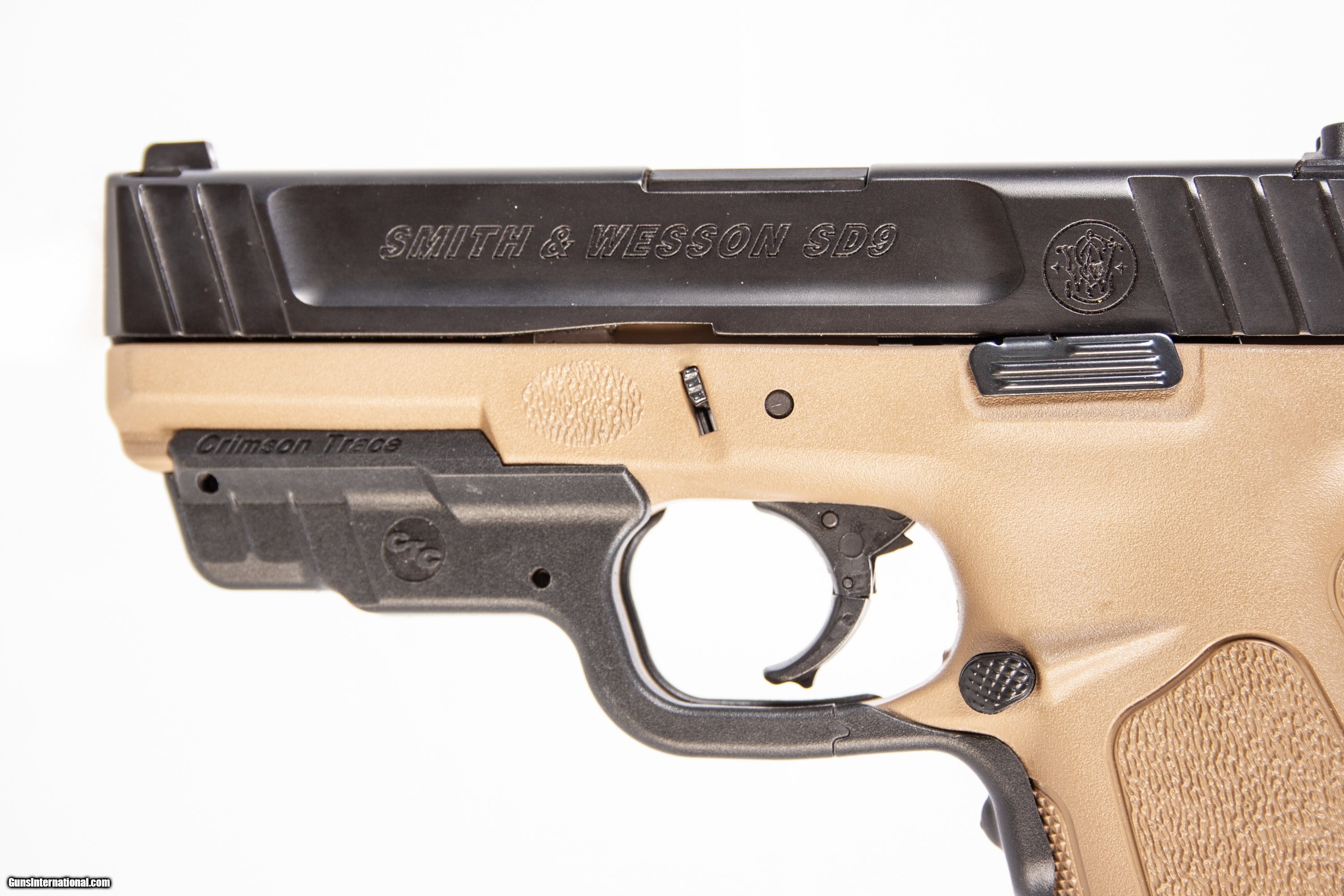 SMITH AND WESSON SD9 CHAMBERED IN 9MM WITH A 4 INCH BARREL BRIGHT BORE GOOD GROOVES BOX EXTRA MAGAZINE AND SOME CRIMSON TRACE LASER GRIPS. THIS GUN IS IN EXCELLENT CONDITION AND IS COVERED BY DURY'S LIFETIME WARRANTY.